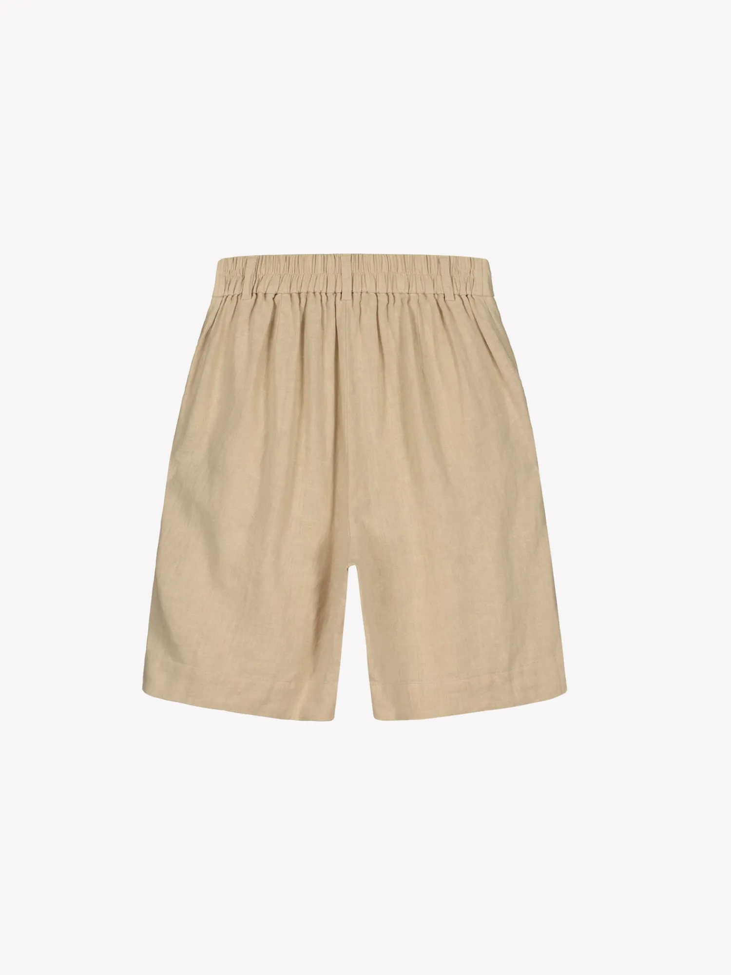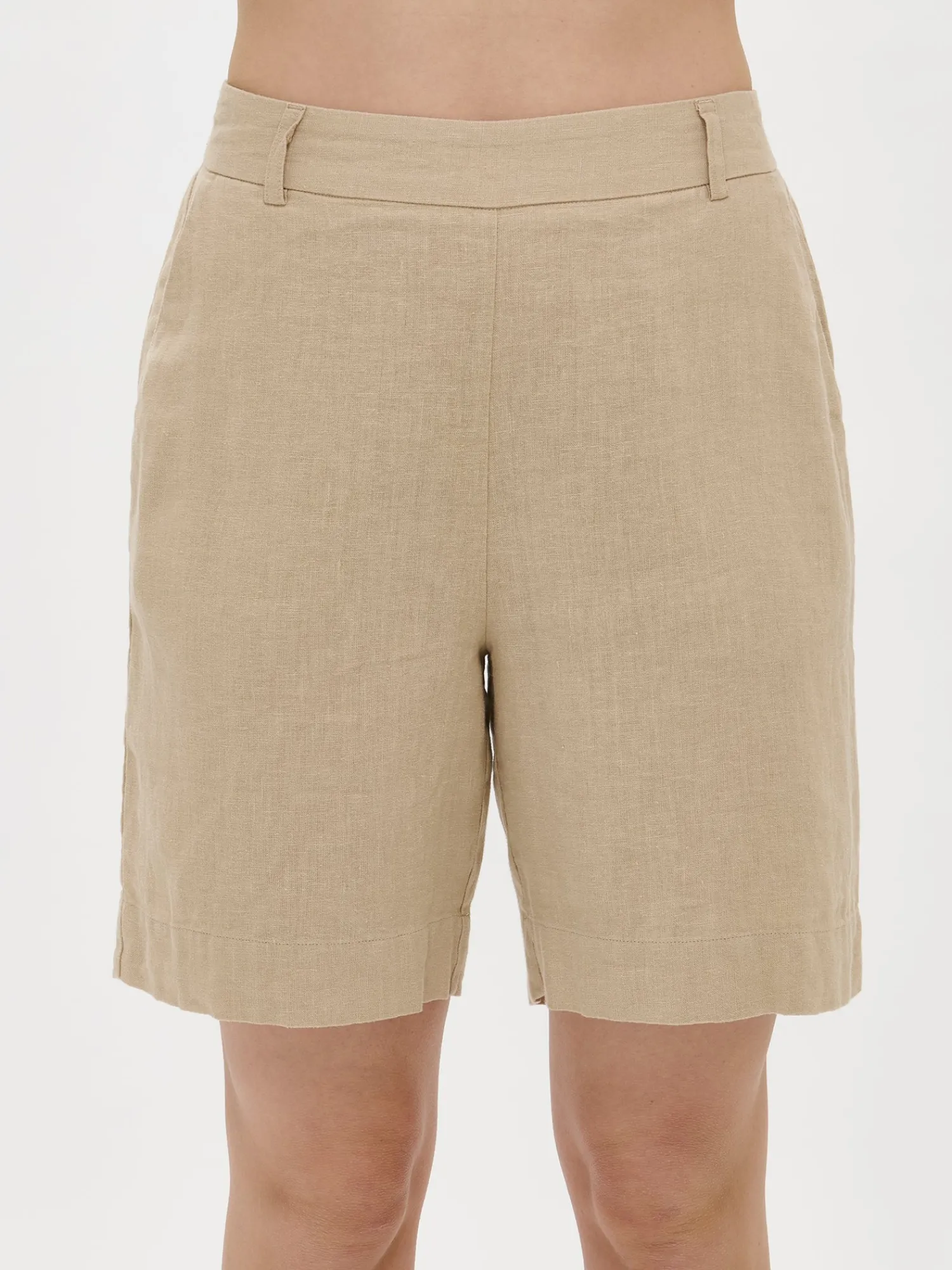 Naisten klassiset beiget Liine-pellavashortsit. Tyylikkäät ja ajattomat pellavashortsit ovat kesän luottovaate. Shortseissa on leveä vyötärökaitale ja takana kuminauha. Shortseissa on sivuissa taskut ja leveä käänne lahkeensuissa. Shortsien lahkeen sisäpituus koossa 38 on noin 24 cm. Materiaali on kudottua pellavakangasta, joka on kestävää ja hengittävää. Pellavalle on ominaista luonnollinen pieni rypistyminen. Tuote on esipesty tuotannossa, joten se ei kutistu ensimmäisessä pesussa.