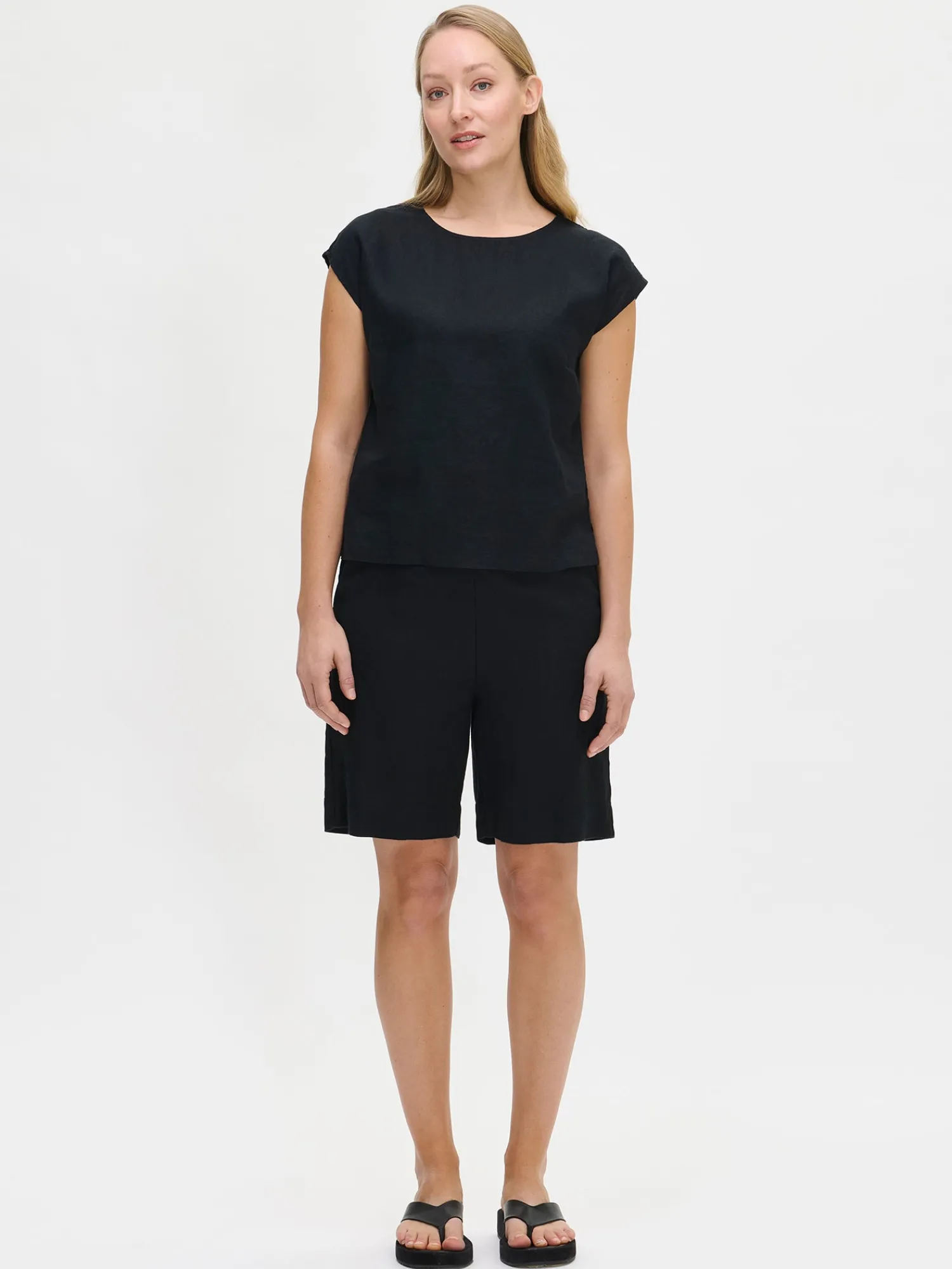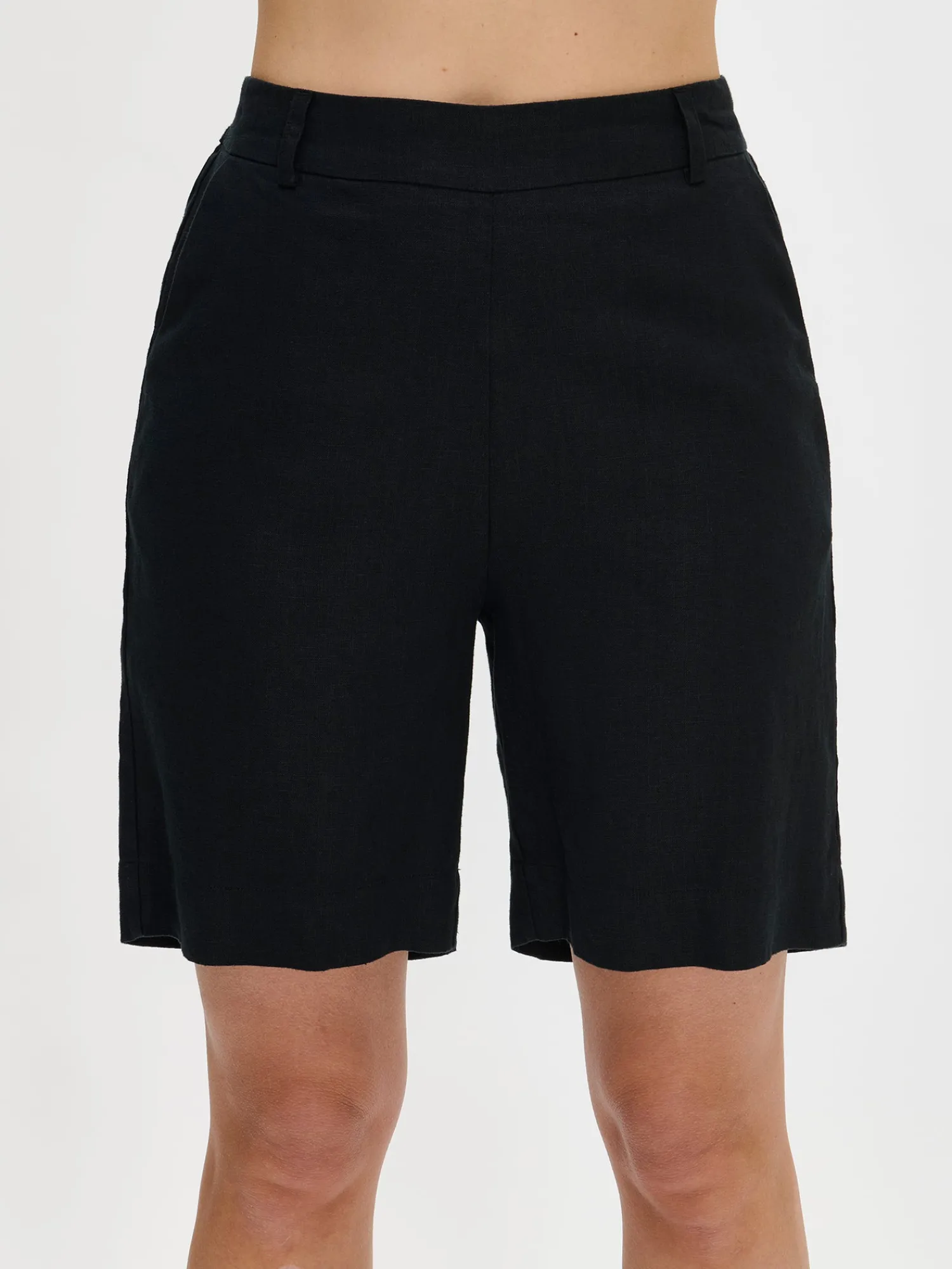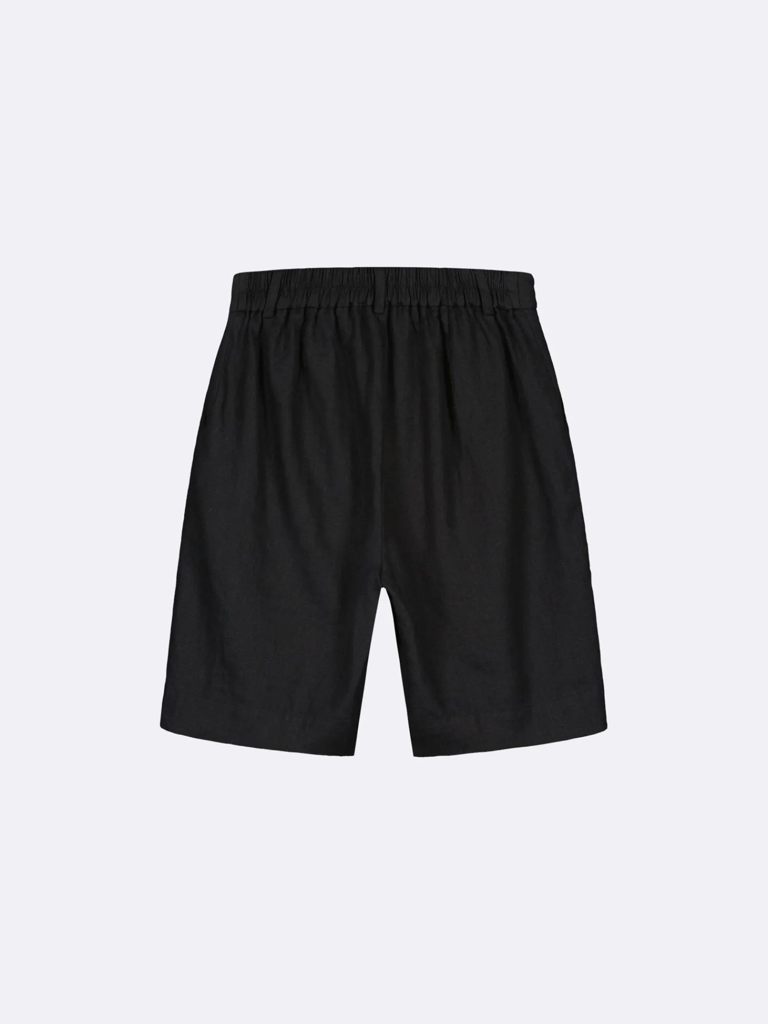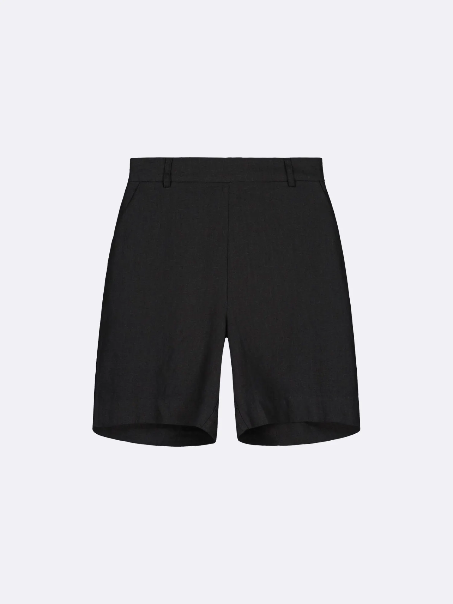 Naisten klassiset mustat Liine-pellavashortsit. Tyylikkäät ja ajattomat pellavashortsit ovat kesän luottovaate. Shortseissa on leveä vyötärökaitale ja takana kuminauha. Shortseissa on sivuissa taskut ja leveä käänne lahkeensuissa. Shortsien lahkeen sisäpituus koossa 38 on noin 24 cm. Materiaali on kudottua pellavakangasta, joka on kestävää ja hengittävää. Pellavalle on ominaista luonnollinen pieni rypistyminen. Tuote on esipesty tuotannossa, joten se ei kutistu ensimmäisessä pesussa.