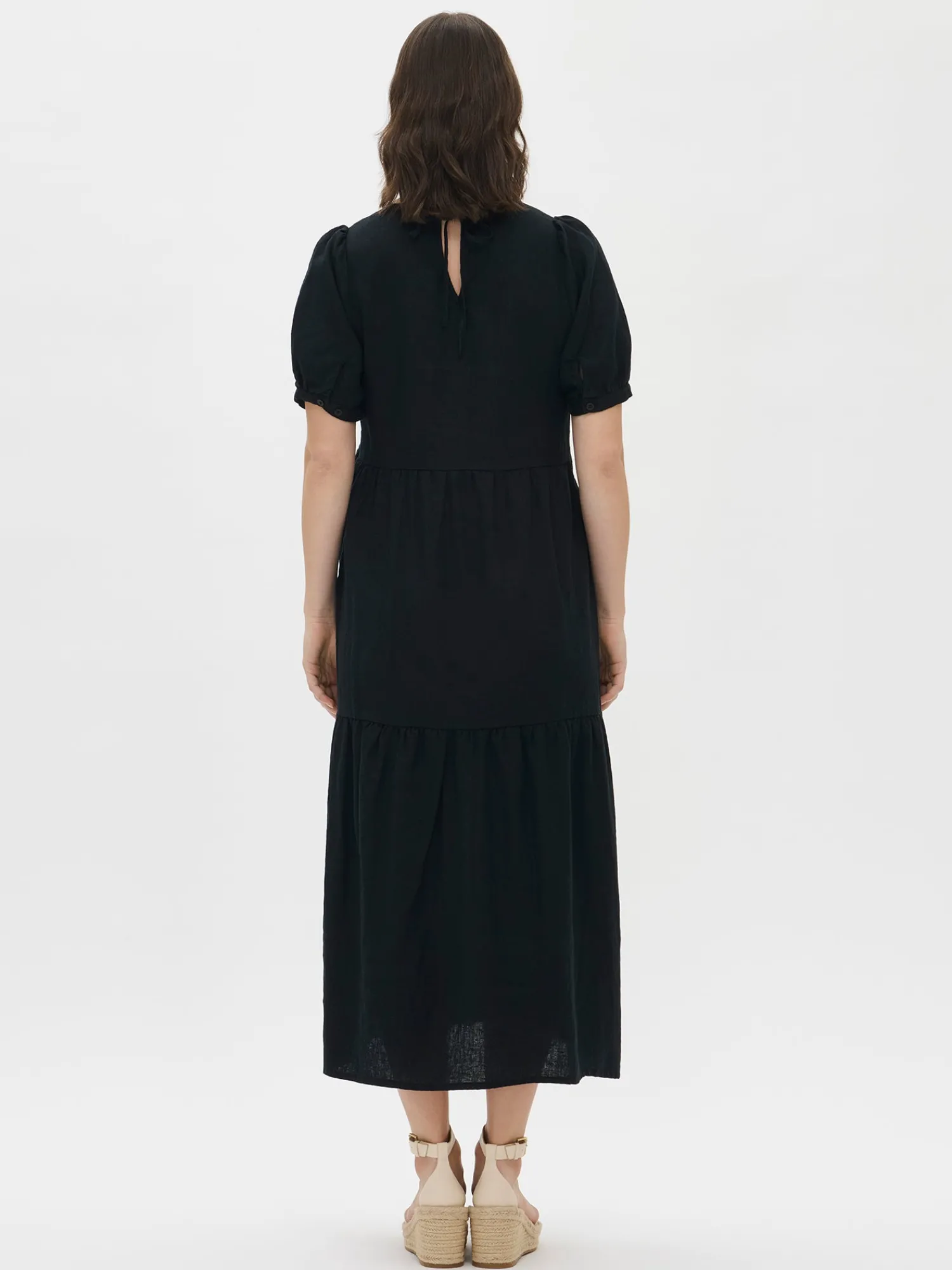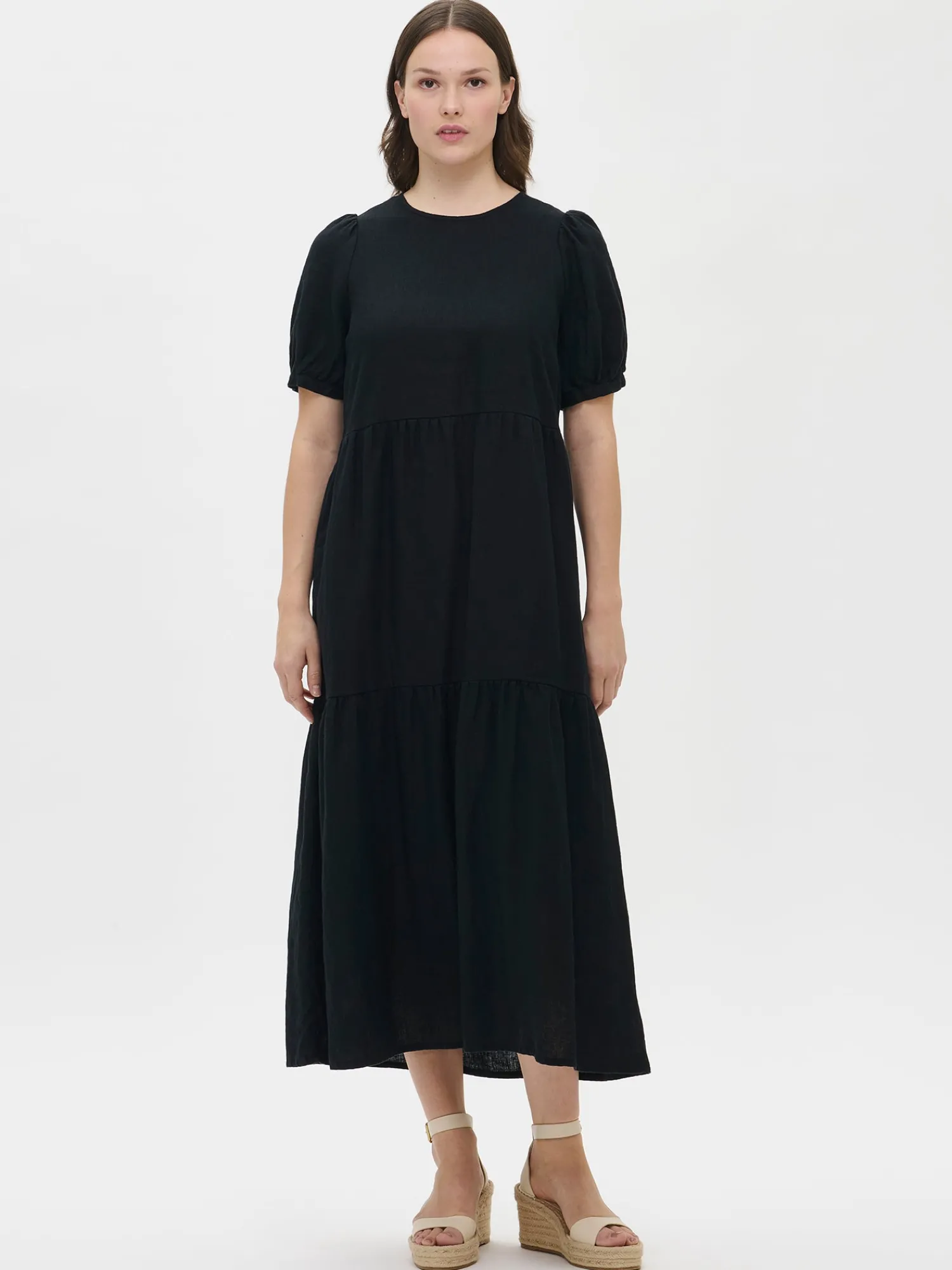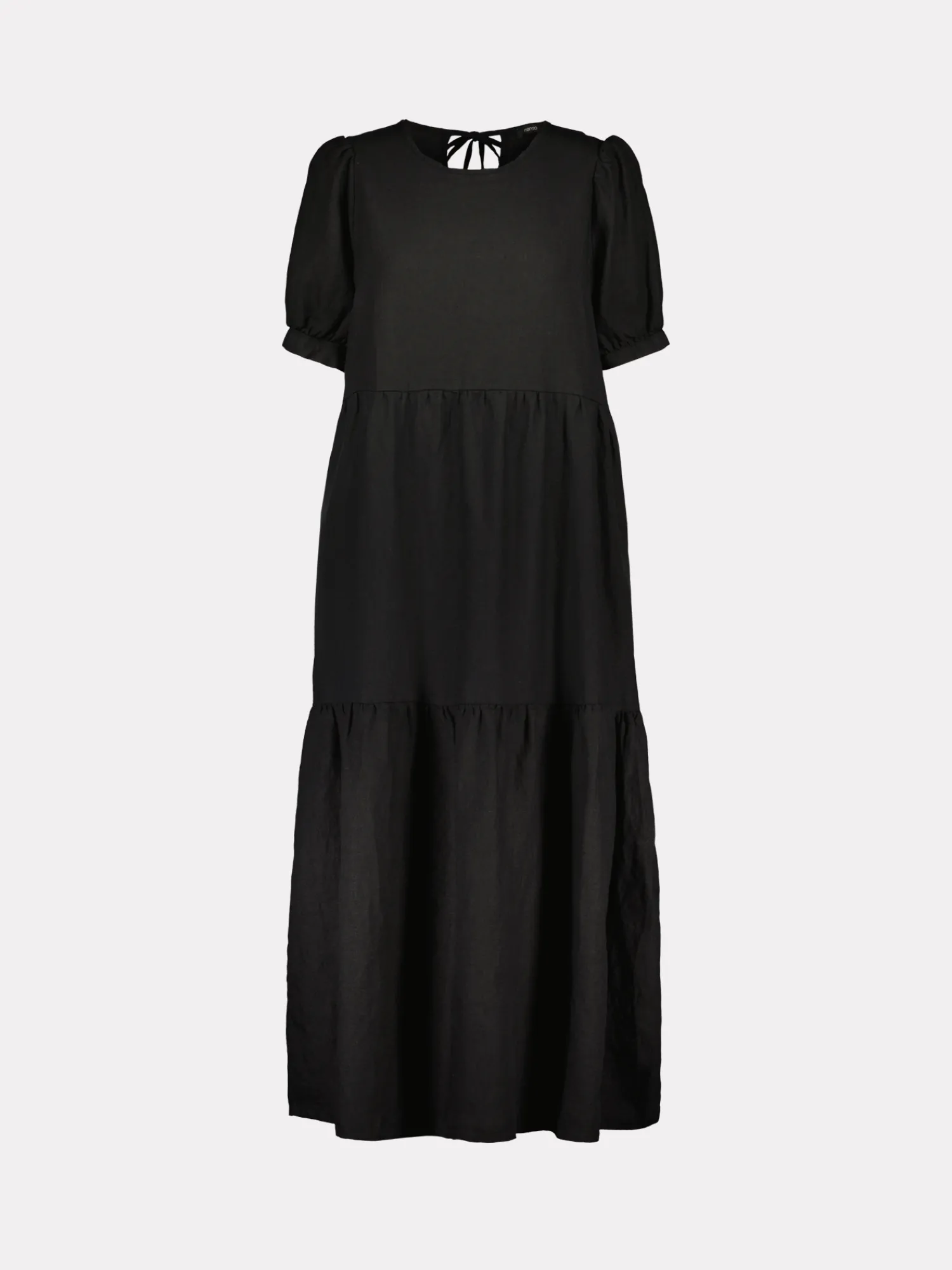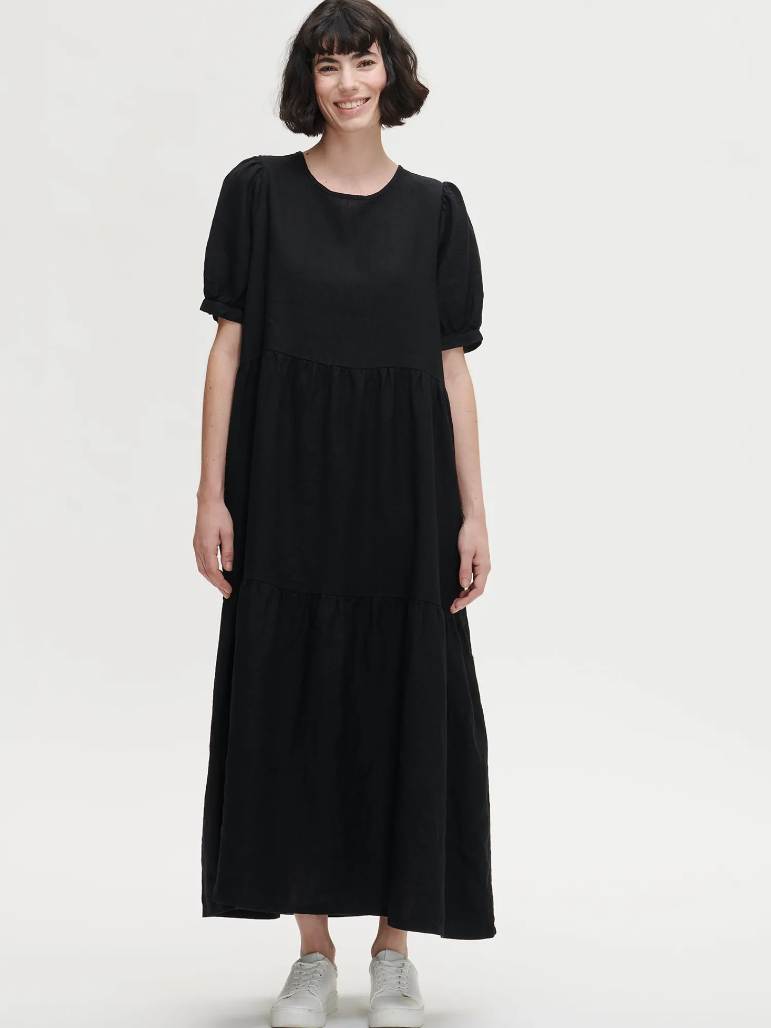 Naisten kaunis musta Sarastus-pellavamekko volyymisilla frillakerroksilla ja lyhyillä puhvihihoilla, joissa on napit säätövaralla. Tyylikäs ja rento Sarastus-pellavamekko on kesän kestosuosikki vuodesta toiseen. Mekossa on sivutaskut, pyöreä pääntie sekä niskassa pieni halkio ja solmittavat nyörit. Pellavamekon pituus koossa M on noin 130 cm. Materiaali kudottua pellavakangasta, joka on kestävää ja hengittävää. Pellavalle on ominaista luonnollinen pieni rypistyminen. Tuote on esipesty tuotannossa, joten se ei kutistu ensimmäisessä pesussa.