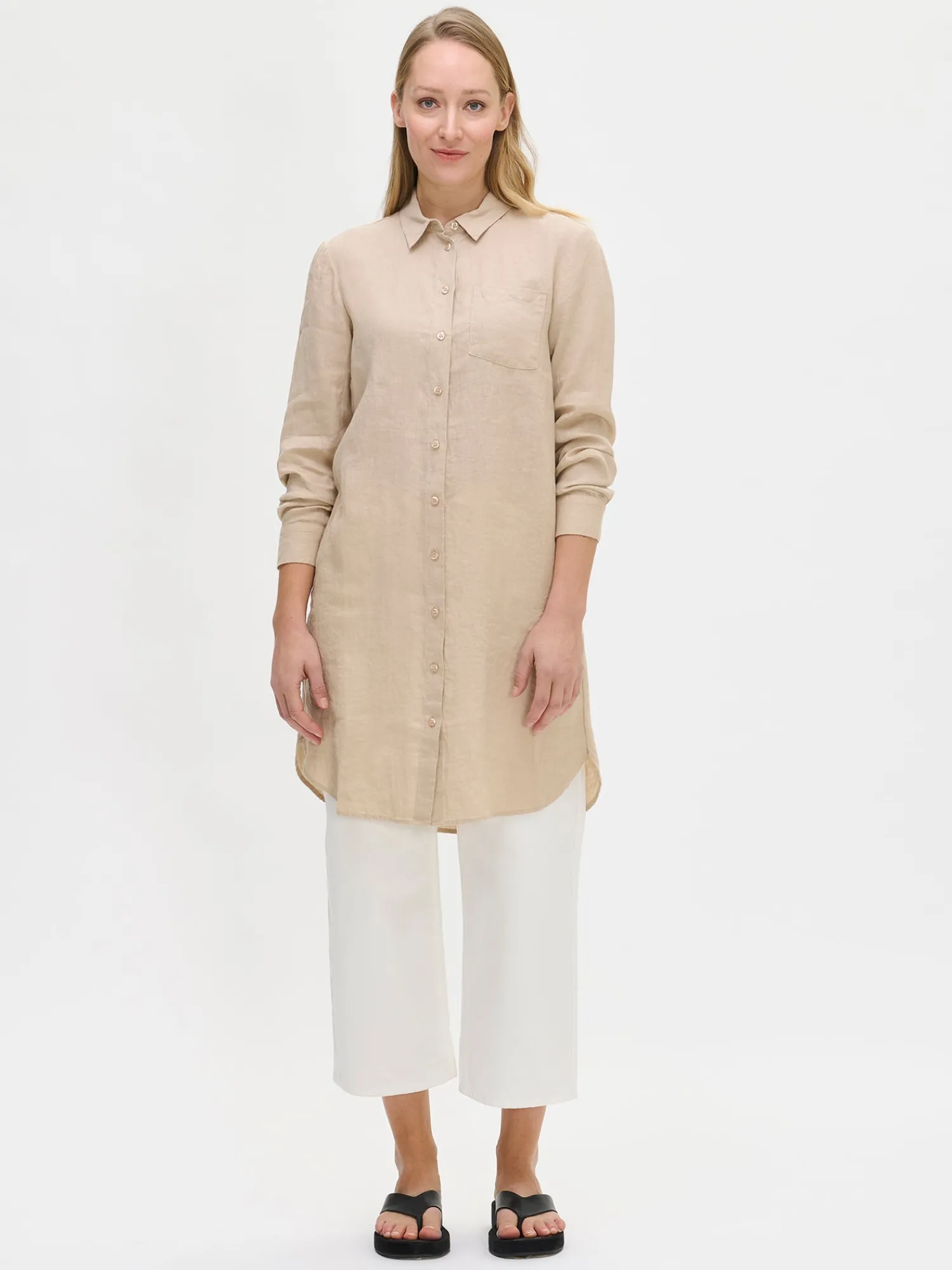 Naisten rento ja pitkä beige Pellava-paitapusero. Klassinen pitkä kauluspaita sopii niin arkeen kuin juhlaan. Tyylikäs pitkähihainen paitapusero on kesän monipuolinen luottovaate – voit pukea sen sekä mekkona, että pitkänä paitapuserona housujen kanssa. Pellavapuserossa on napit edessä ja rintatasku. Pitkä paidan pituus koossa 38 on noin 95 cm. Materiaali on kudottua pellavakangasta, joka on kestävää ja hengittävää. Pellavalle on ominaista luonnollinen pieni rypistyminen. Tuote on esipesty tuotannossa, joten se ei kutistu ensimmäisessä pesussa.