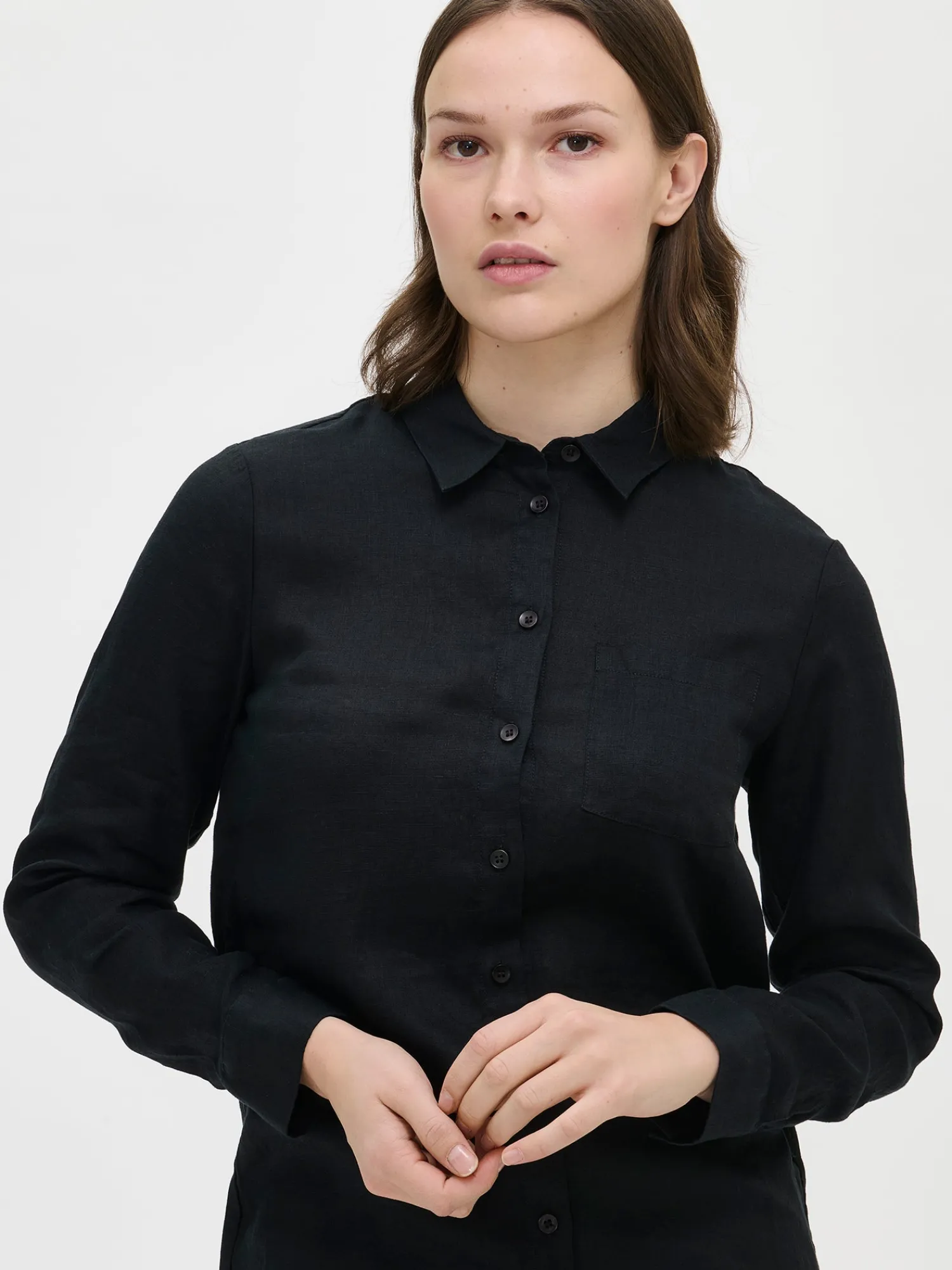 Naisten rento ja pitkä musta Pellava-paitapusero. Klassinen pitkä kauluspaita sopii niin arkeen kuin juhlaan. Tyylikäs pitkähihainen paitapusero on kesän monipuolinen luottovaate – voit pukea sen sekä mekkona, että pitkänä paitapuserona housujen kanssa. Pellavapuserossa on napit edessä ja rintatasku. Pitkä paidan pituus koossa 38 on noin 95 cm. Materiaali on kudottua pellavakangasta, joka on kestävää ja hengittävää. Pellavalle on ominaista luonnollinen pieni rypistyminen. Tuote on esipesty tuotannossa, joten se ei kutistu ensimmäisessä pesussa.