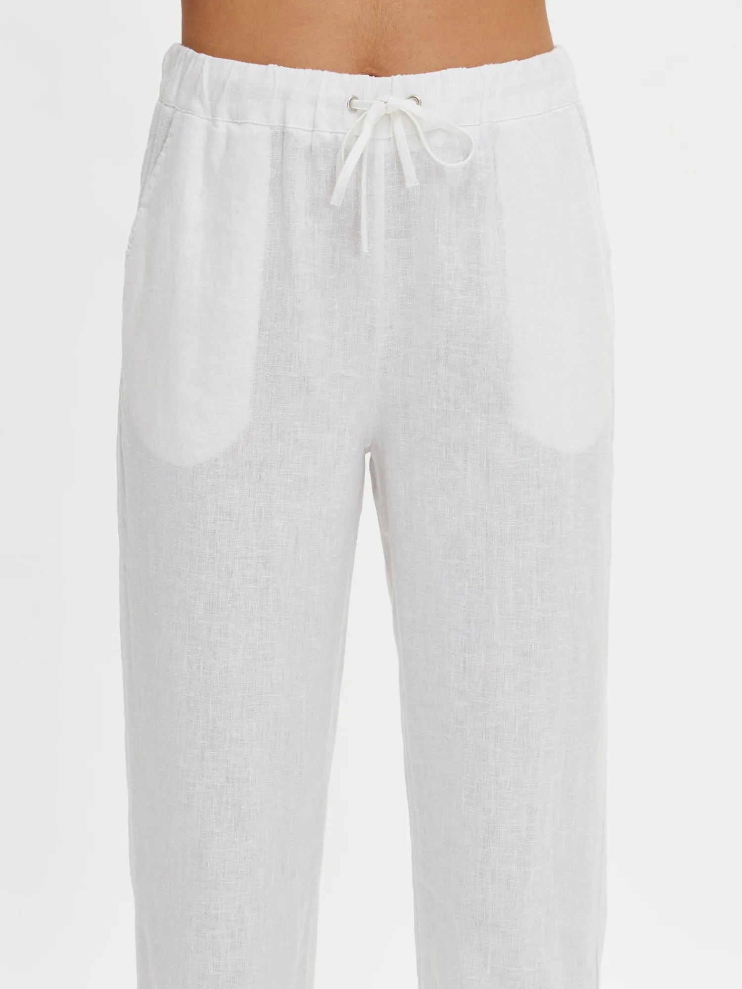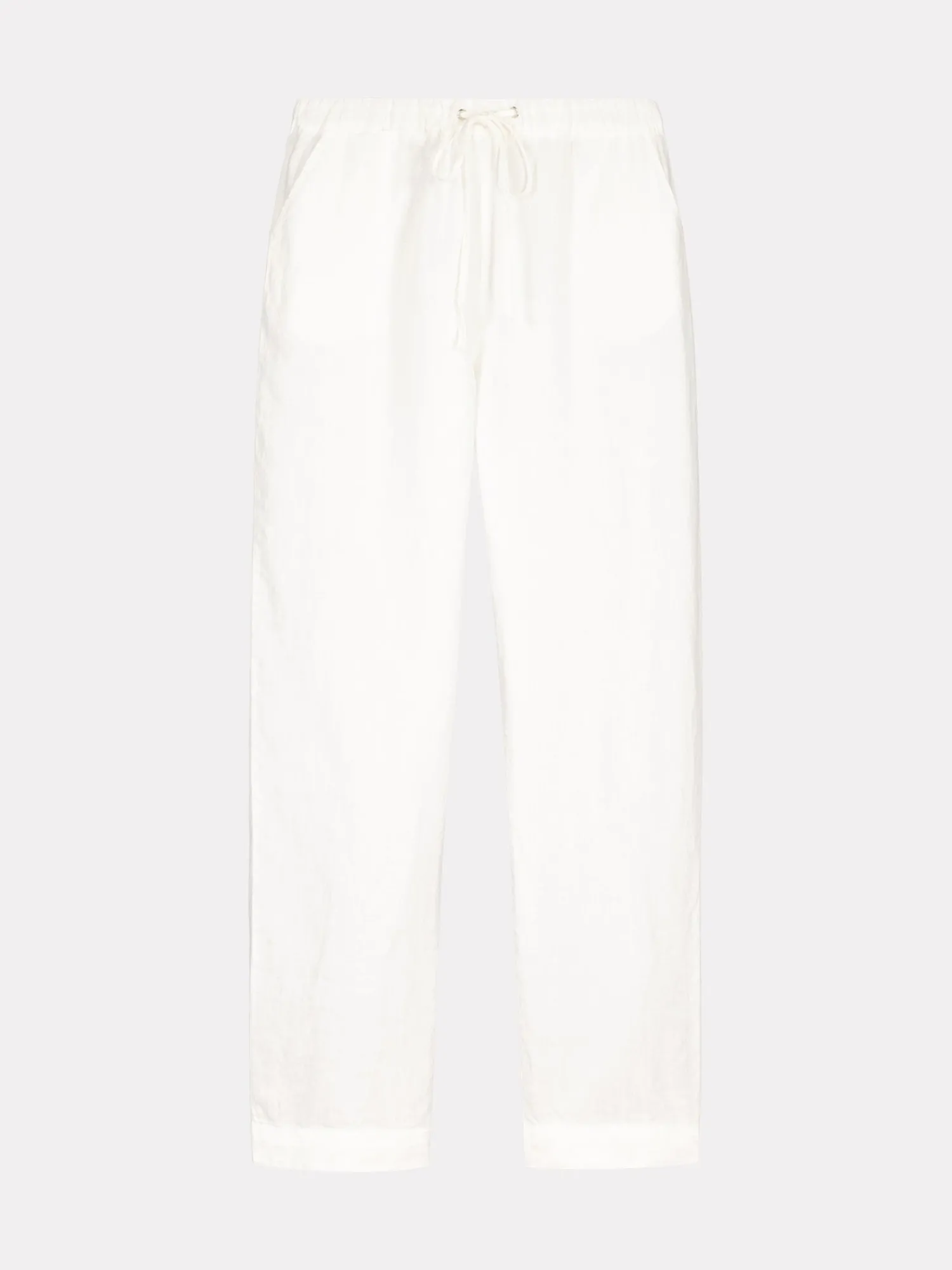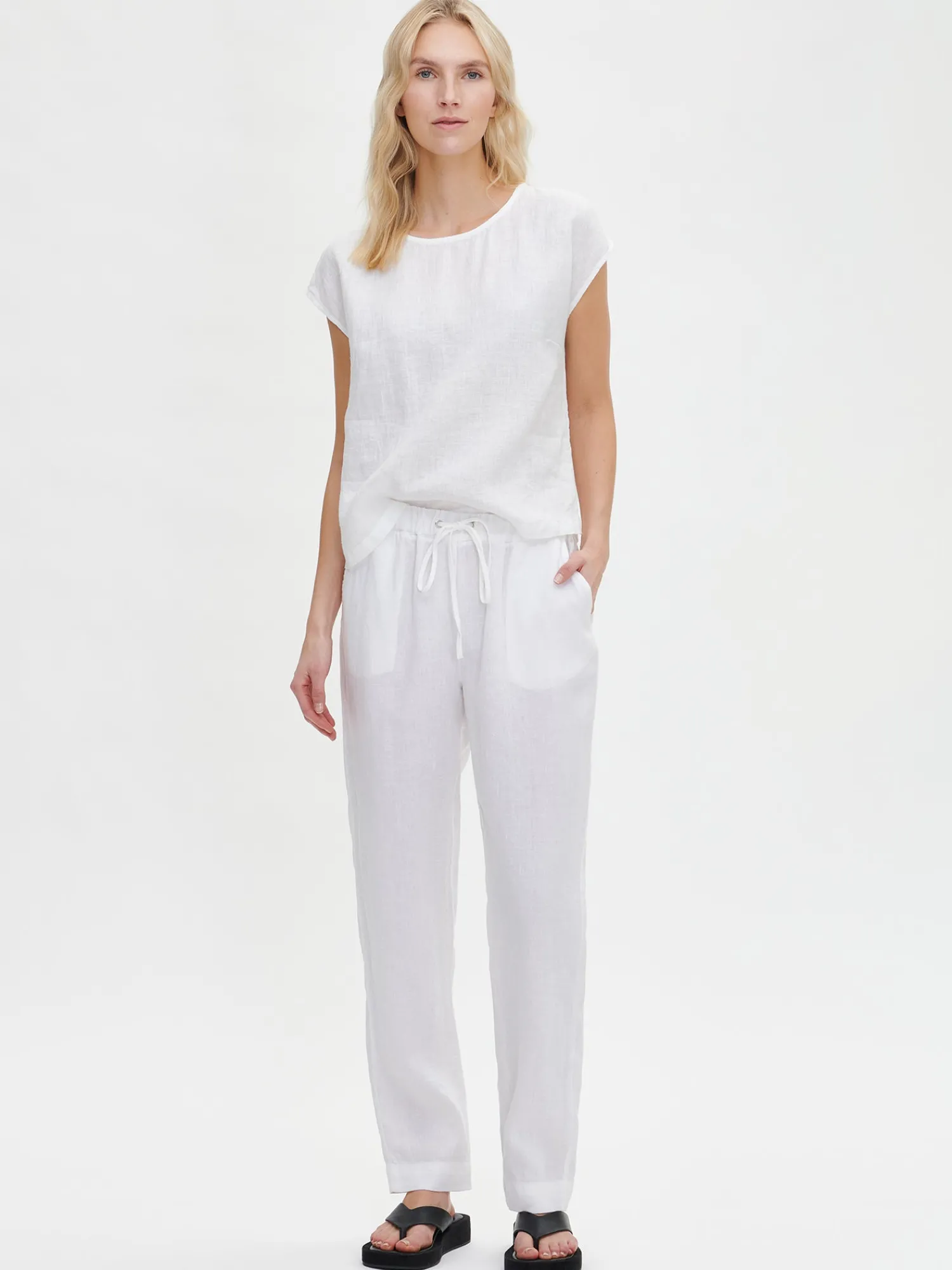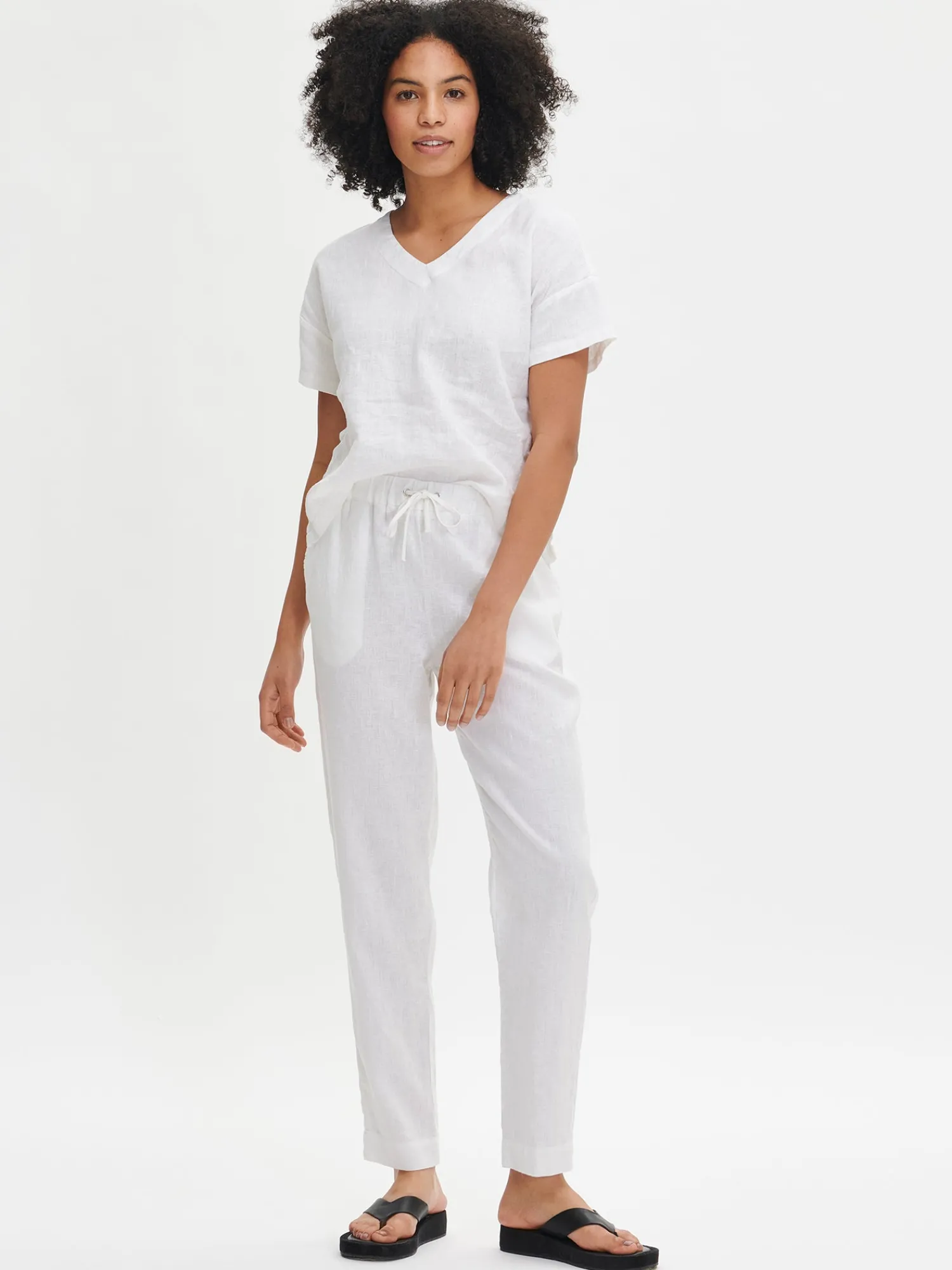 Naisten ihastuttavat valkoiset Sarastus-pellavahousut. Rennoissa, klassisissa pellavahousuissa on vyötäröllä nauhakujassa kuminauha ja kiristysnyöri. Housuissa on sivutaskut. Lahkeiden sisäpituus koossa M on noin 76 cm. Materiaali kudottua pellavakangasta, joka on kestävää ja hengittävää. Pellavalle on ominaista luonnollinen pieni rypistyminen. Tuote on esipesty tuotannossa, joten se ei kutistu ensimmäisessä pesussa.