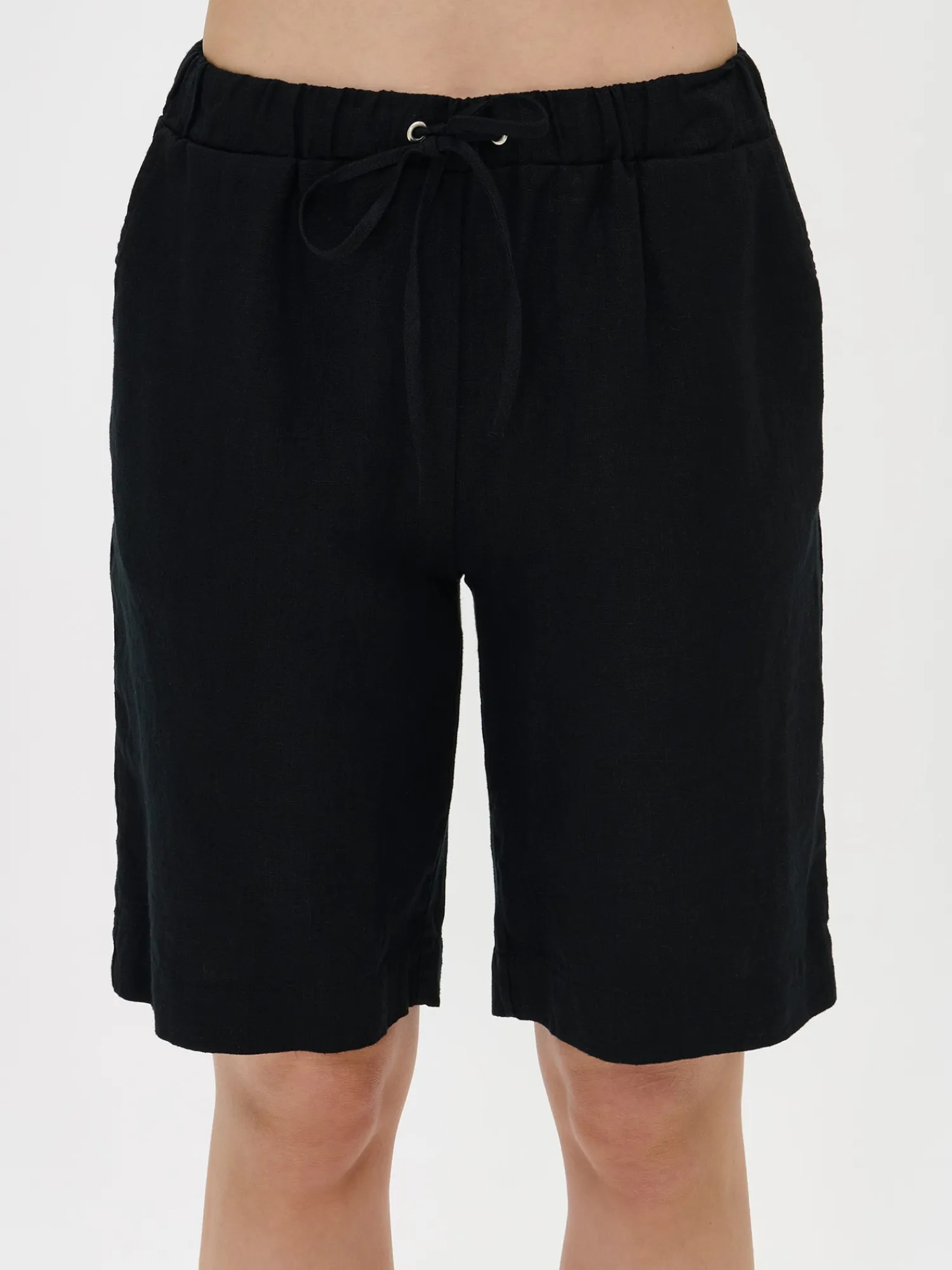 Naisten ihastuttavat mustat Sarastus-shortsit. Rennoissa, klassisissa pellavashortseissa on vyötäröllä nauhakujassa kuminauha ja kiristysnyöri. Shortseissa on sivutaskut. Lahkeiden sisäpituus koossa M on noin 28 cm. Materiaali kudottua pellavakangasta, joka on kestävää ja hengittävää. Pellavan rento mukavuus tekee shortseista täydellisen valinnan kiireettömiin hetkiin kotona ja kesäiseen oleiluun. Pellavalle on ominaista luonnollinen pieni rypistyminen. Tuote on esipesty tuotannossa, joten se ei kutistu ensimmäisessä pesussa.