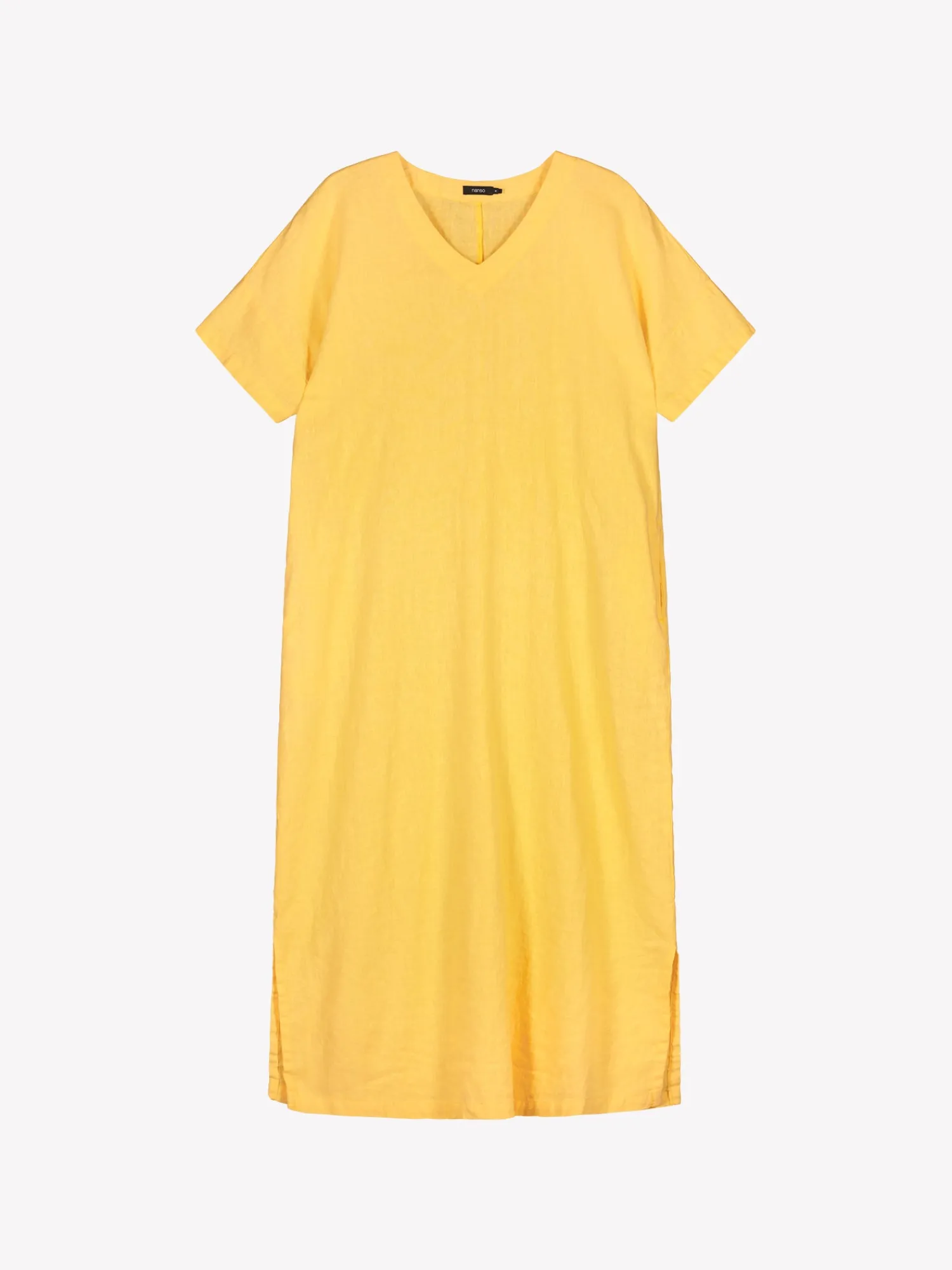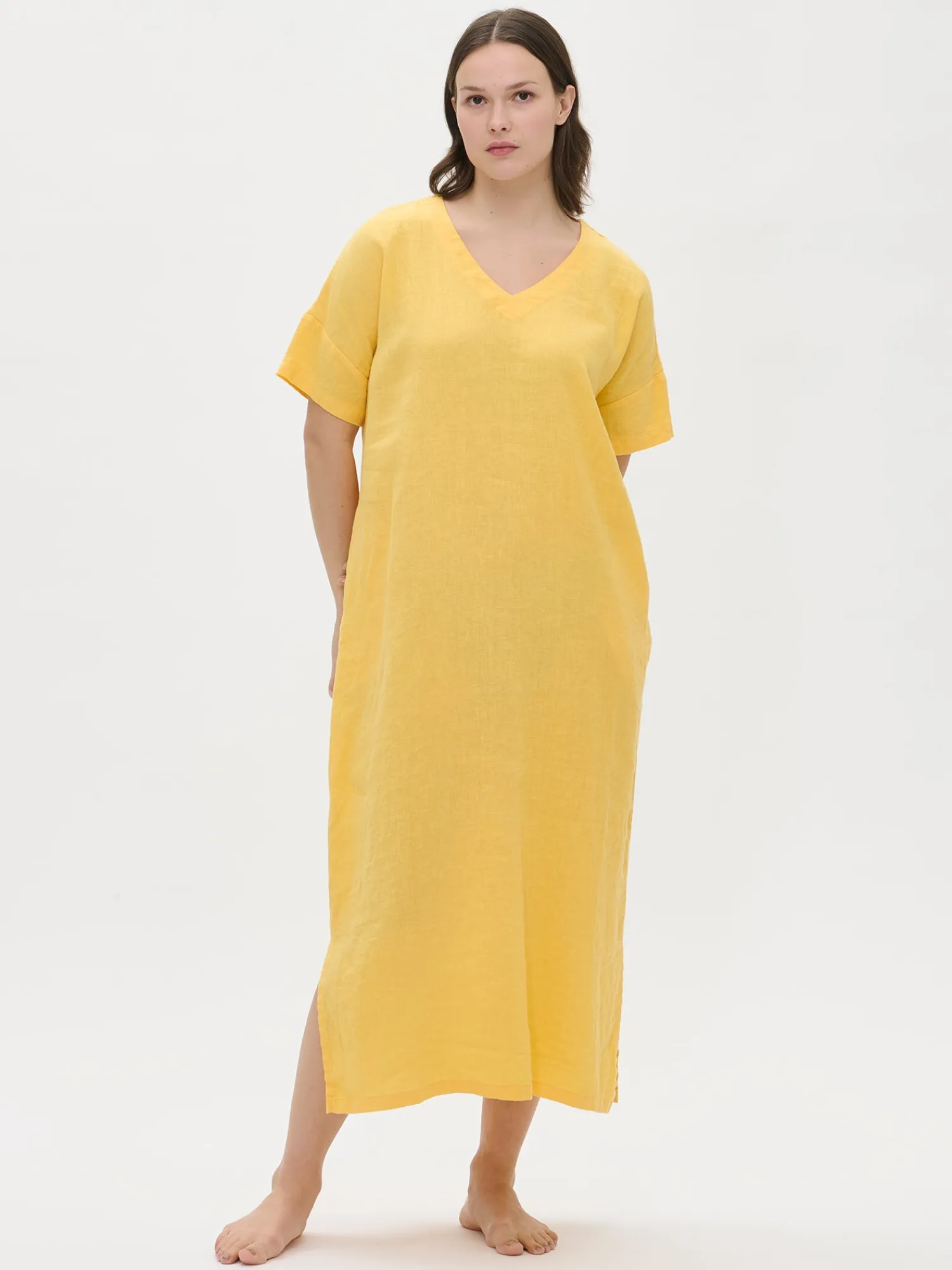 Naisten rento keltainen suoralinjainen Sarastus-pellavamekko sivuhalkioilla. Lyhythihaisessa kaftaanissa on V-pääntie ja sivutaskut. Mekon pituus koossa M on noin 130 cm. Materiaali kudottua pellavakangasta, joka on kestävää ja hengittävää. Pellavan kevyt ja viileä tuntu tekevät mekosta täydellisen valinnan rentoihin kesäpäiviin ja kiireettömiin hetkiin kotona. Pellavalle on ominaista luonnollinen pieni rypistyminen. Tuote on esipesty tuotannossa, joten se ei kutistu ensimmäisessä pesussa.