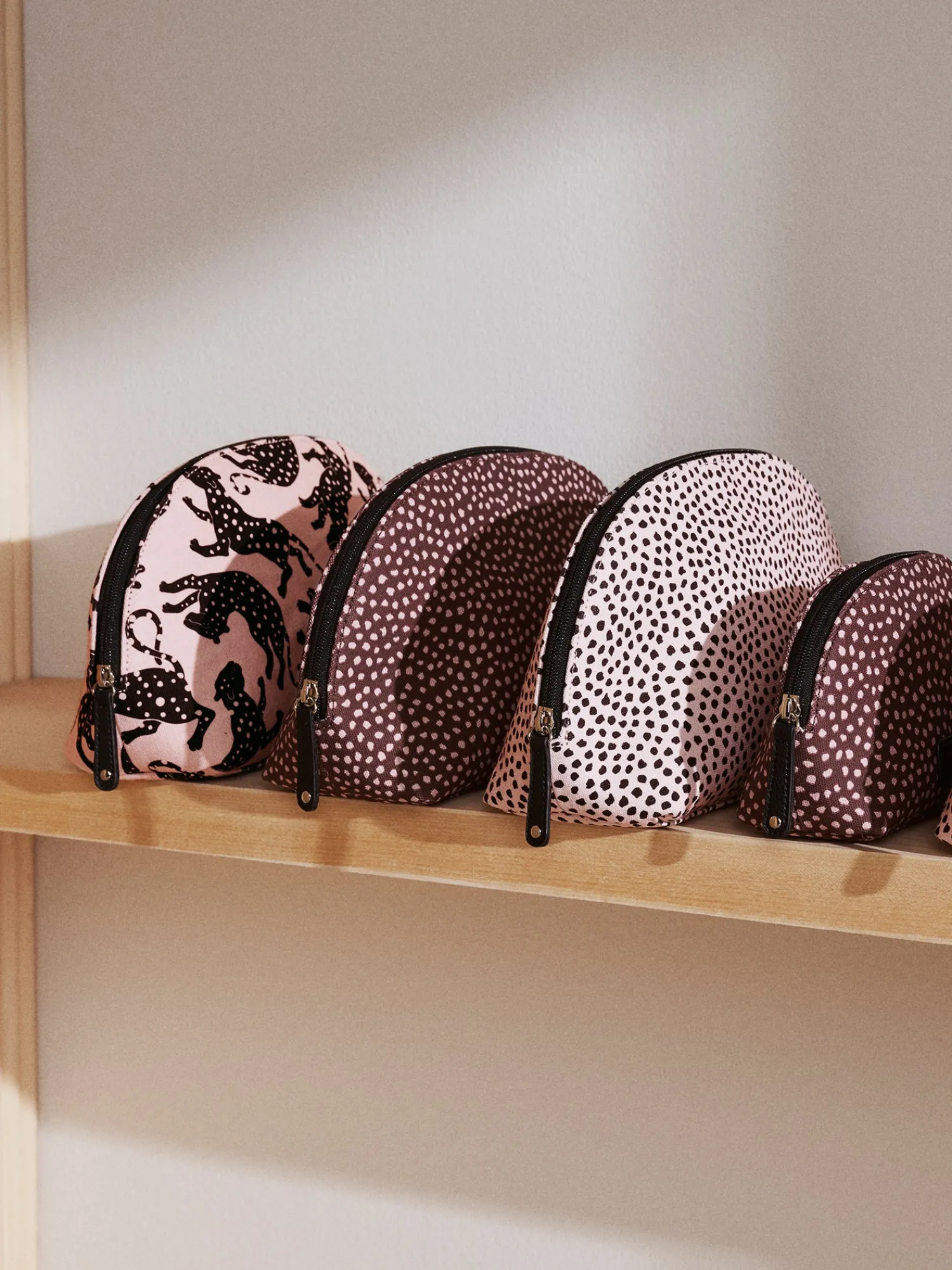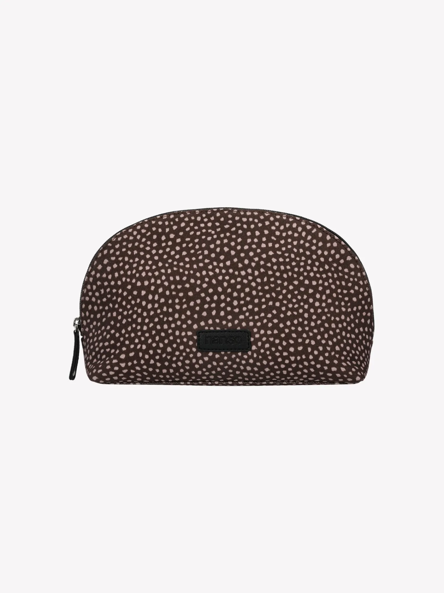 Nanson punaruskea Muru-kosmetiikkalaukku ihastuttavalla sirolla pilkkukuviolla. Muru-meikkipussin päällinen on jämäkkää puuvillaviskoosikangasta ja sisäpuolella on yksivärinen polyestervuorikangas. Kosmetiikkalaukun sisäpuolella on tasku ja päällä vetoketju. Kosmetiikkalaukun koko on noin 25 x 17 x 10 cm.