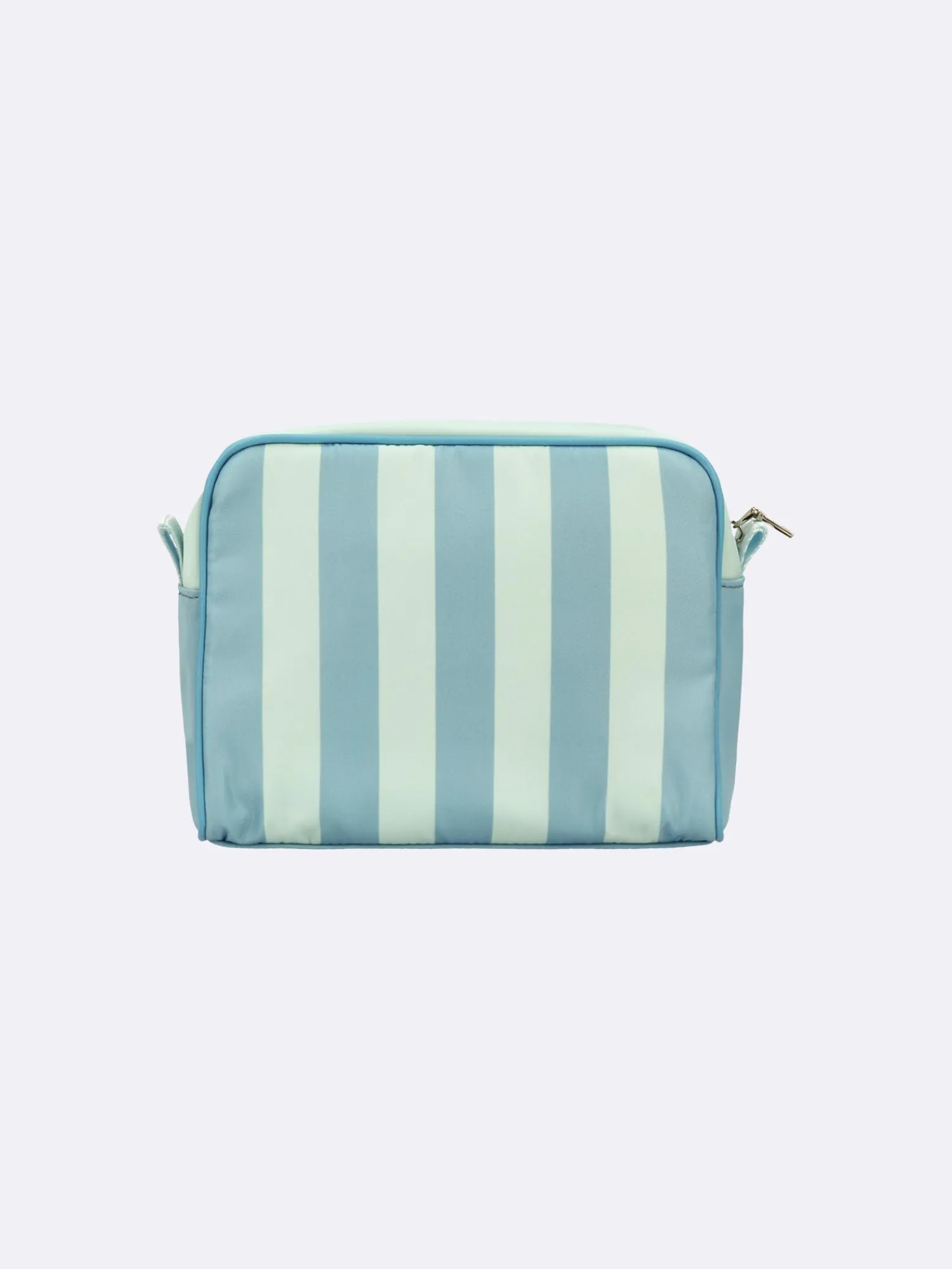 Raidallisen vaaleansinisen Tie -kosmetiikkalaukun päällinen on kestävää polyamidikangasta ja laukun sisäpuolella on likaahylkivä polyesterivuori. Sisäpuolella on kaksi avotaskua. Päällä on metallinen vetoketju. Kosmetiikkalaukun koko on noin 20 cm x 16 cm x 8 cm.
