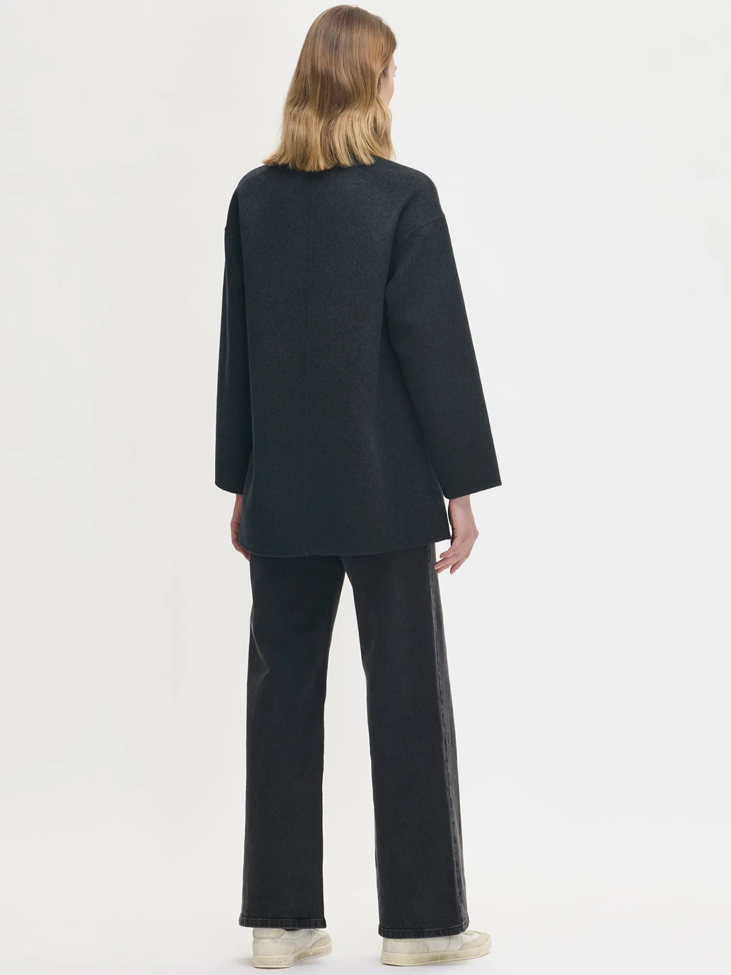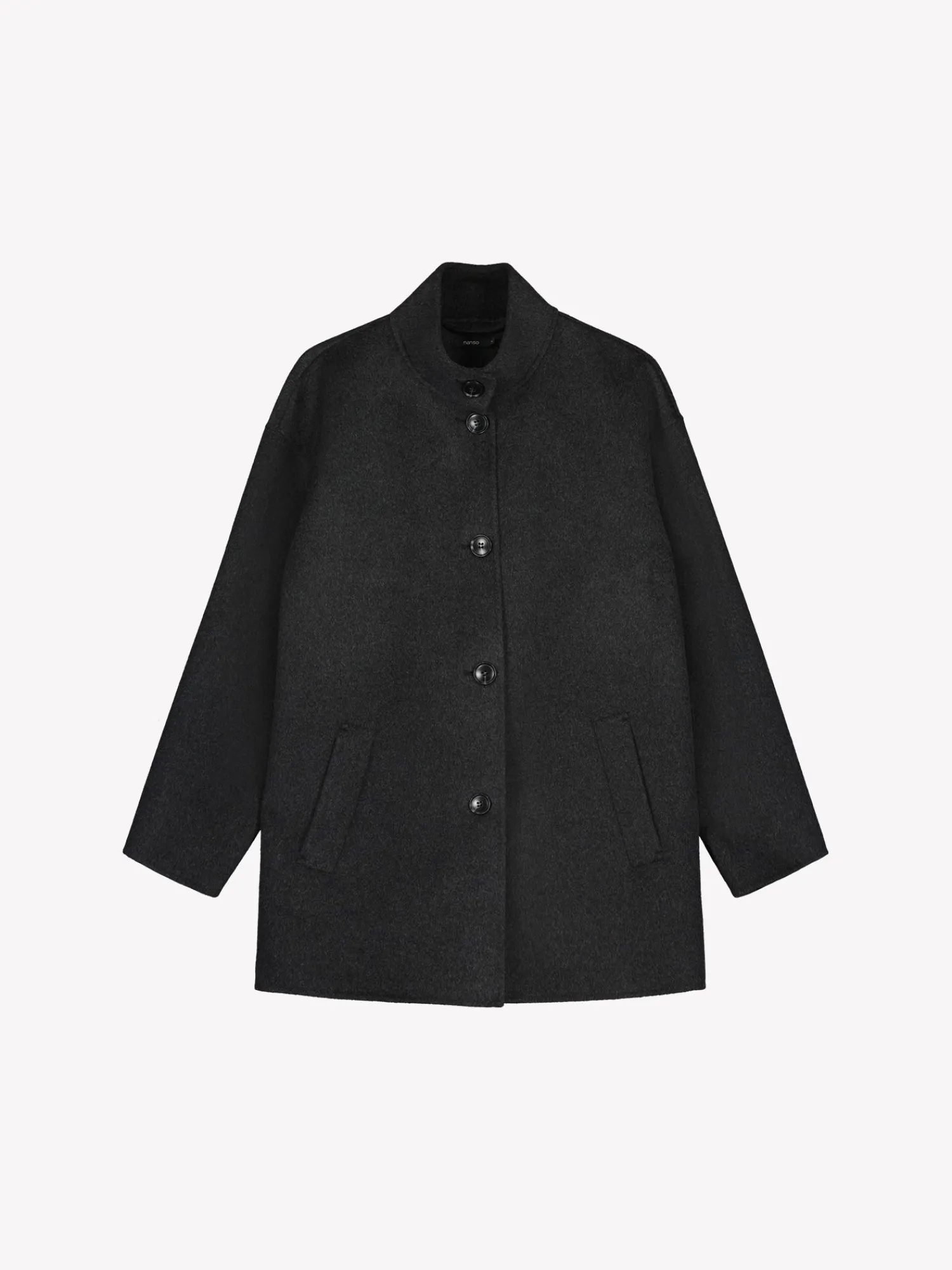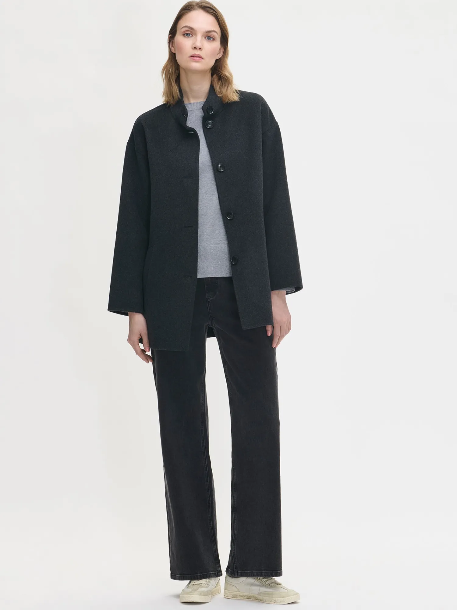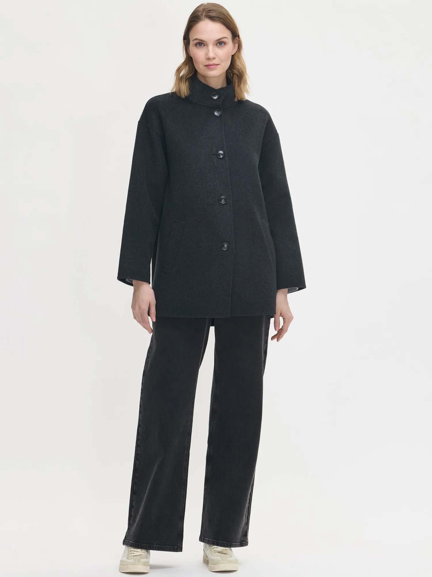 Naisten rento lyhyt tummanharmaa Ella-villakangastakki matalalla pystykauluksella. Villakangastakki on ajaton vaatekaapin kulmakivi, johon on ihanaa pukeutua vuodesta toiseen. Tyylikäs Ella-villakangastakki on monikäyttöinen, sillä se sopii niin arkeen kuin juhlaan. Materiaali on laadukasta villa-polyesteri sekoitetta. A-linjaisen vuorittoman takin saumat ovat kauniisti sisältä ja ulkoa huolitellut. Takissa on edessä nappikiinnitys ja listataskut. Takin pituus koossa M on noin 80 cm.