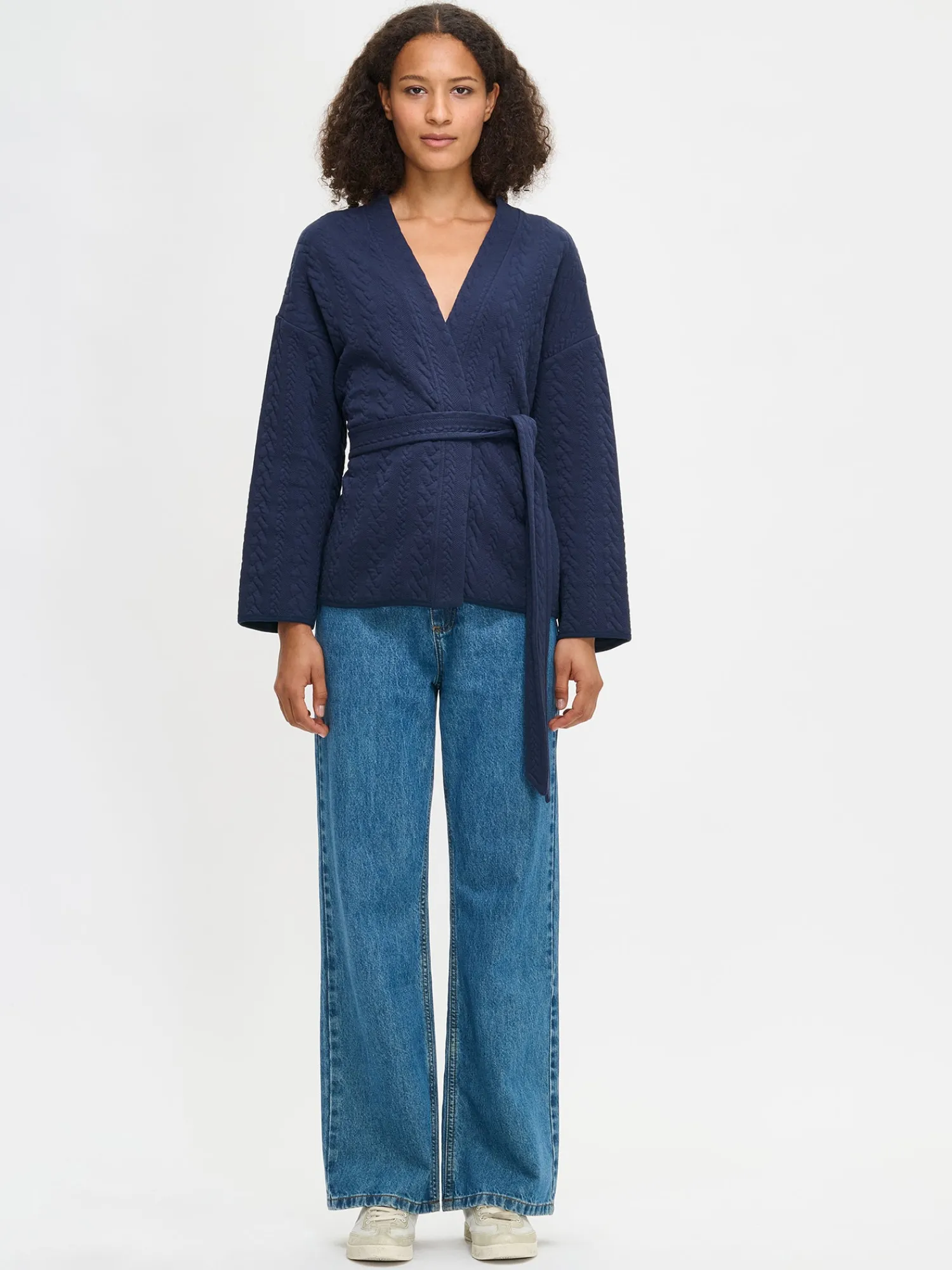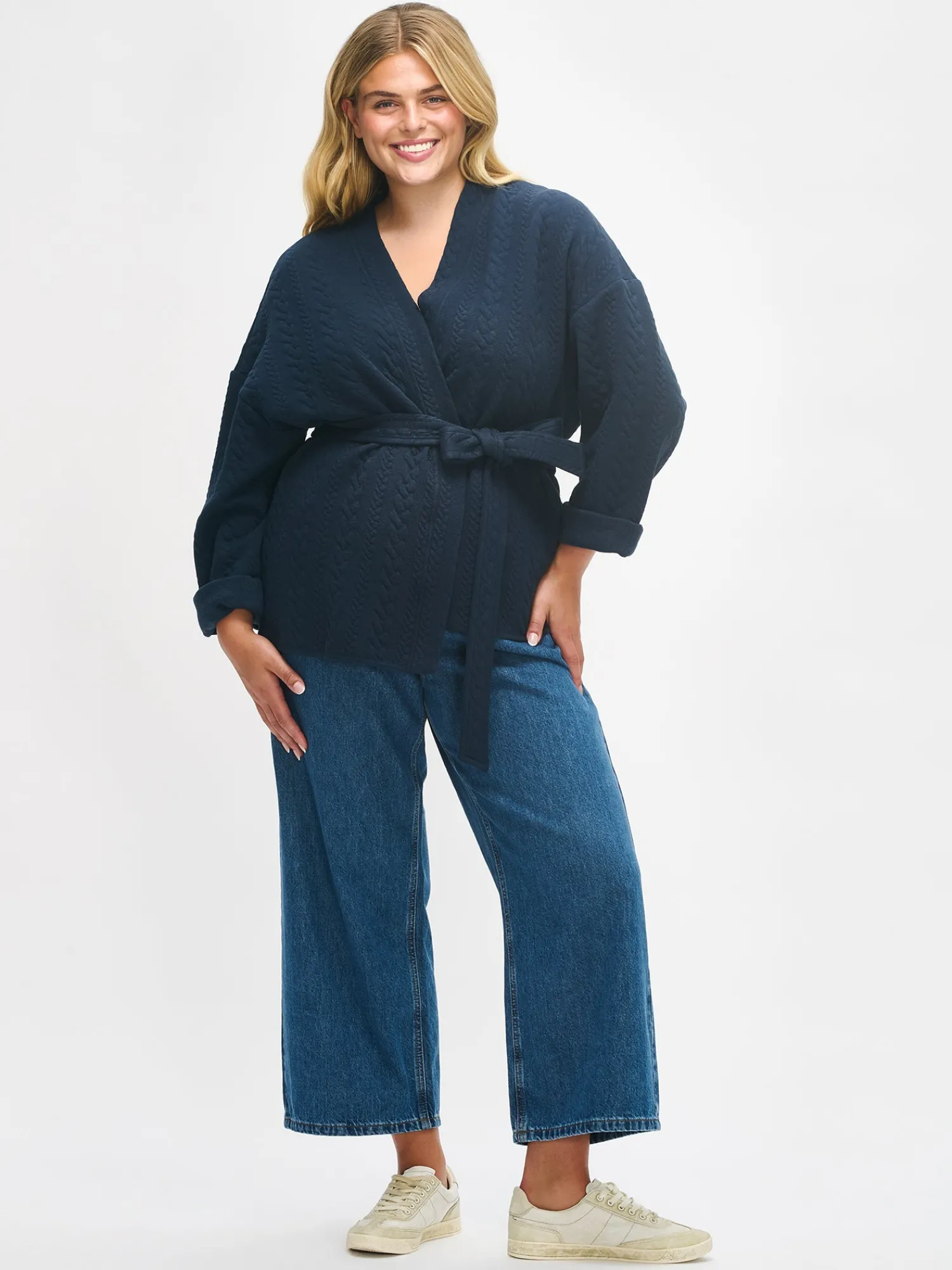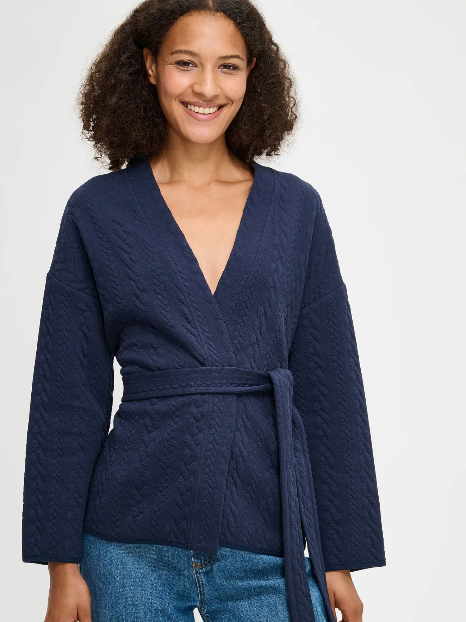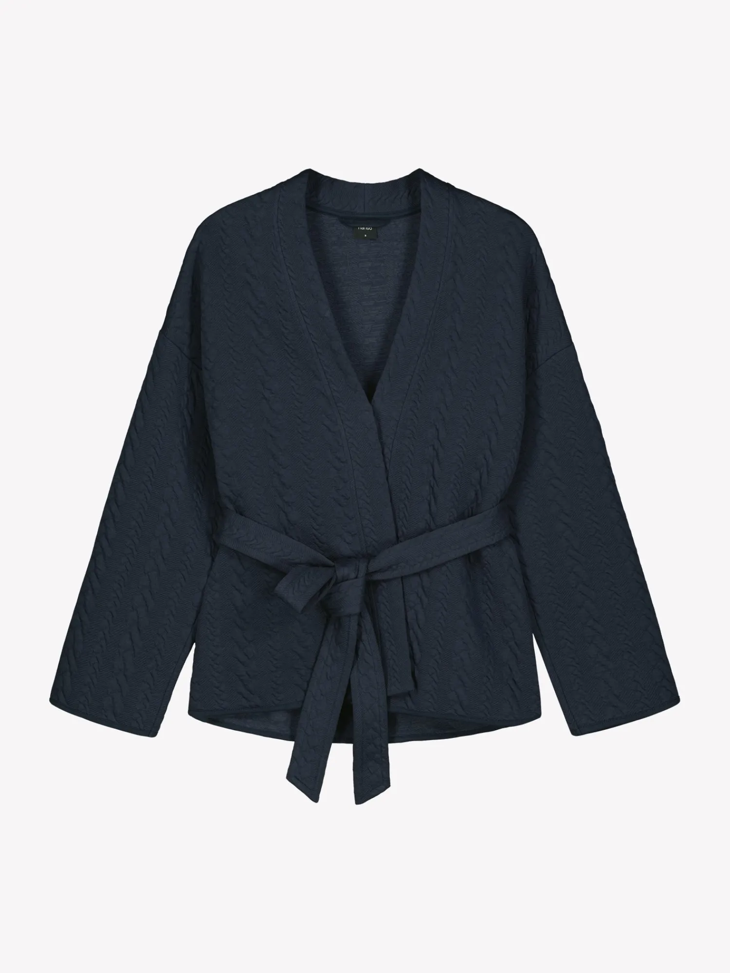 Naisten mukava tummansininen Letti-jakku irtovyöllä. Suoralinjaisen jakun etureuna on huoliteltu leveällä kaitaleella, joka nousee niskassa kaulukseksi. Hihat ovat täyspitkät. Jakun pituus koossa M on noin 69 cm. Ryhdikäs palmikkomaisesti pintakuvioitu materiaali on miellyttävää puuvilla-elastaanineulosta. Materiaalille on ominaista 3-5 % kutistuminen ensimmäisessä pesussa.