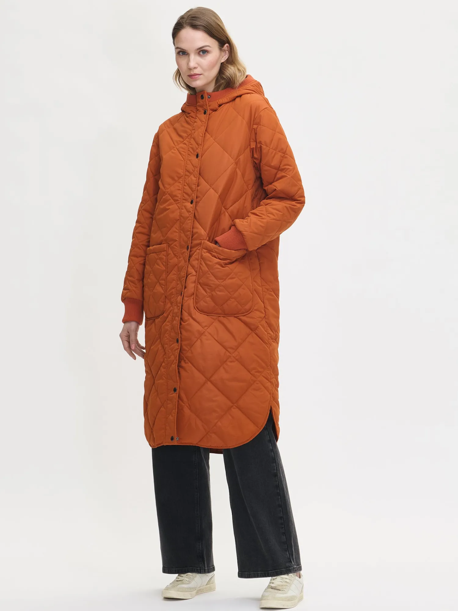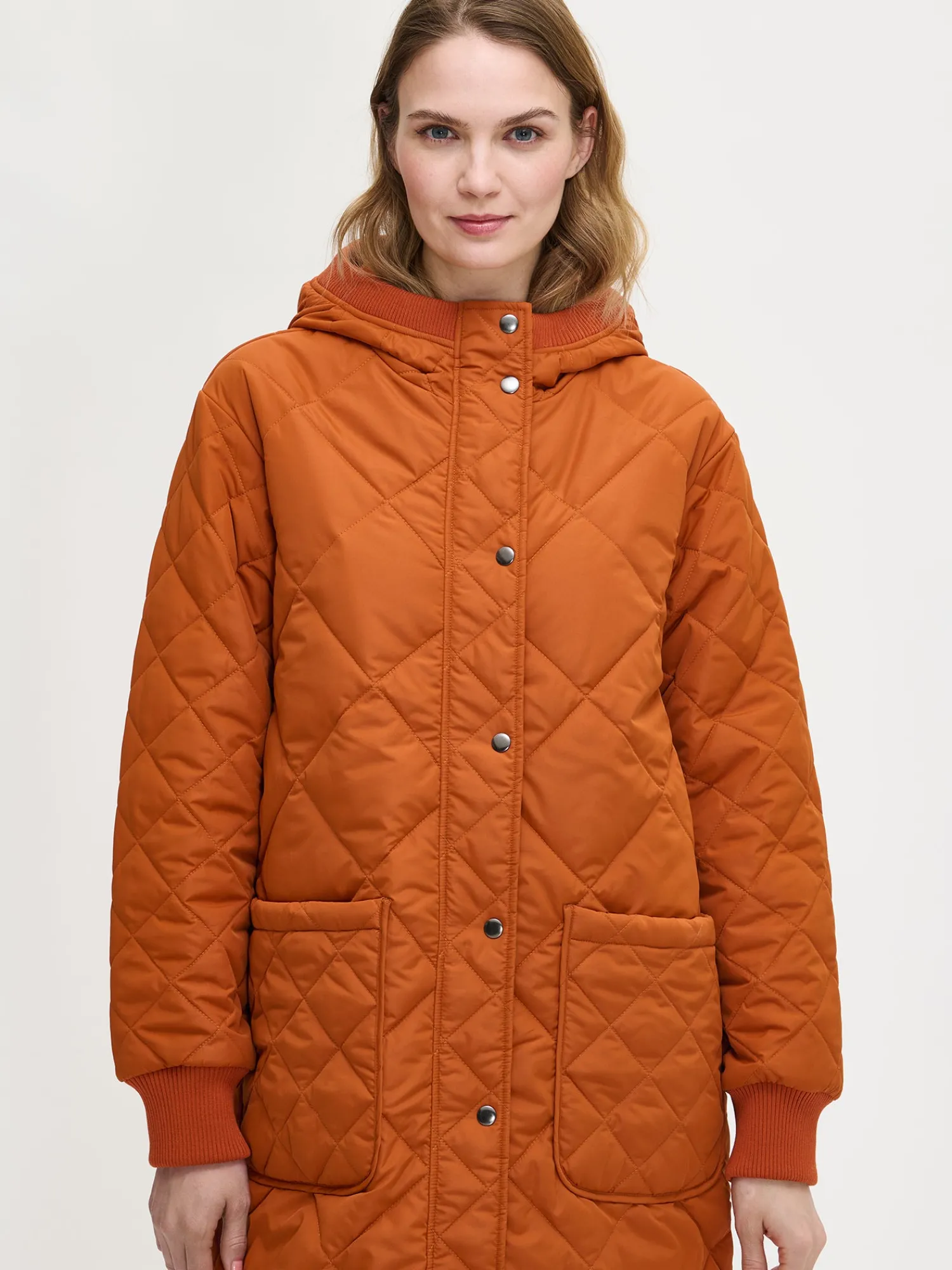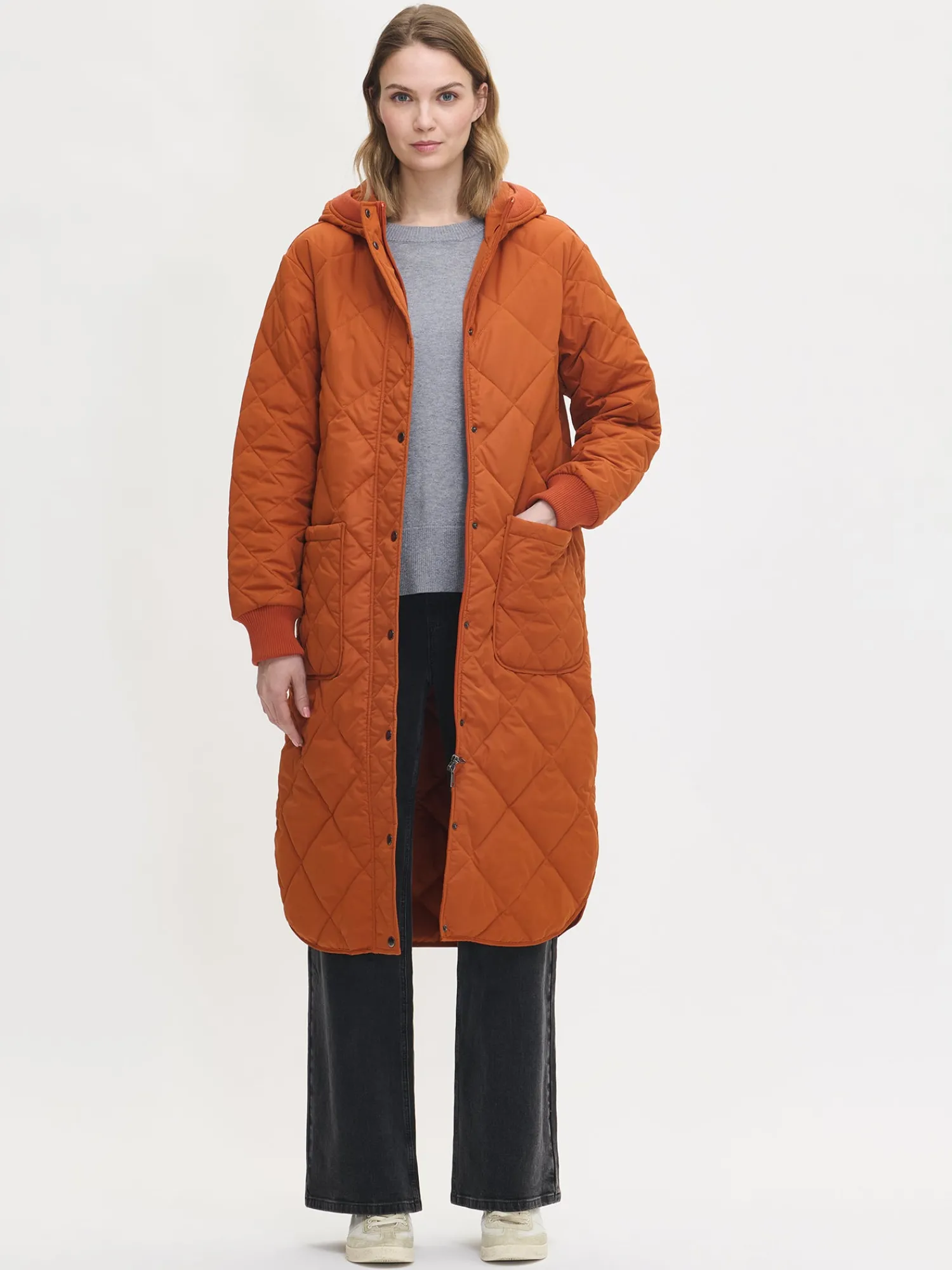 Naisten rennon tyylikäs oranssin ruskea Maxi Hood-tikkitakki kevyellä vanulla ja lämpimällä hupulla. Ajaton tikkitakki on ehdoton vaatekaapin kulmakivi ja luottovaate, joka sopii kaudesta toiseen. Hupullinen tikkitakki on täydellinen valinta välikauteen, sillä se on kevyt ja lämmin vaihtelevassa säässä. Pitkässä hupullisessa takissa on edessä kaksisuuntainen vetoketju ja nepparikiinnitteinen tuulilista. Hupun reunassa ja hihansuissa on mukava neulosresori. Takissa on pudotettu olkalinja, päällitaskut ja pyöristetty helma. Takin pituus koossa M on noin 115 cm. Materiaali on laadukasta vettähylkivää kierrätyspolyesteria ja takissa on Sorona-vanu.