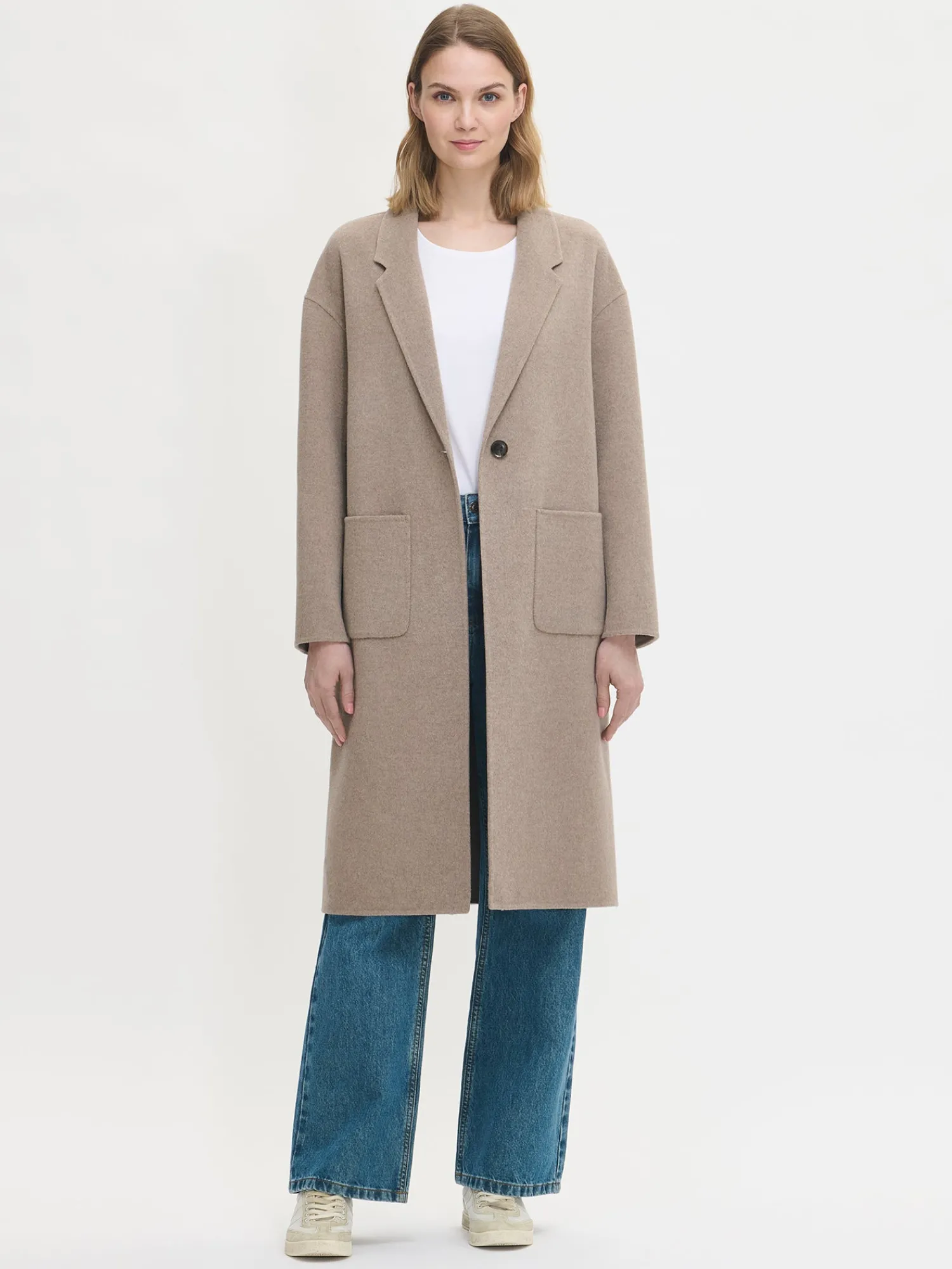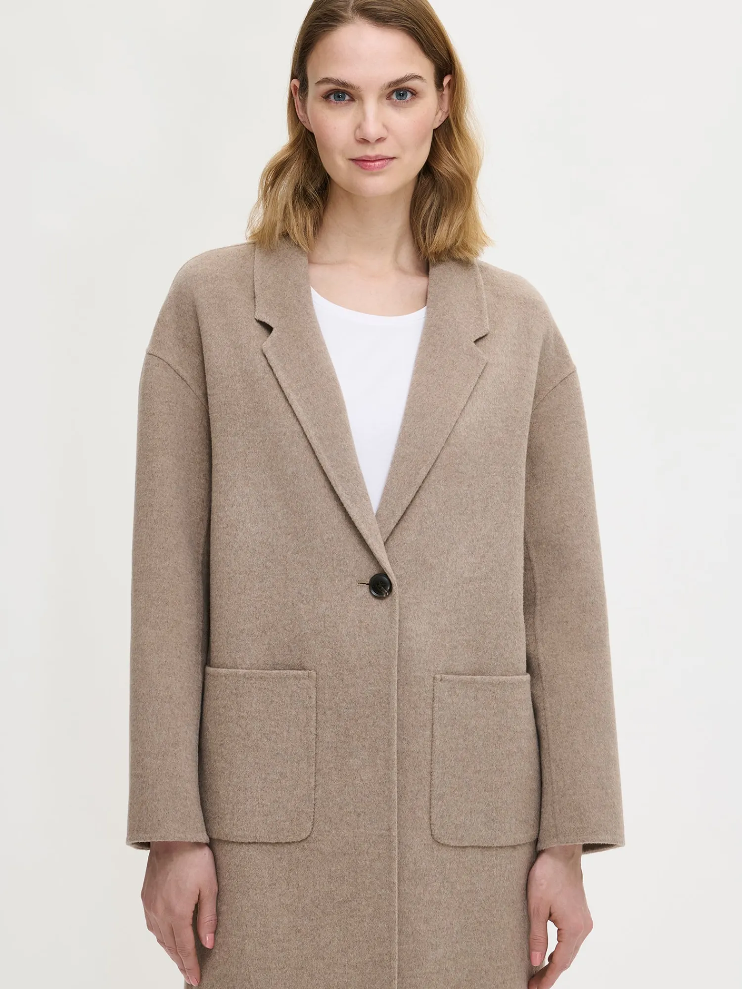 Tyylikäs ja klassinen beige Ylle-villakangastakki on täydellinen valinta, kun haluat pukeutua sekä mukavasti että elegantisti. Laadukkaasta villa-polyesterisekoitteesta valmistettu takki tuntuu miellyttävältä yllä ja kestää käyttöä vuodesta toiseen. Vuorittoman villakangastakin saumat ovat kauniisti sisältä ja ulkoa huolitellut. Takissa on edessä nappikiinnitys ja käytännölliset päällitaskut. Suoralinjainen leikkaus ja takahalkio takaavat hyvän istuvuuden ja liikkumavapauden. Takin pituus koossa M on noin 110 cm, joka tekee siitä täydellisen yhdistettävän niin housujen kuin mekkojen kanssa – kerrospukeutumista unohtamatta.