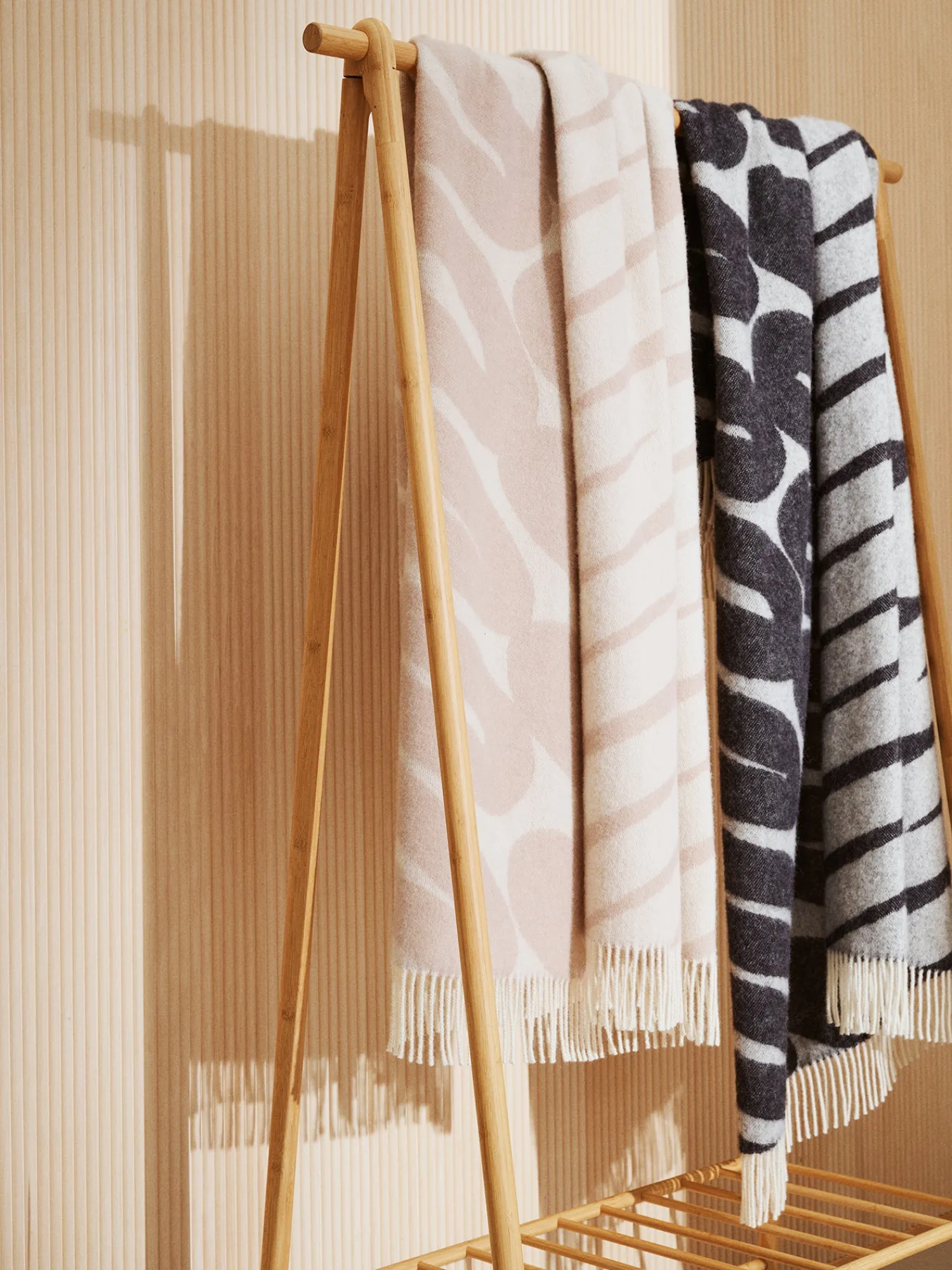 Laskos-villahuopa tuo kylmeneviin iltoihin mukavuutta ja lämpöä. 100% uudesta, puhtaasta villasta valmistettuun huopaan on ihanaa kietoutua syksyn hämärtyessä. Beigessä huovassa on kaunis graafinen kuvio ja lyhyitä sivuja koristavat kierrehapsut. Villa on antistaattinen ja luonnostaan likaa hylkivä materiaali. Huopa on kudottu jacquard-tekniikalla ja näin ollen kääntöpuolella on vastinvärit. Huovan koko on 130 x 170 cm.