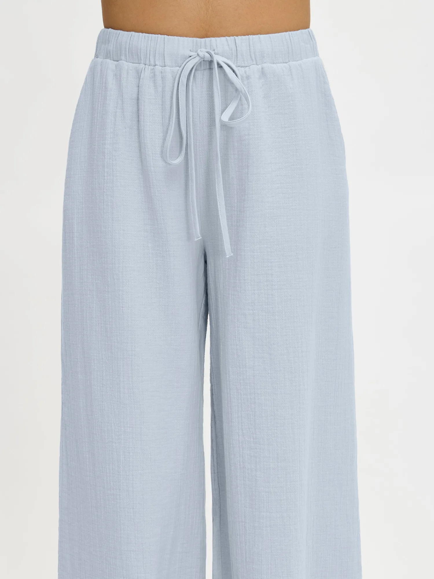 Naisten yksiväriset vaaleansiniset Aamu-housut sivutaskuilla. Vyötäröllä on mukava kuminauharakenne kiristysnauhalla. Rennot, leveälahkeiset housut ovat tyylikkäästi 7/8-pituiset. Materiaali on kevyttä kaksikerroksista pintastruktuurillista puuvillamusliini-kangasta. Nämä housut tarjoavat täydellisen yhdistelmän rentoutta ja käytännöllisyyttä. Sivutaskut lisäävät mukavuutta ja tekevät niistä ihanan valinnan päivittäisiin, kiireettömiin hetkiin kotona.