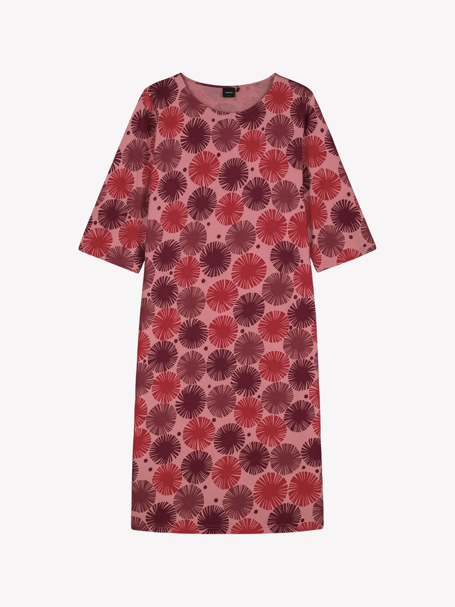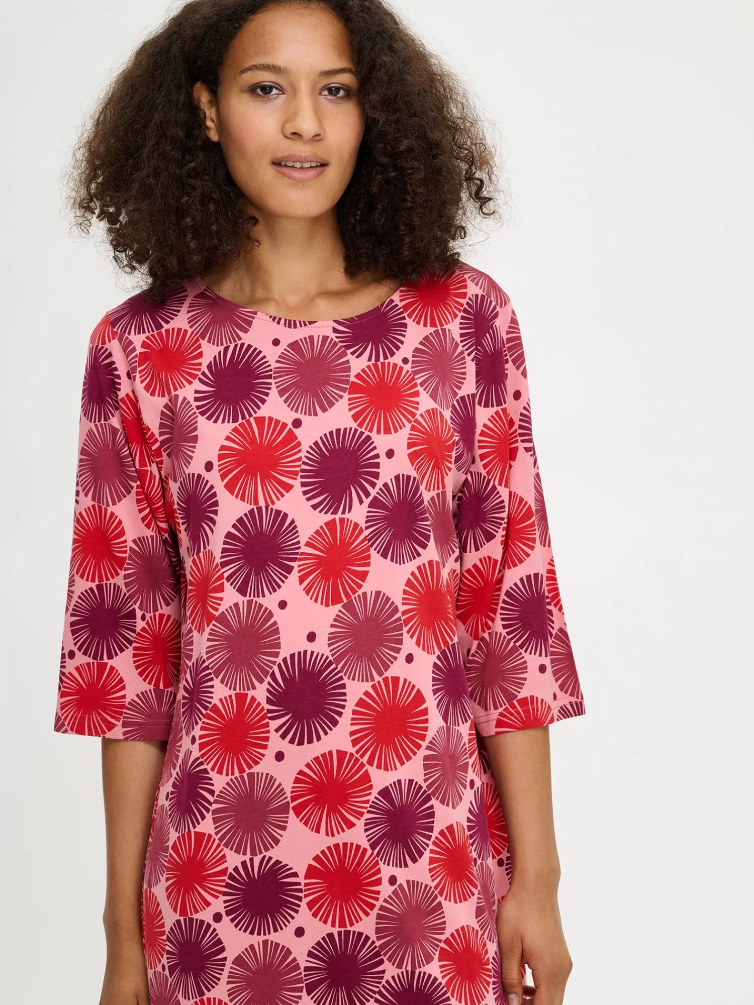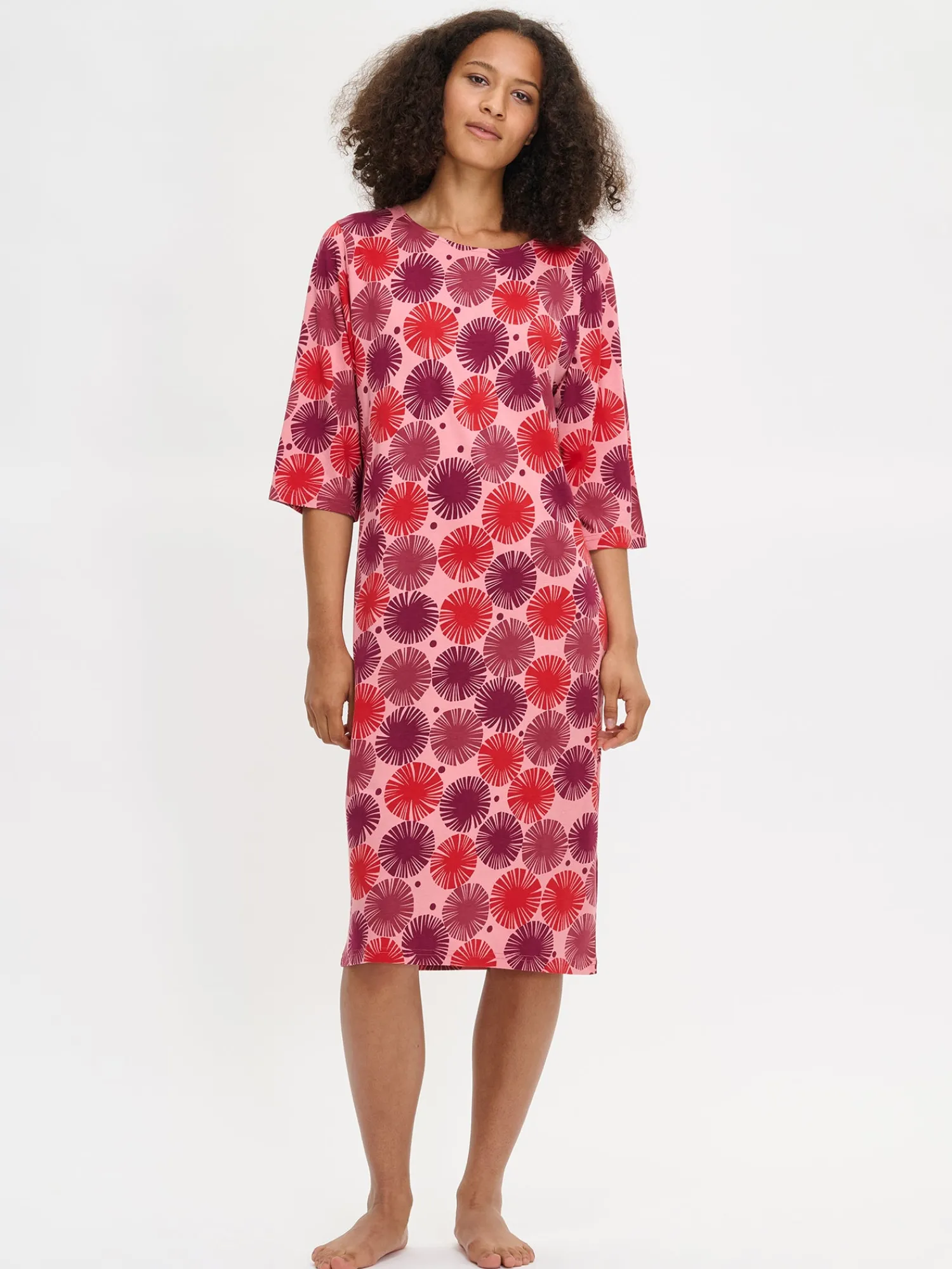 Naisten kuosillinen Amara-yöpaita 3/4-hihoilla ja ovaalilla pääntiellä. Yöpaidan pituus koossa M on noin 115 cm. Materiaali on laadukasta, iholla miellyttävän pehmeältä tuntuvaa ja helppohoitoista puuvilla-modaalia, joka pysyy hyvänä pesusta toiseen.