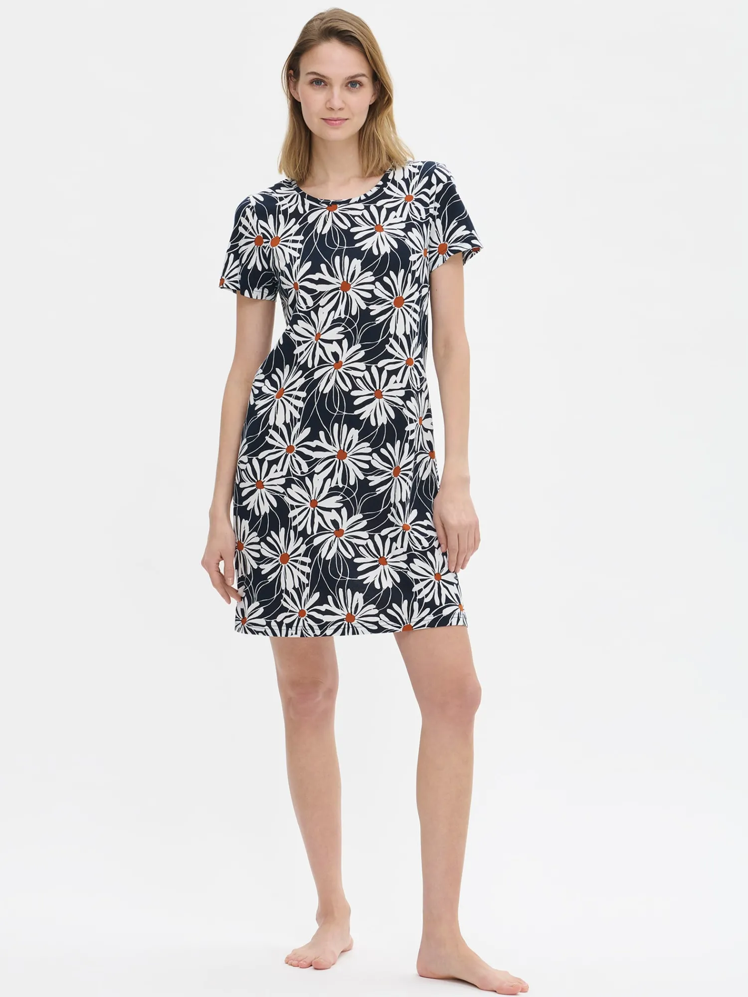 Naisten kukkakuosillinen Anette-yöpaita lyhyillä hihoilla ja pyöreällä pääntiellä sinisessä sävyssä. Yöpaidan pituus koossa M on noin 95 cm. Materiaali on laadukasta, iholla miellyttävän pehmeältä tuntuvaa ja helppohoitoista puuvilla-modaalia, joka pysyy hyvänä pesusta toiseen.