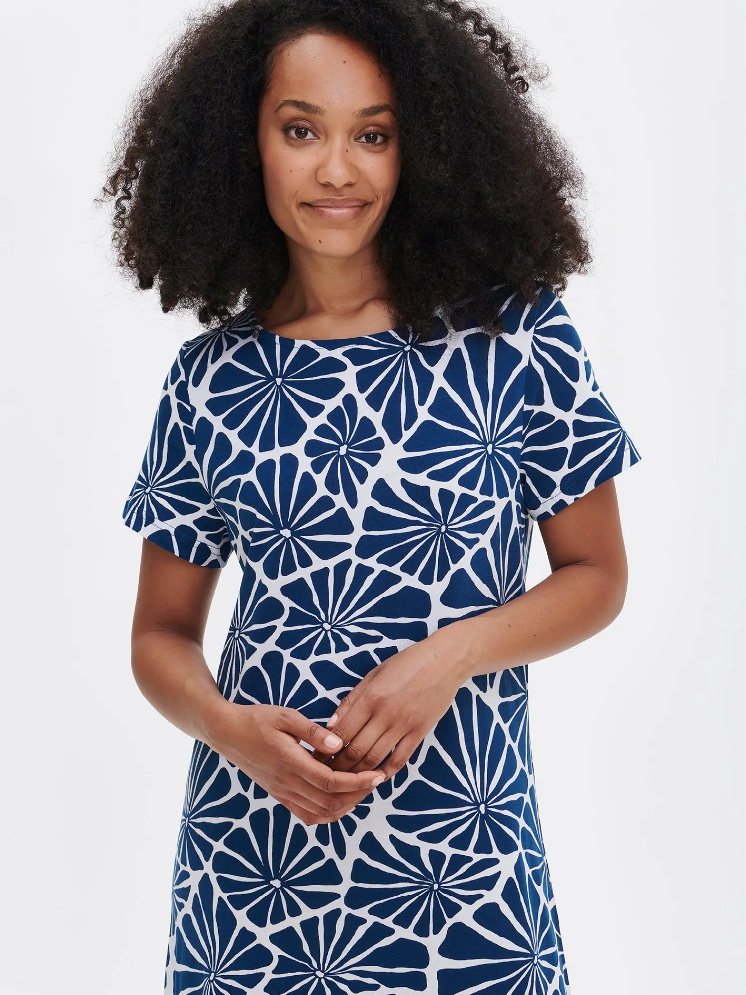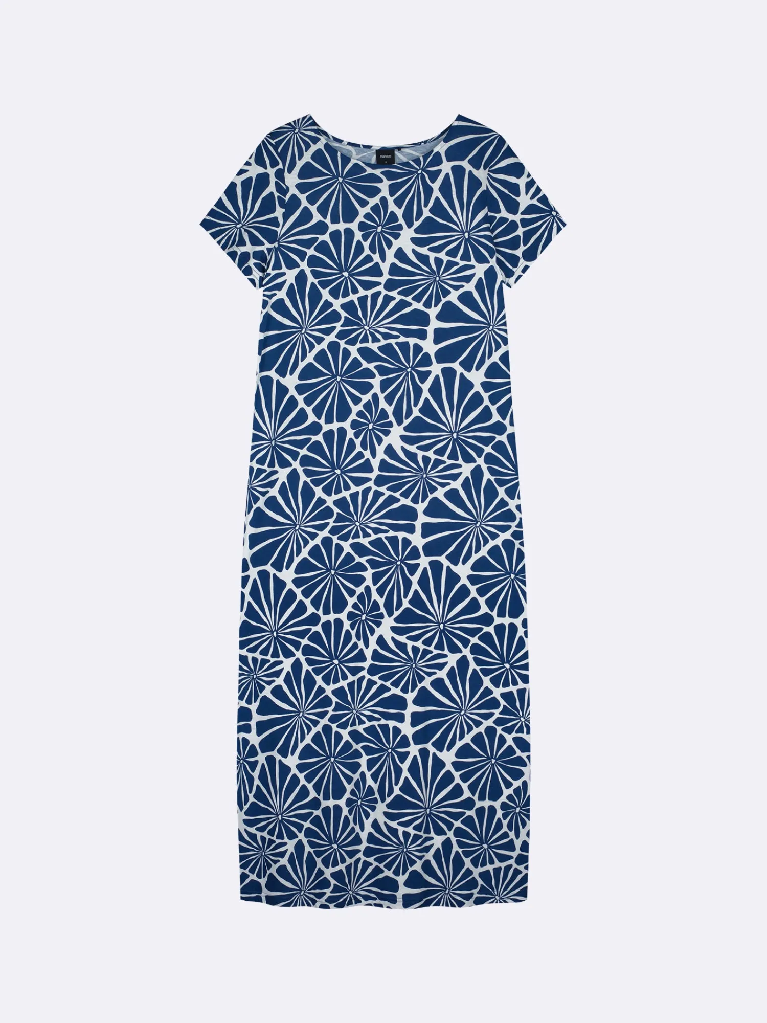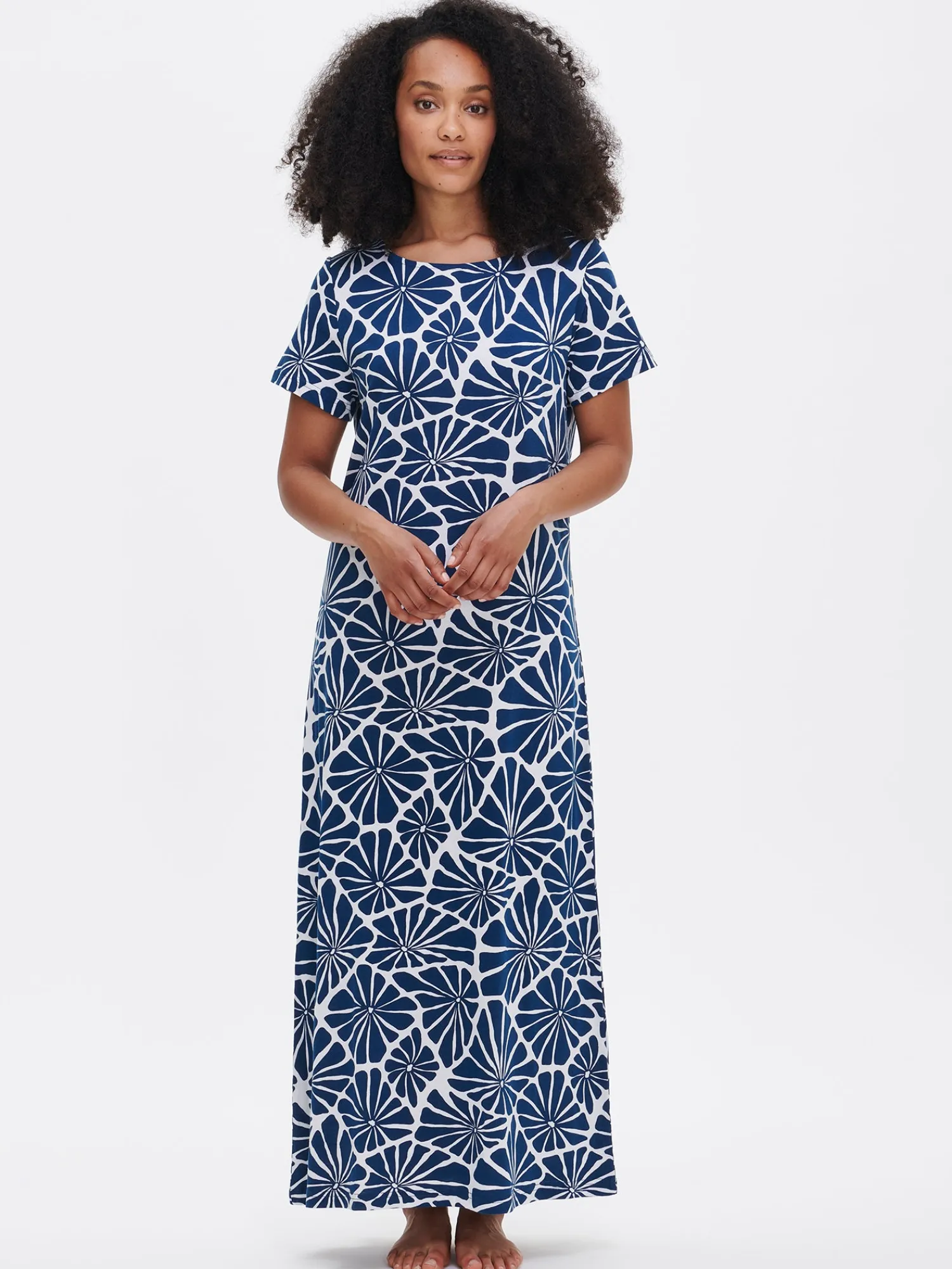 Naisten kuosillinen tummansininen Aralia-yöpaita lyhyillä hihoilla ja ovaalilla pääntiellä. Yöpaidan pituus koossa M on noin 130 cm. Materiaali on laadukasta, iholla miellyttävän pehmeältä tuntuvaa ja helppohoitoista puuvilla-modaalia, joka pysyy hyvänä pesusta toiseen.