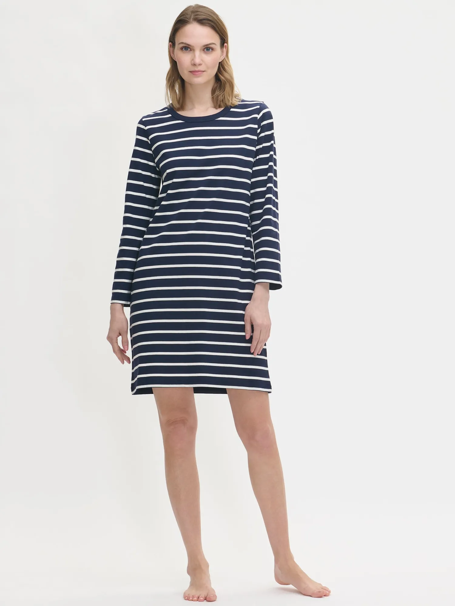 Naisten siniraidallinen Duetto-yöpaita pitkillä hihoilla. Rennon yöpaidan pääntie on viimeistelty yksivärisellä kantilla. Yöpaidan pituus koossa M on noin 95 cm. Materiaali on laadukasta, iholla miellyttävän pehmeältä tuntuvaa ja helppohoitoista puuvillaneulosta, joka pysyy hyvänä pesusta toiseen. Neulos on valmistettu sertifioidusta puuvillasta.