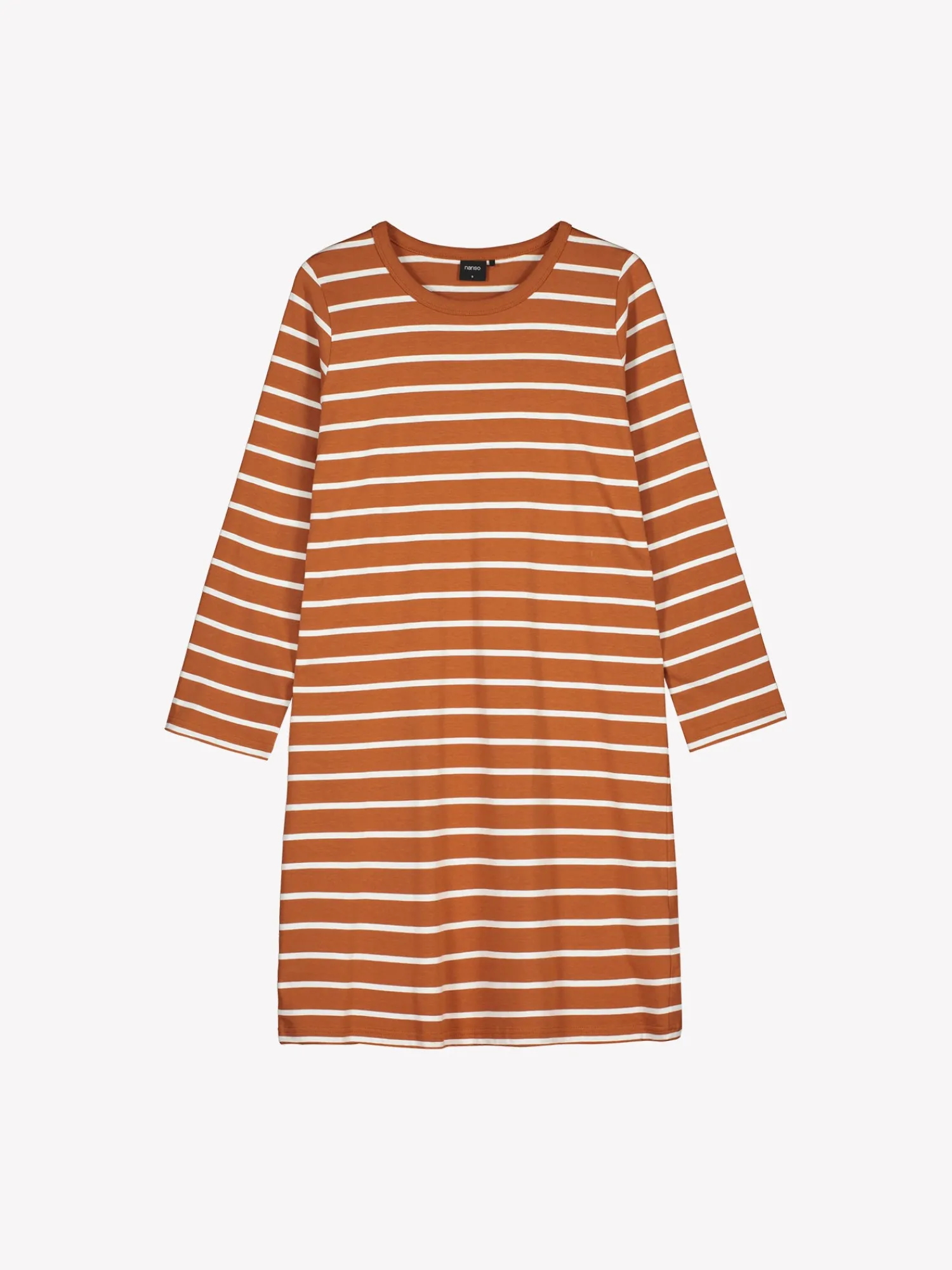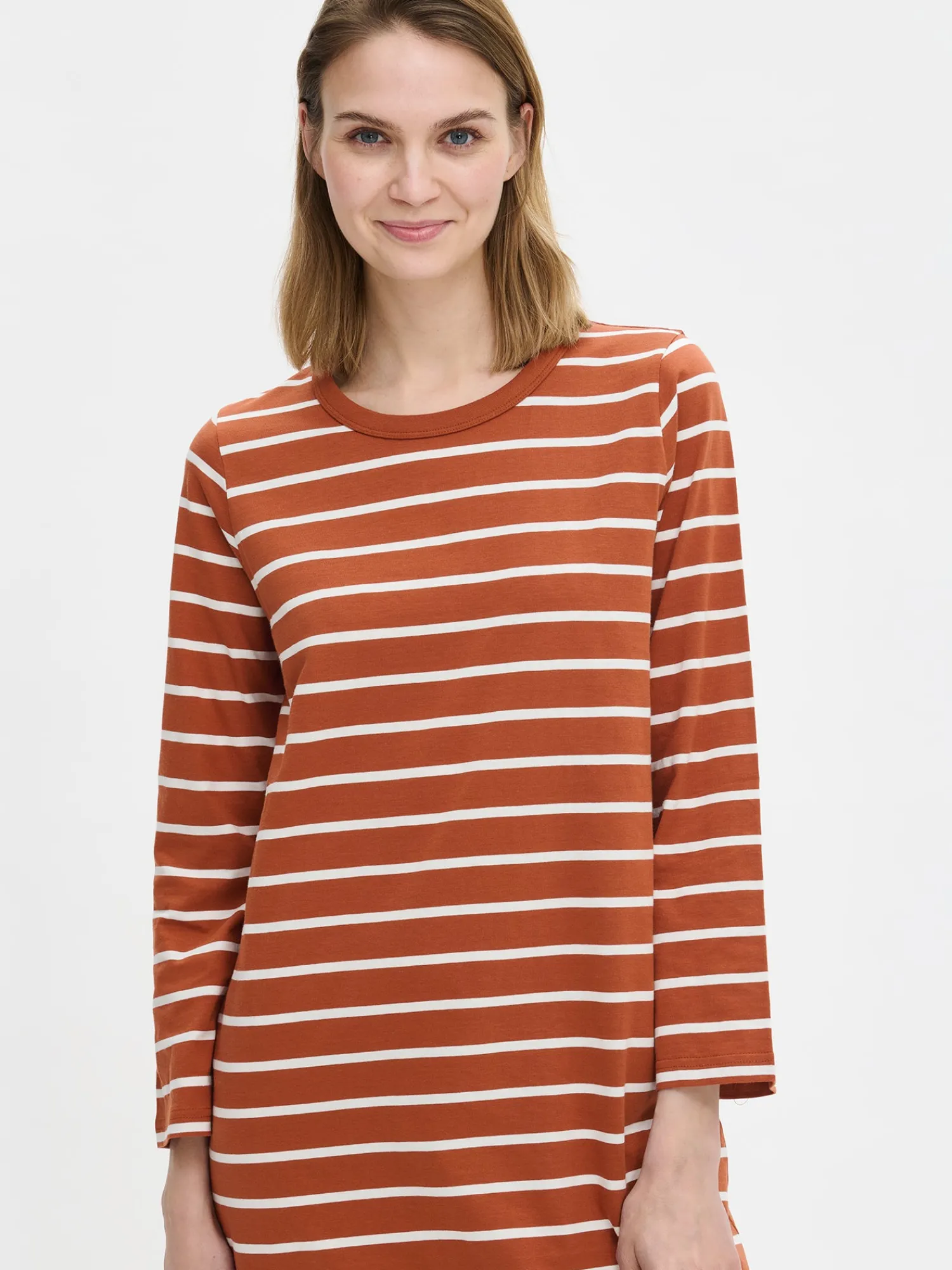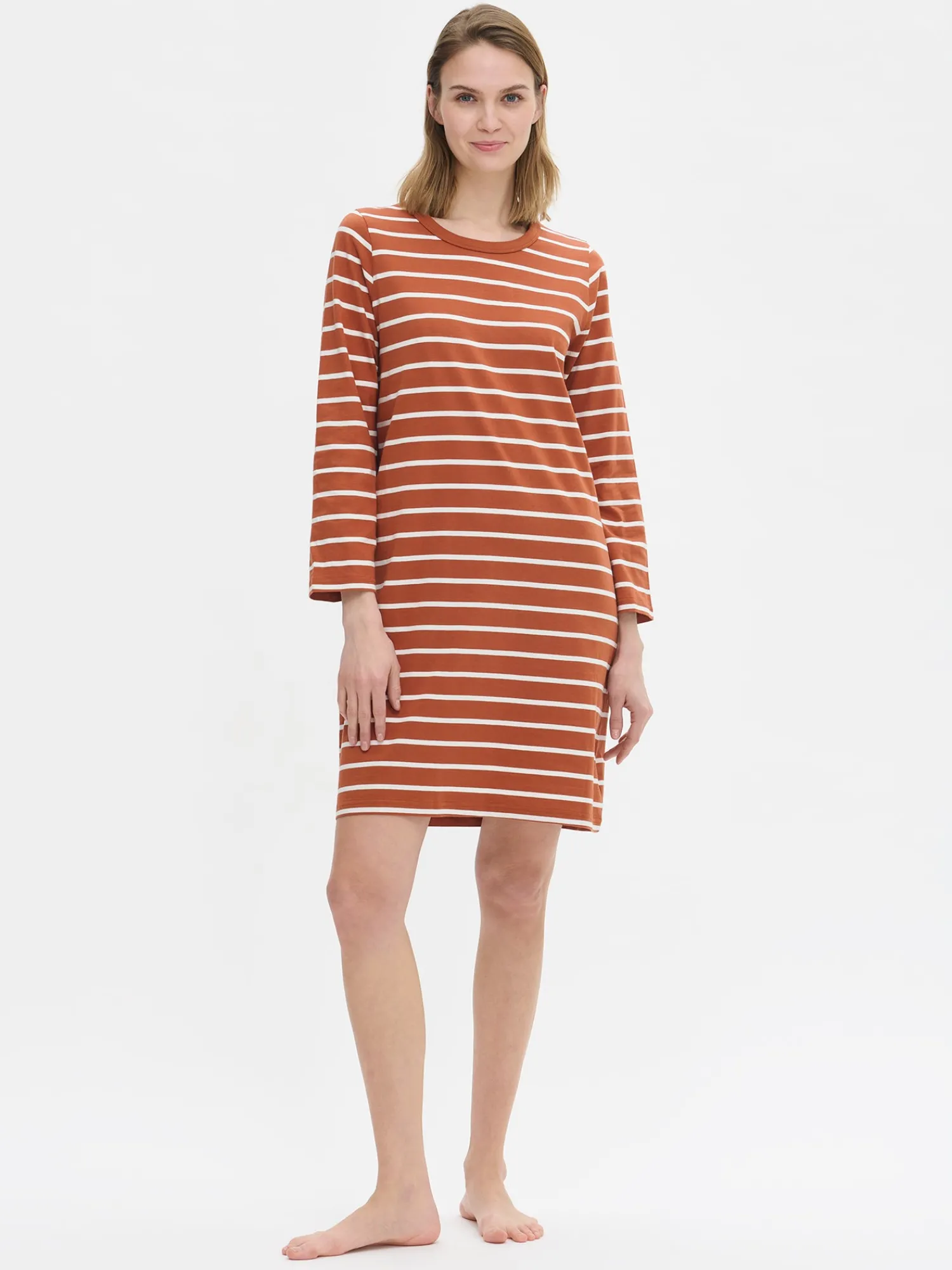 Naisten raidallinen Duetto-yöpaita pitkillä hihoilla ruskeassa värissä. Rennon yöpaidan pääntie on viimeistelty yksivärisellä kantilla. Yöpaidan pituus koossa M on noin 95 cm. Materiaali on laadukasta, iholla miellyttävän pehmeältä tuntuvaa ja helppohoitoista puuvillaneulosta, joka pysyy hyvänä pesusta toiseen. Neulos on valmistettu sertifioidusta puuvillasta.