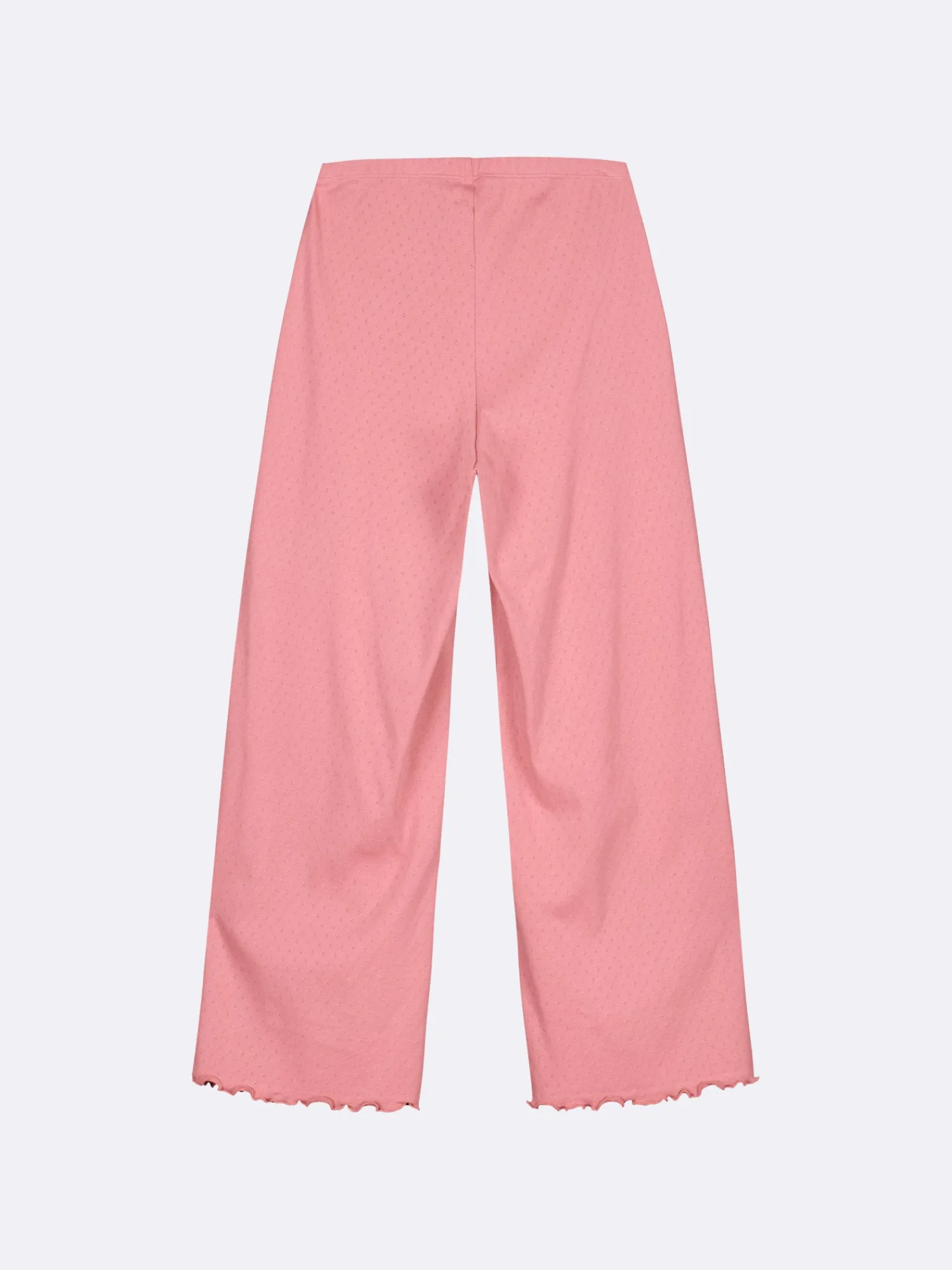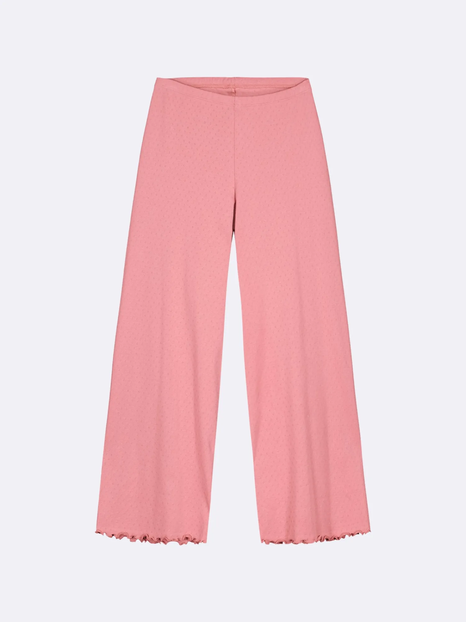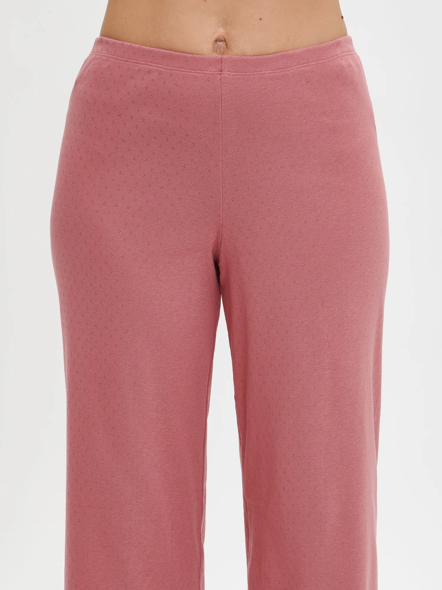 Naisten roosat Elise-housut. 7/8 pituisissa housuissa on joustava vyötärö. Lahkeensuut on viimeistelty kapealla ja tiiviillä saumuritikkauksella, joka huolittelee reunan ja luo siihen kauniin aaltoilevan efektin. Materiaali on joustavaa ja miellyttävän tuntuista puuvillaribbineulosta, jossa on kaunis ja hienostunut neulottu pitsikuvio.