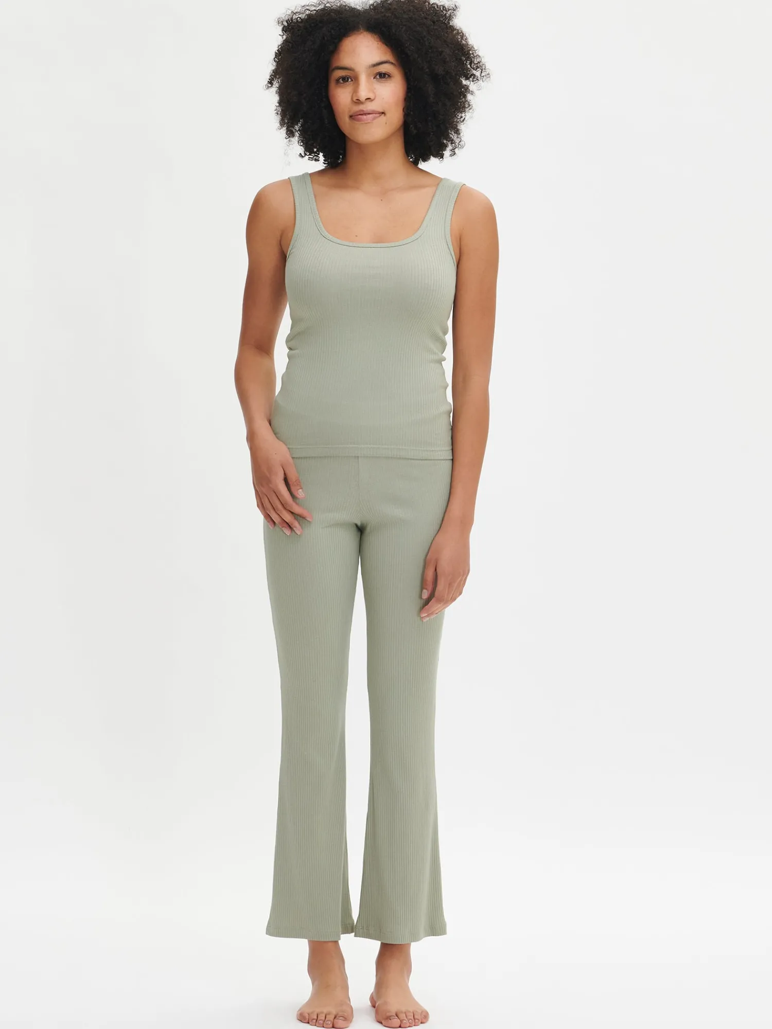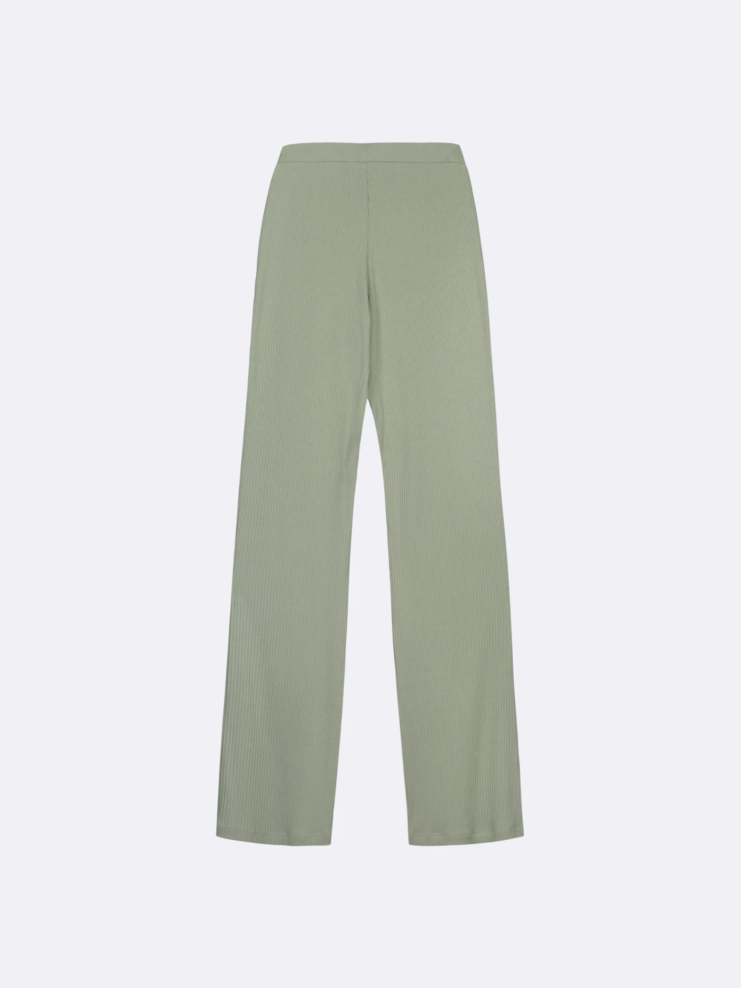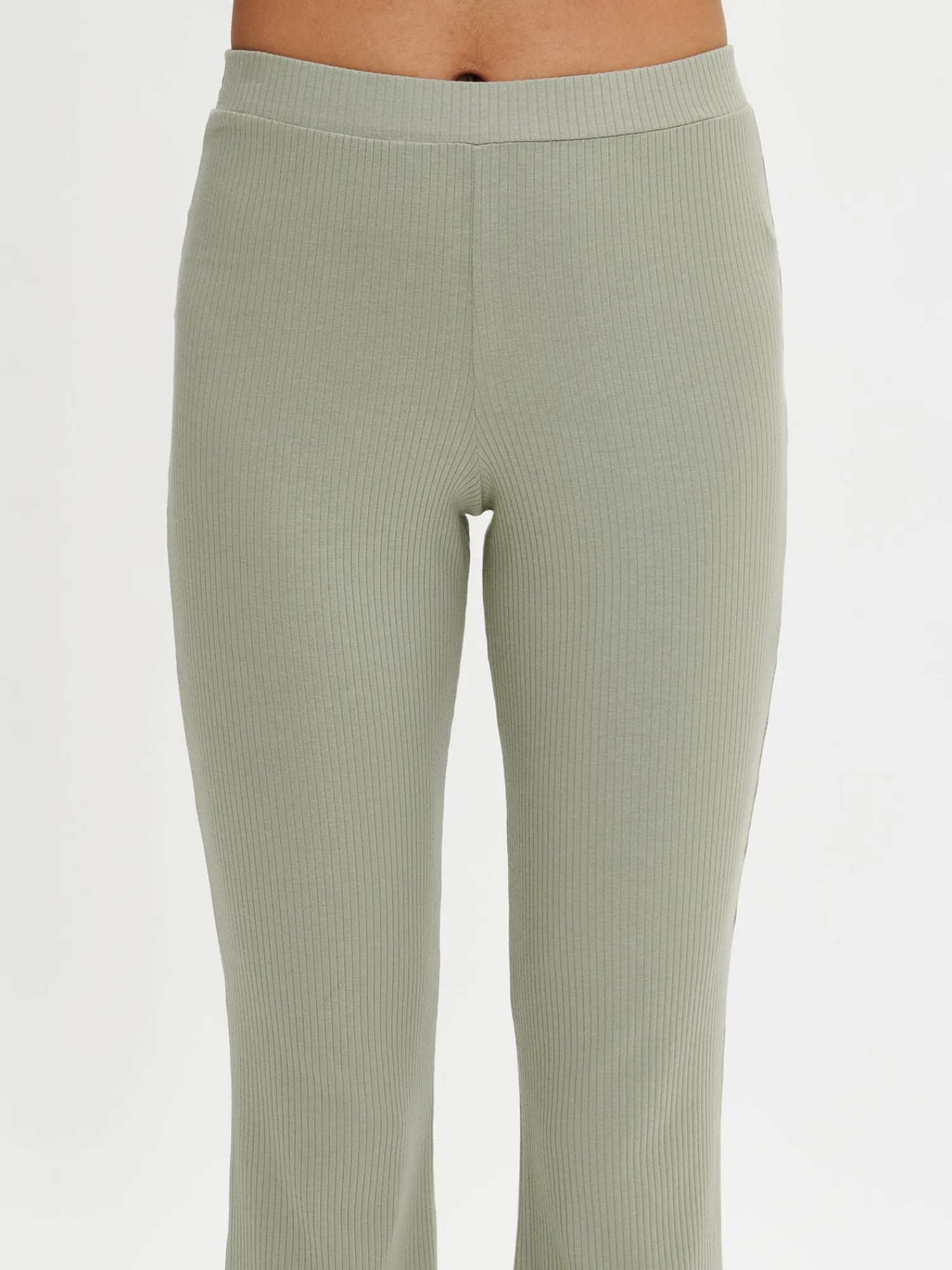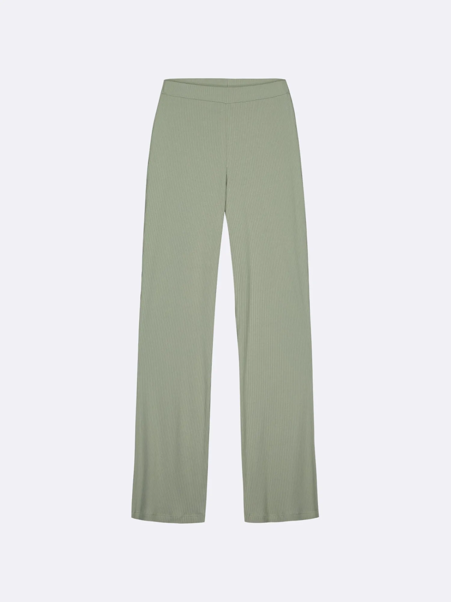 Naisten rennot vihreät Heila-ribbihousut, joissa on mukava kuminauharakenne vyötäröllä ja levenevät lahkeet. Housut ovat täyspitkät ja kauniisti muotoiltu. Materiaali on laadukasta, iholla pehmeän tuntuista bambu-puuvilla-elastaaniribbiä. Tuotteessa käytetty puuvilla on orgaanista. Nämä housut yhdistävät rentouden ja tyylikkyyden.