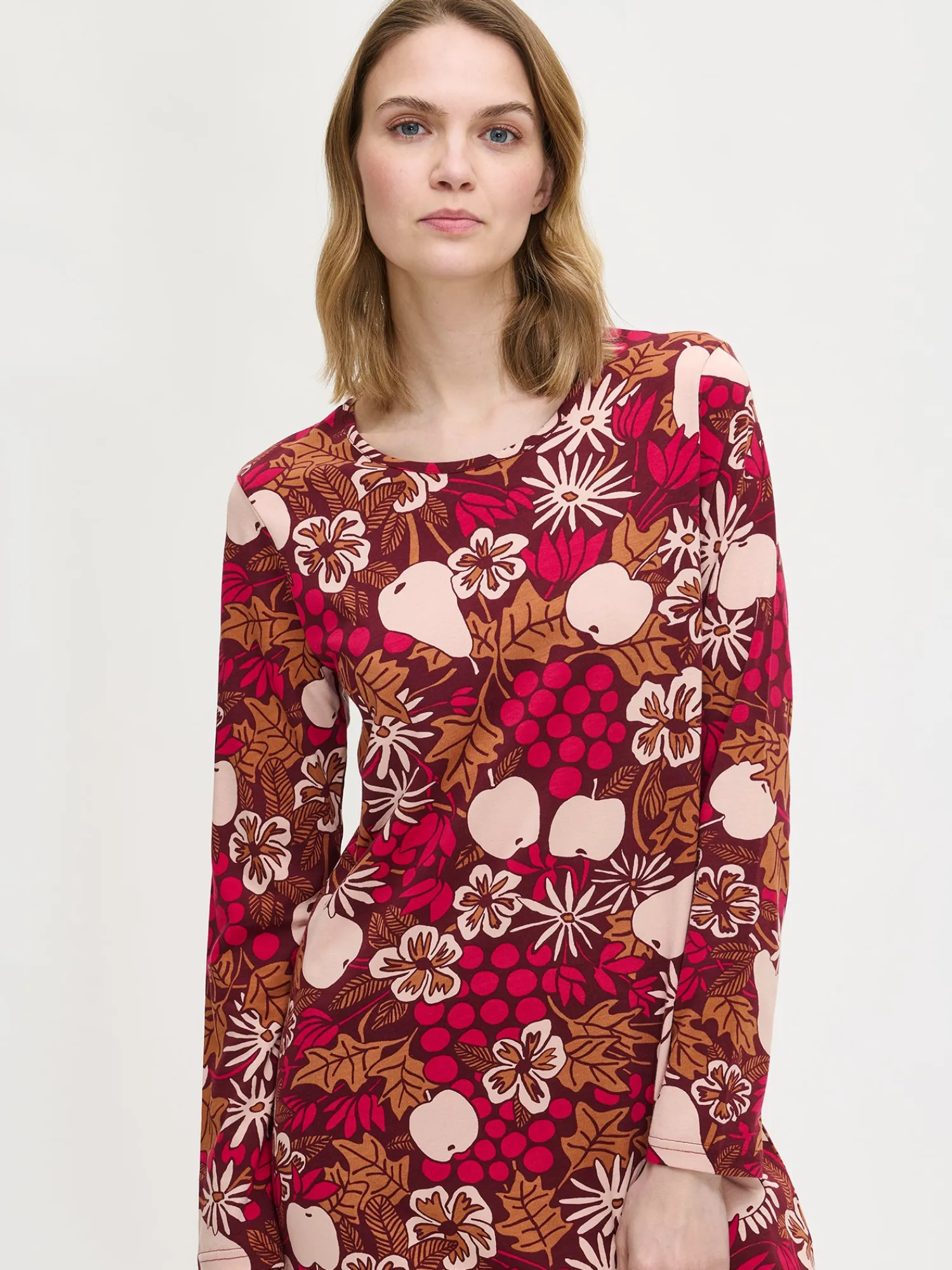 Naisten kuosillinen Juhla-yöpaita pitkillä hihoilla ja pyöreällä pääntiellä ruskeassa sävyssä. Yöpaidan pituus koossa M on noin 95 cm. Materiaali on laadukasta, iholla miellyttävän pehmeältä tuntuvaa ja helppohoitoista puuvilla-modaalia, joka pysyy hyvänä pesusta toiseen.
