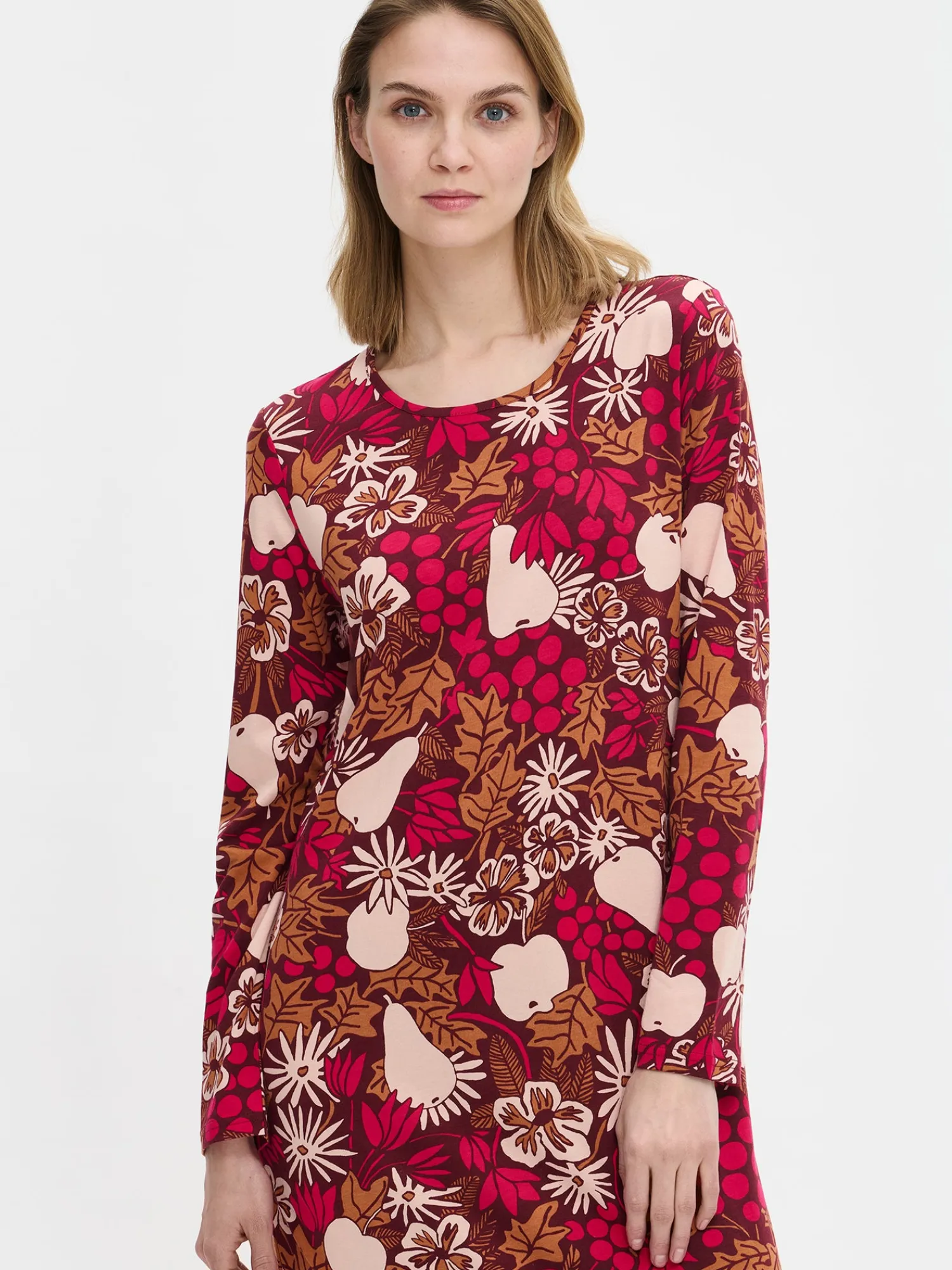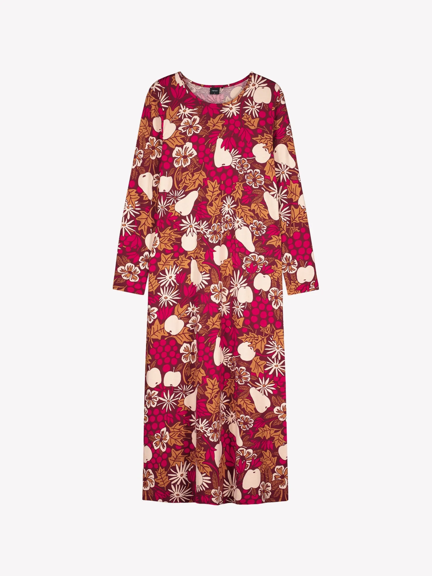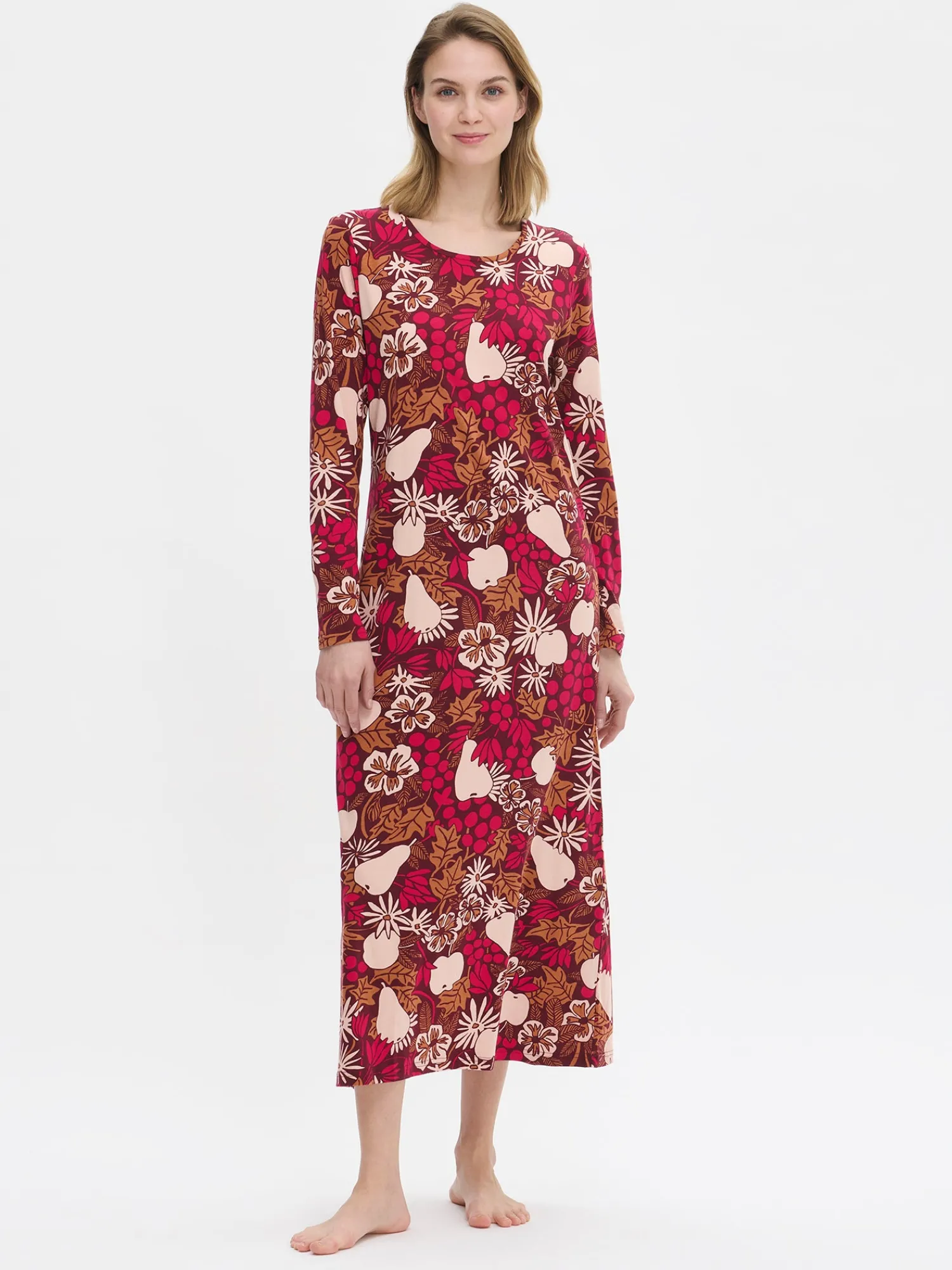 Naisten kuosillinen Juhla-yöpaita pitkillä hihoilla ja pyöreällä pääntiellä ruskeassa sävyssä. Yöpaidan pituus koossa M on noin 130 cm. Materiaali on laadukasta, iholla miellyttävän pehmeältä tuntuvaa ja helppohoitoista puuvilla-modaalia, joka pysyy hyvänä pesusta toiseen.