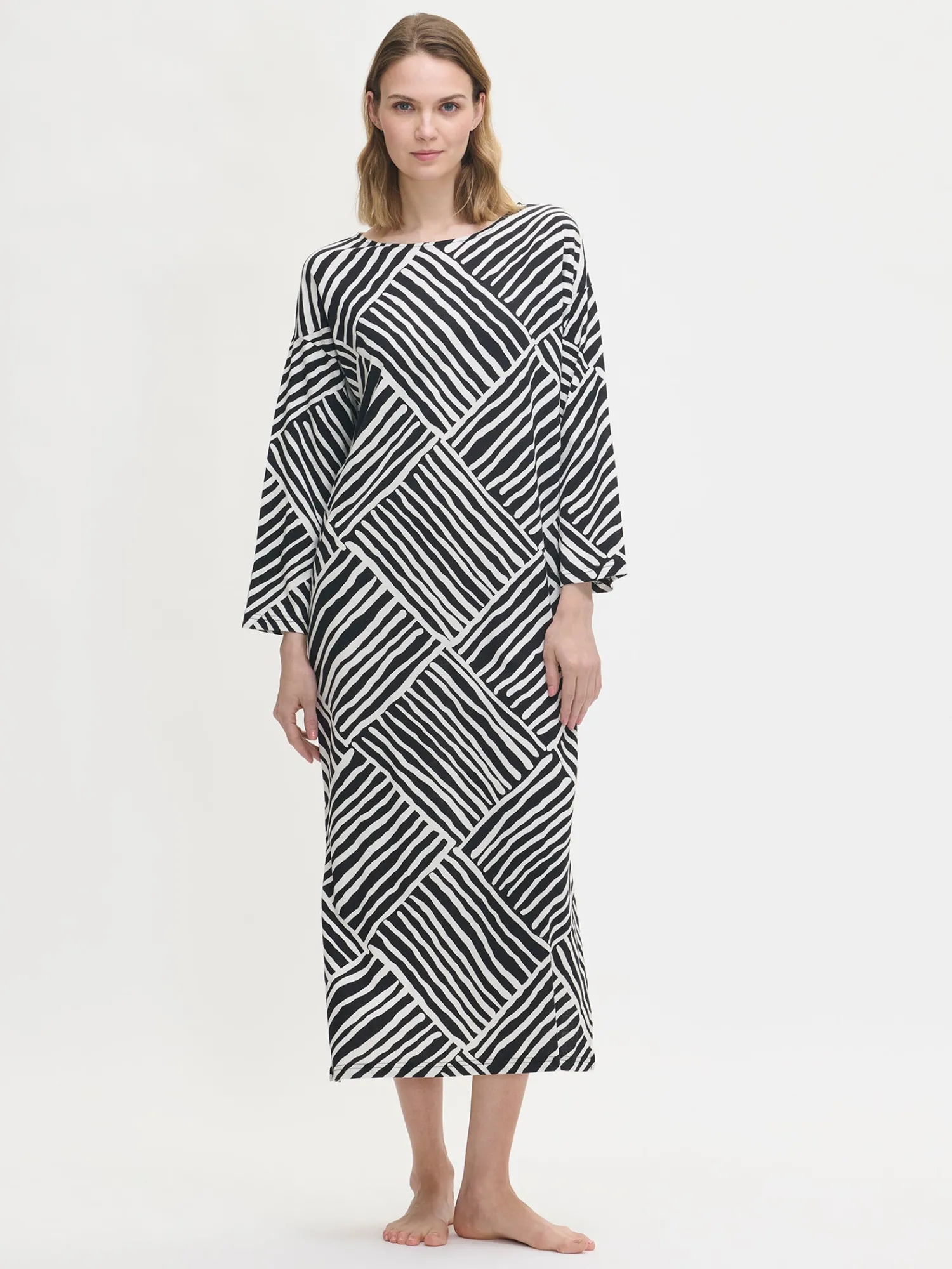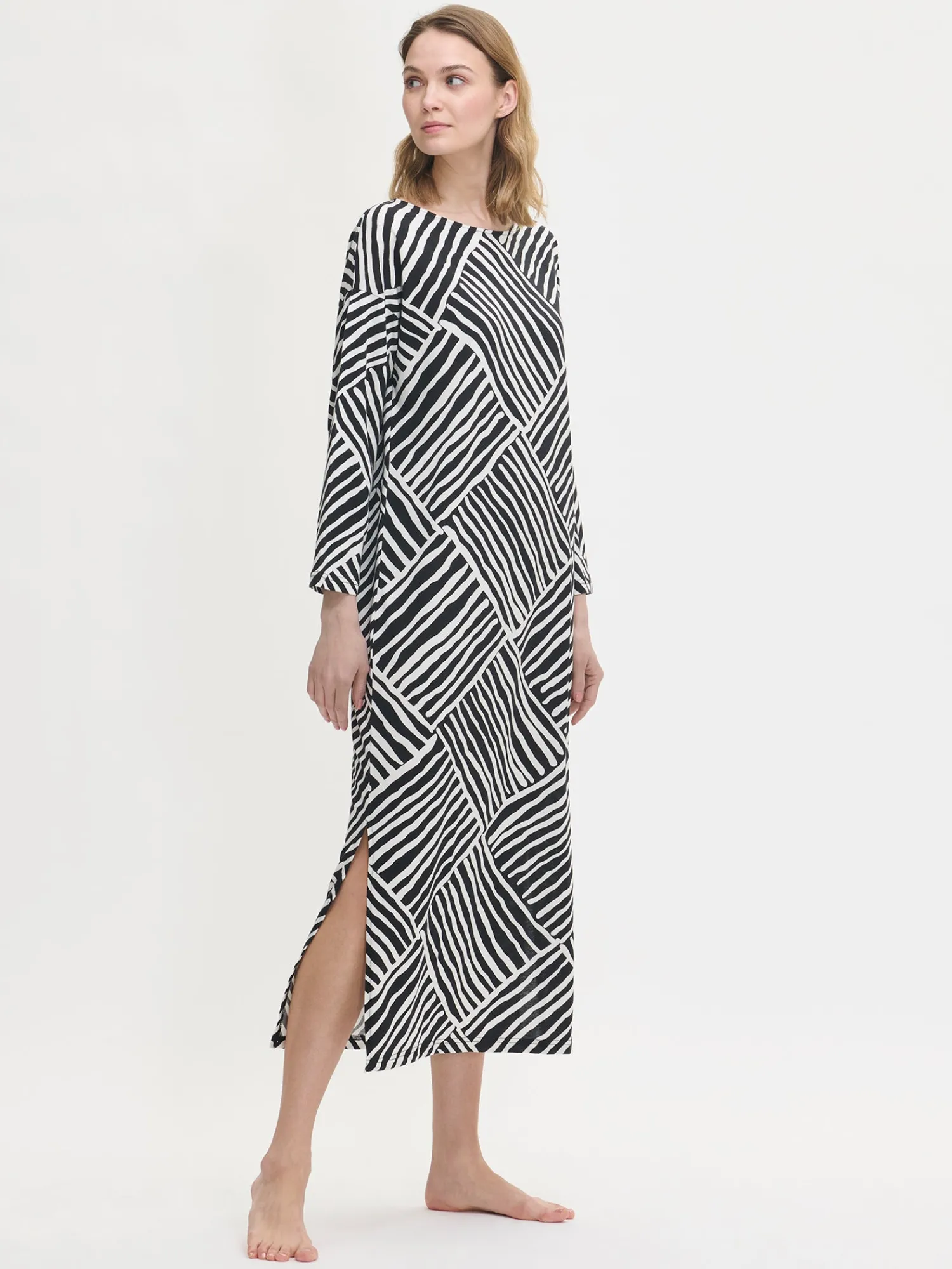 Naisten kuosillinen Kaisli-kaftaani ovaalilla pääntiellä. Kaftaanissa on pudotettu olka, täyspitkät hihat ja sivuhalkiot. Kaftaanin pituus koossa M on noin 130 cm. Materiaali on laadukasta, iholla miellyttävän pehmeältä tuntuvaa ja helppohoitoista puuvilla-modaalia, joka pysyy hyvänä pesusta toiseen.