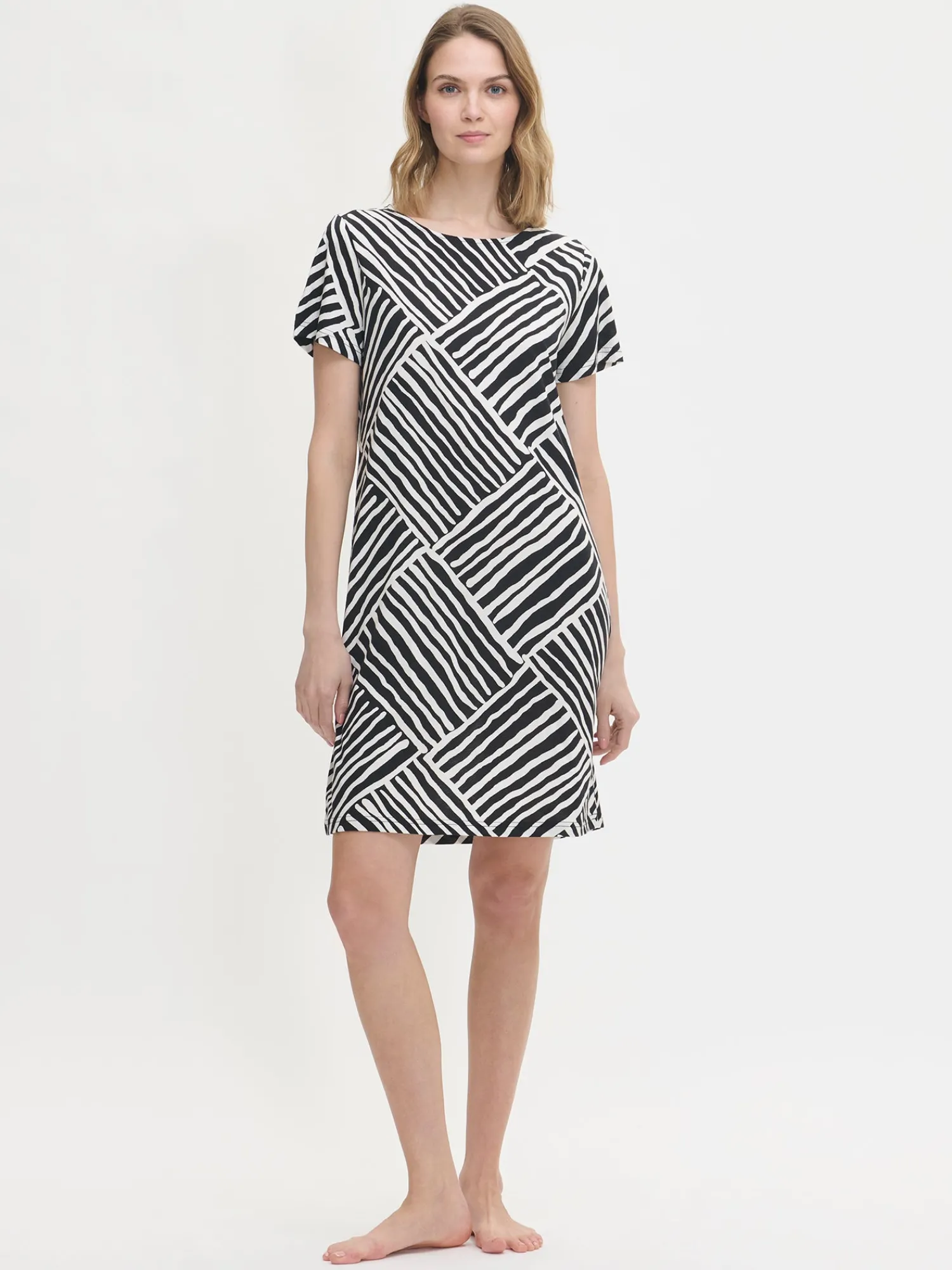 Naisten kuosillinen Kaisli-yöpaita lyhyillä hihoilla ja ovaalilla pääntiellä mustavalkoisessa värissä. Yöpaidan pituus koossa M on noin 95 cm. Materiaali on laadukasta, iholla miellyttävän pehmeältä tuntuvaa ja helppohoitoista puuvilla-modaalia, joka pysyy hyvänä pesusta toiseen.