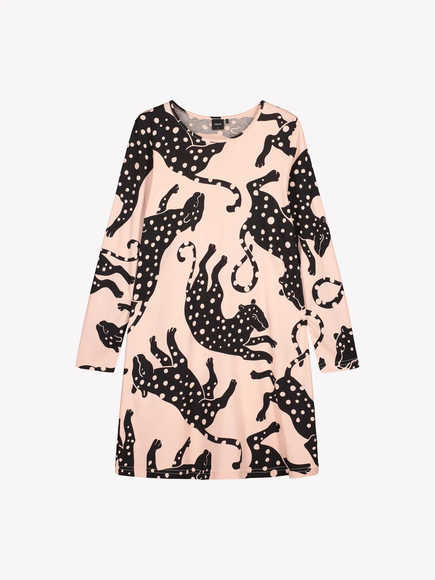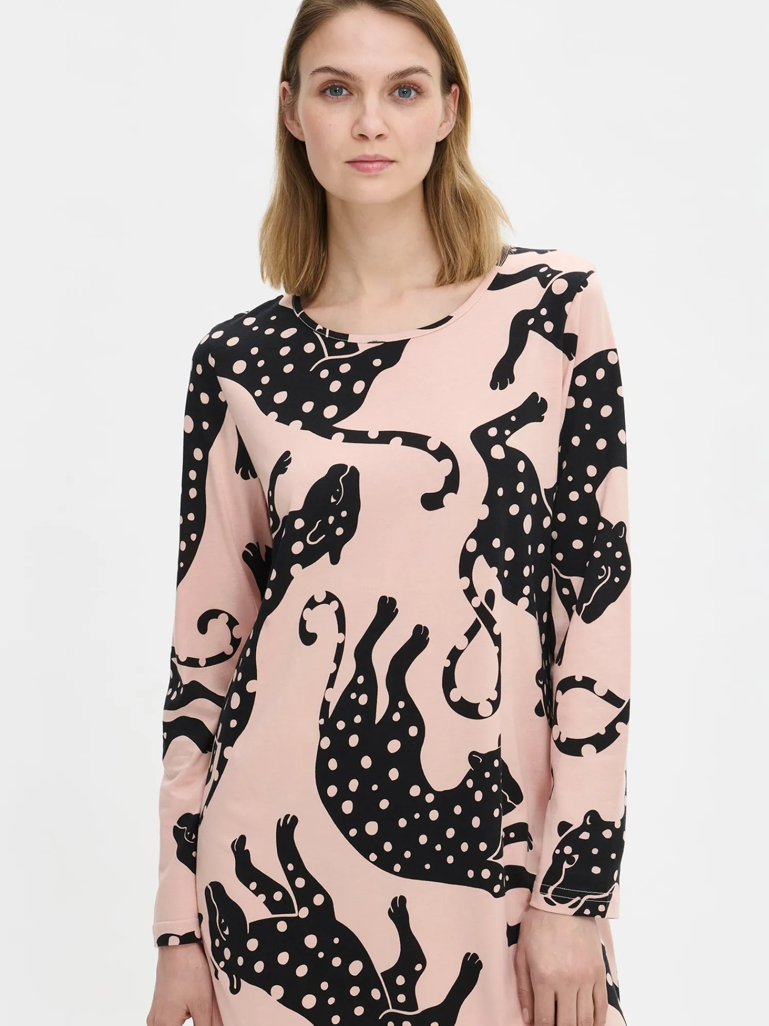 Naisten kuosillinen vaaleanpunainen Leonora-yöpaita pitkillä hihoilla ja pyöreällä pääntiellä. Yöpaidan pituus koossa M on noin 95 cm. Materiaali on laadukasta, iholla miellyttävän pehmeältä tuntuvaa ja helppohoitoista puuvilla-modaalia, joka pysyy hyvänä pesusta toiseen. Leikkisä kuosi ja klassinen malli tekevät tästä yöpaidasta mukavan valinnan rauhallisiin hetkiin kotona.