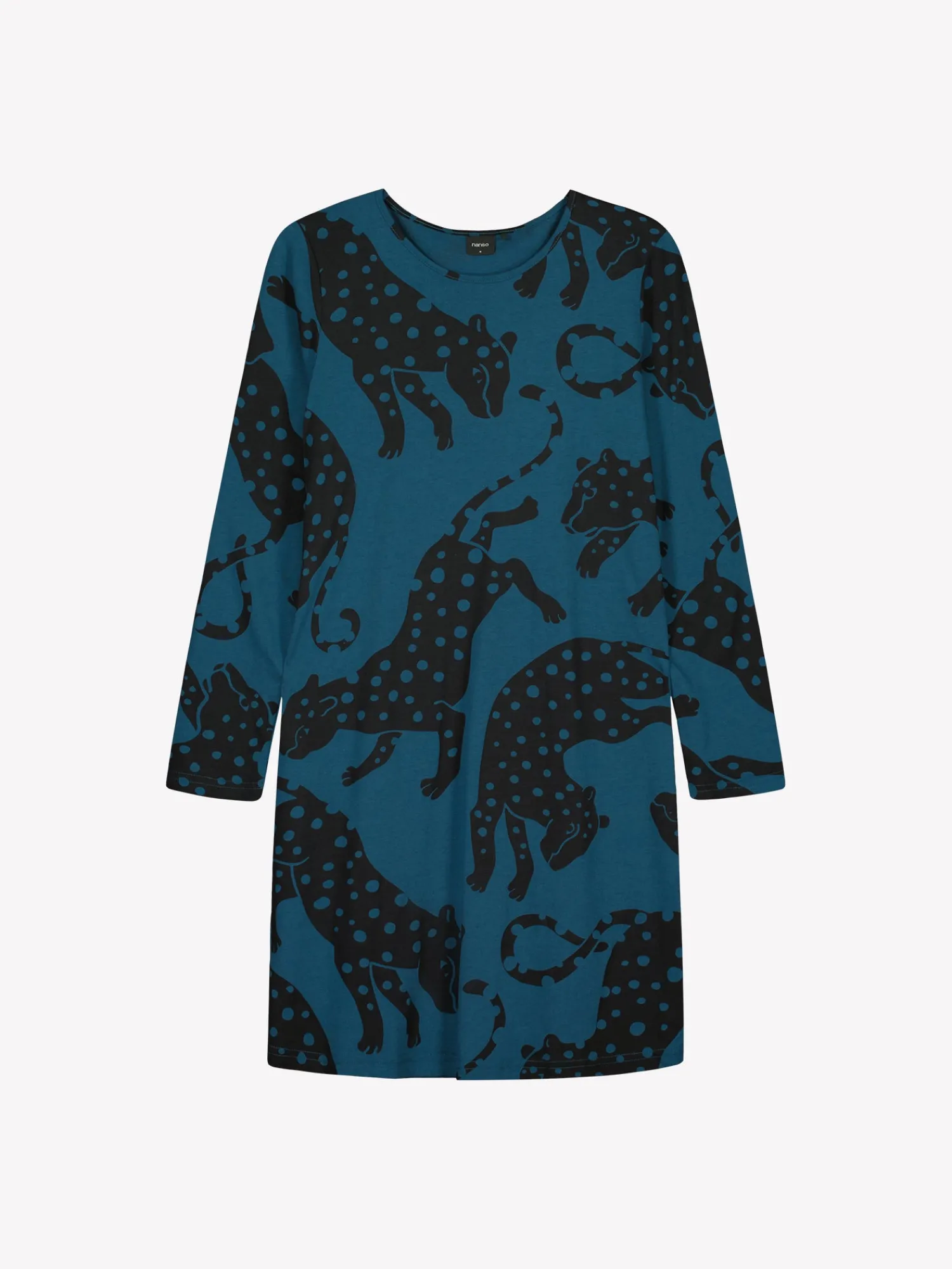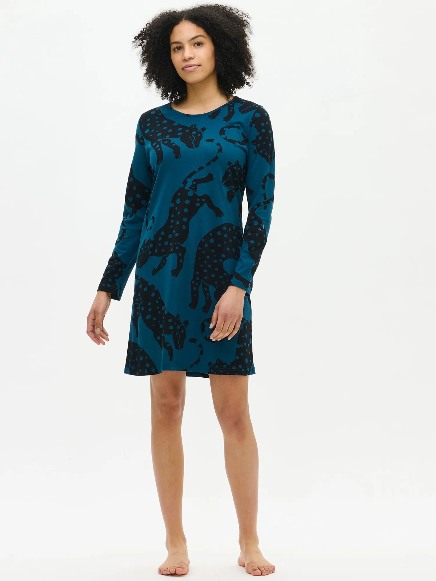 Naisten kuosillinen sininen Leonora-yöpaita pitkillä hihoilla ja pyöreällä pääntiellä. Yöpaidan pituus koossa M on noin 95 cm. Materiaali on laadukasta, iholla miellyttävän pehmeältä tuntuvaa ja helppohoitoista puuvilla-modaalia, joka pysyy hyvänä pesusta toiseen. Leikkisä kuosi ja klassinen malli tekevät tästä yöpaidasta mukavan valinnan rauhallisiin hetkiin kotona.