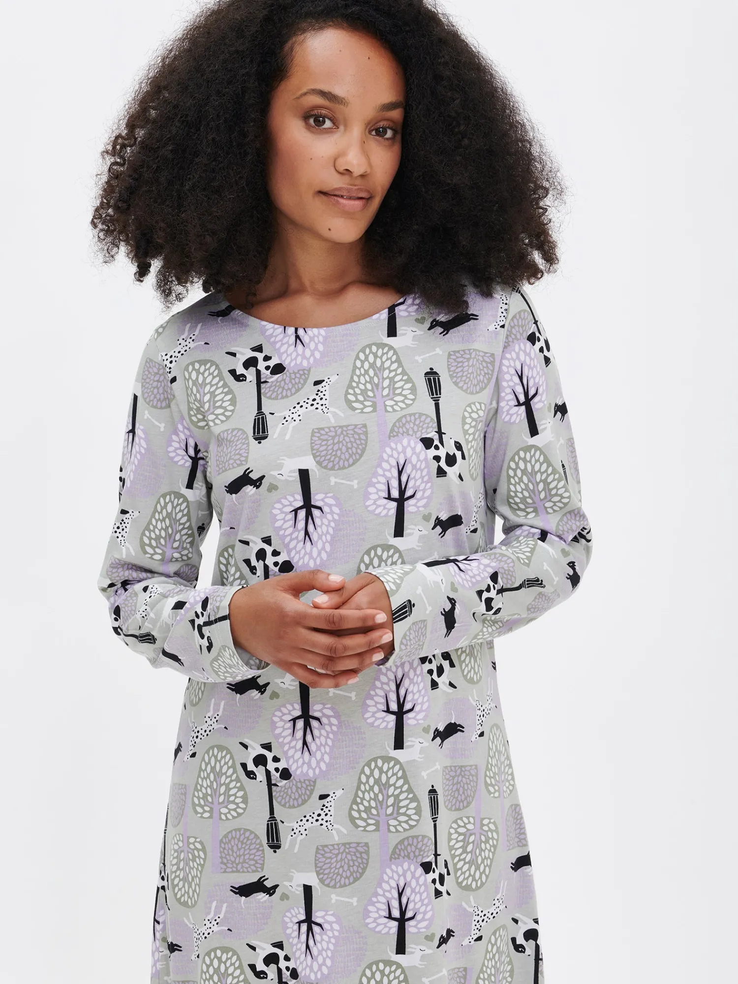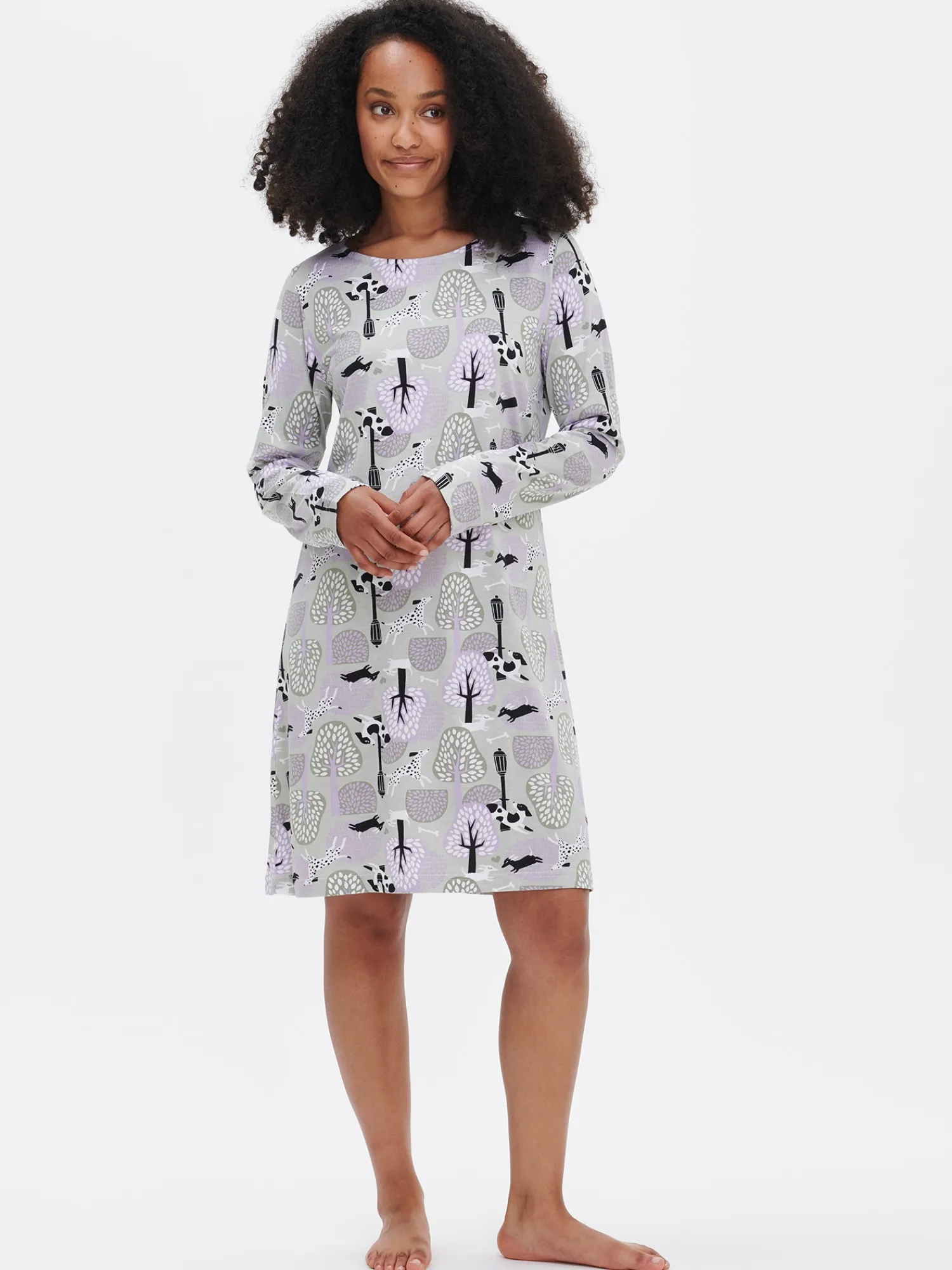 Naisten kuosillinen vihreä Luna-yöpaita pitkillä hihoilla ja ovaalilla pääntiellä. Yöpaidan pituus koossa M on noin 95 cm. Materiaali on laadukasta, iholla miellyttävän pehmeältä tuntuvaa ja helppohoitoista puuvilla-modaalia, joka pysyy hyvänä pesusta toiseen.