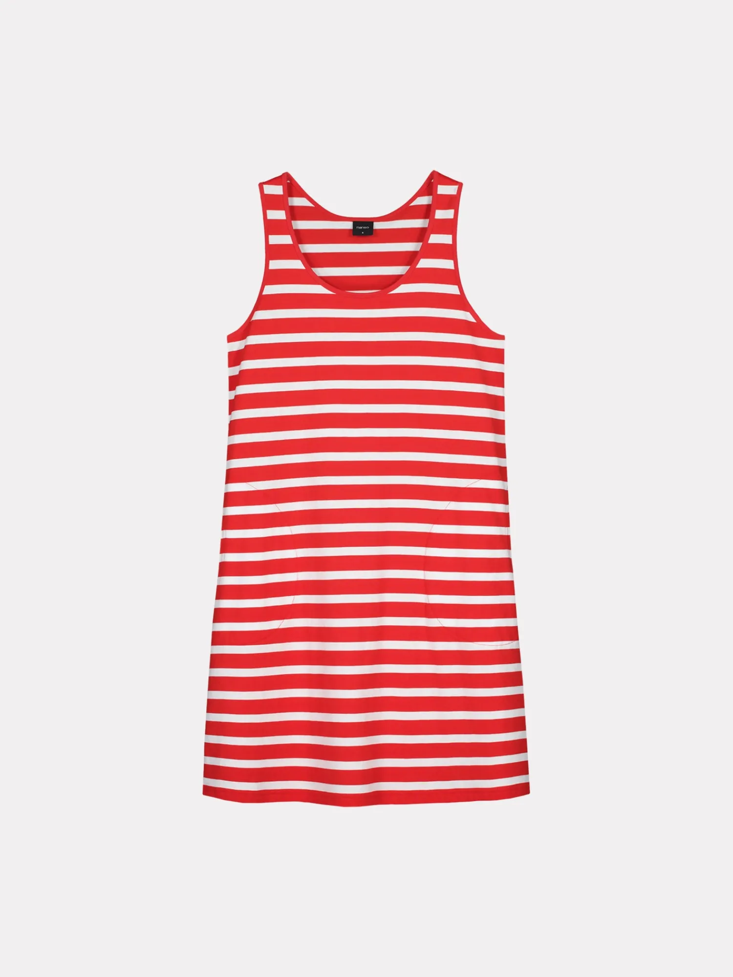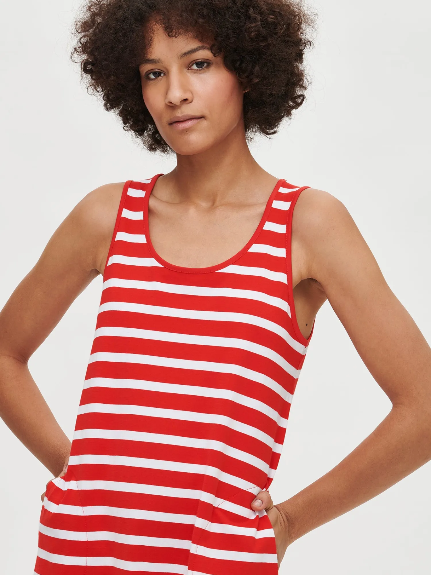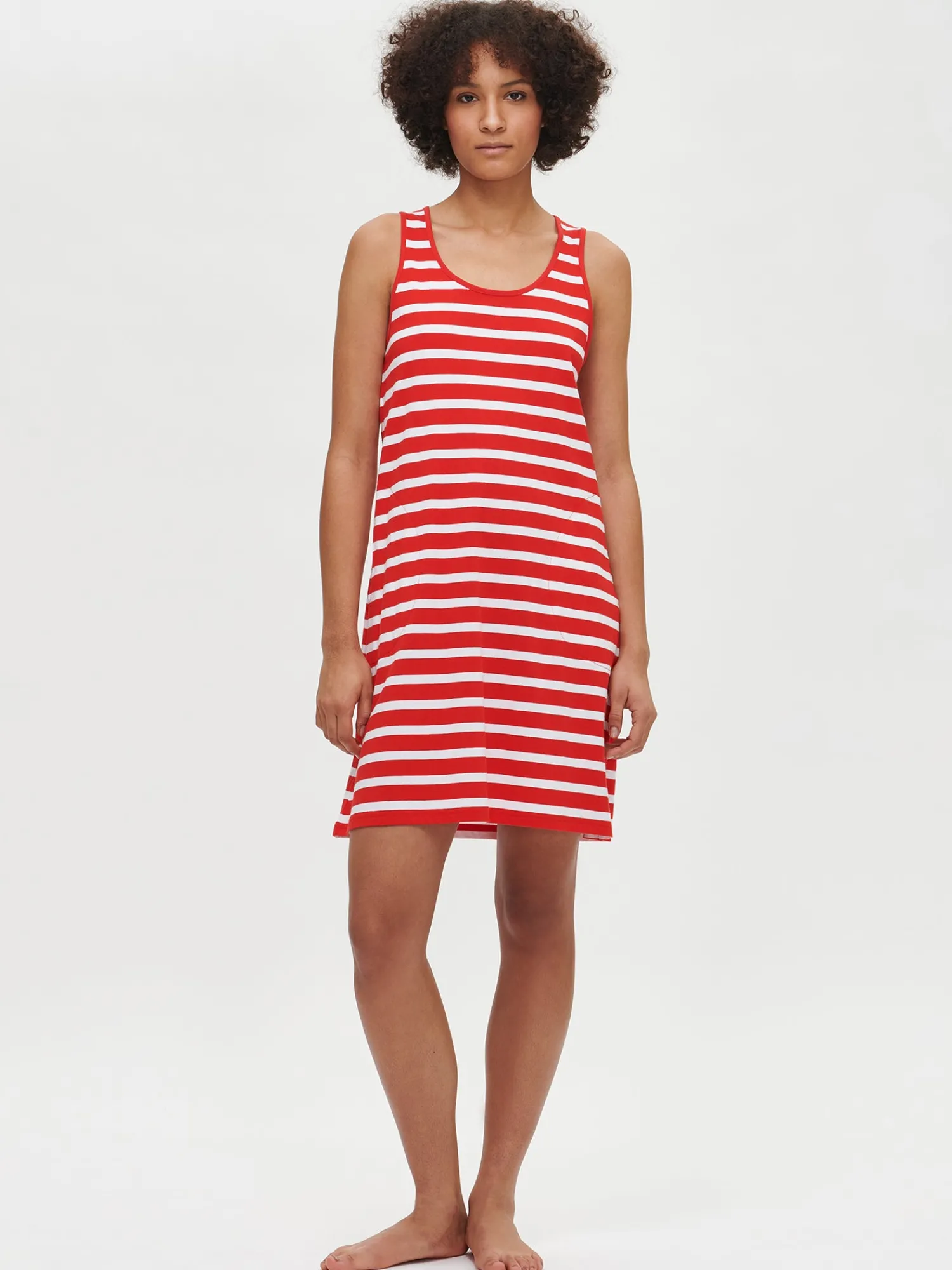 Naisten raidallinen punainen Maininki-yöpaita pyöreällä pääntiellä ja sivutaskuilla. Pääntie ja kädentiet on viimeistelty yksivärisellä kantilla. Hihattoman mekon pituus koossa M on noin 95 cm. Materiaali on laadukasta, iholla miellyttävän pehmeältä tuntuvaa ja helppohoitoista puuvillaa, joka pysyy hyvänä pesusta toiseen.