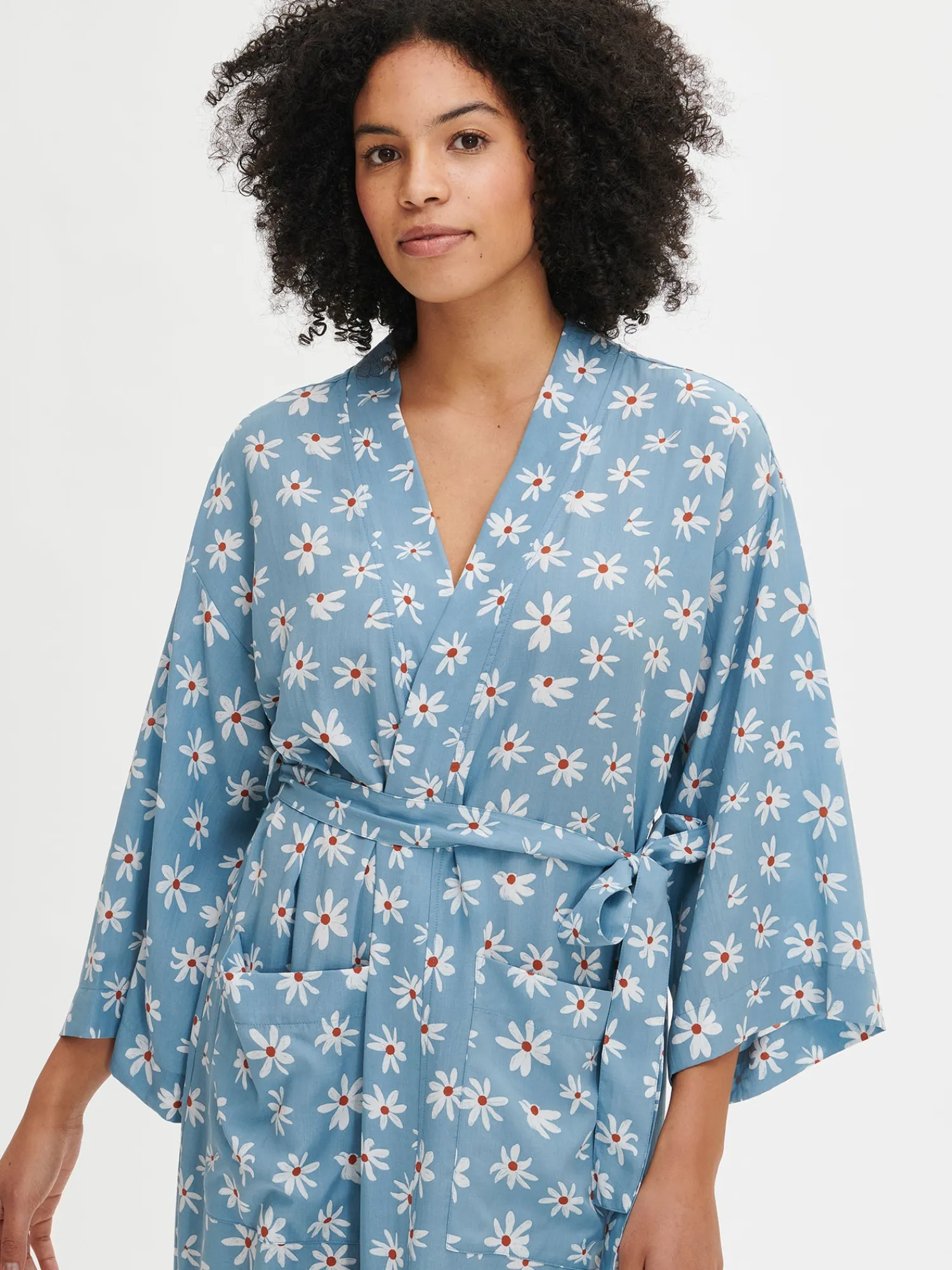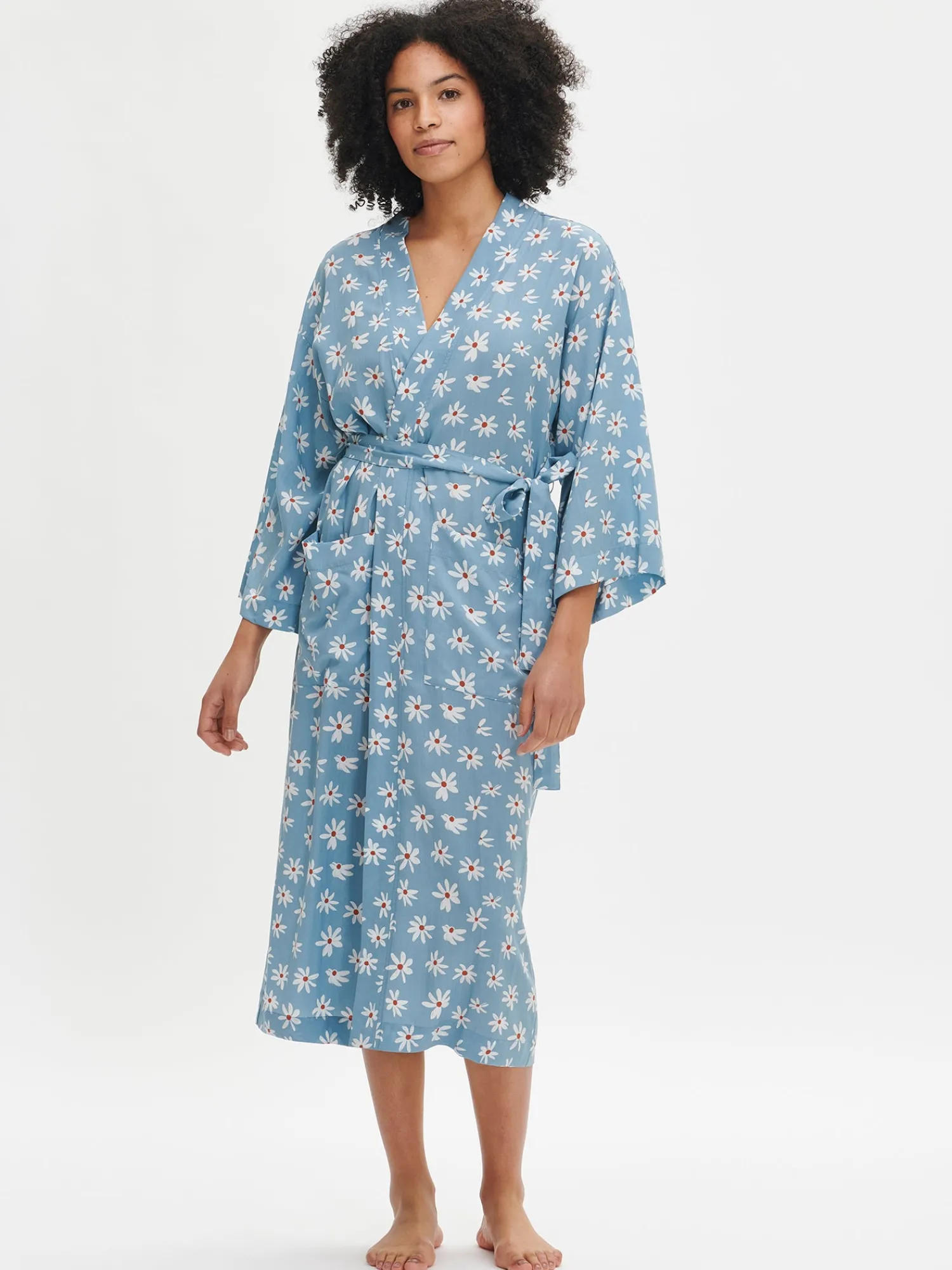 Naisten ihastuttava sininen Marketta-aamutakki. Aamutakin pääntie ja miehustan reunat on viimeistelty leveällä listalla. Aamutakin hihat ovat kimonomalliset ja suoralinjaiset. Edessä on päälleommellut taskut. Aamutakissa on sivuihin vyölenkeillä kiinnitetty vyö. Helma on viimeistelty leveällä taitteella. Aamutakin pituus koossa M on noin 125 cm. Materiaali on ylellistä ja ihanan kevyttä kudottua lyocell-popliinikangasta. Materiaalille on ominaista 3-5% kutistuminen ensimmäisessä pesussa.