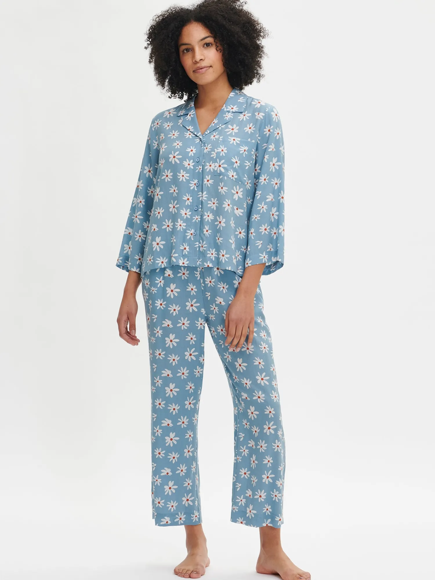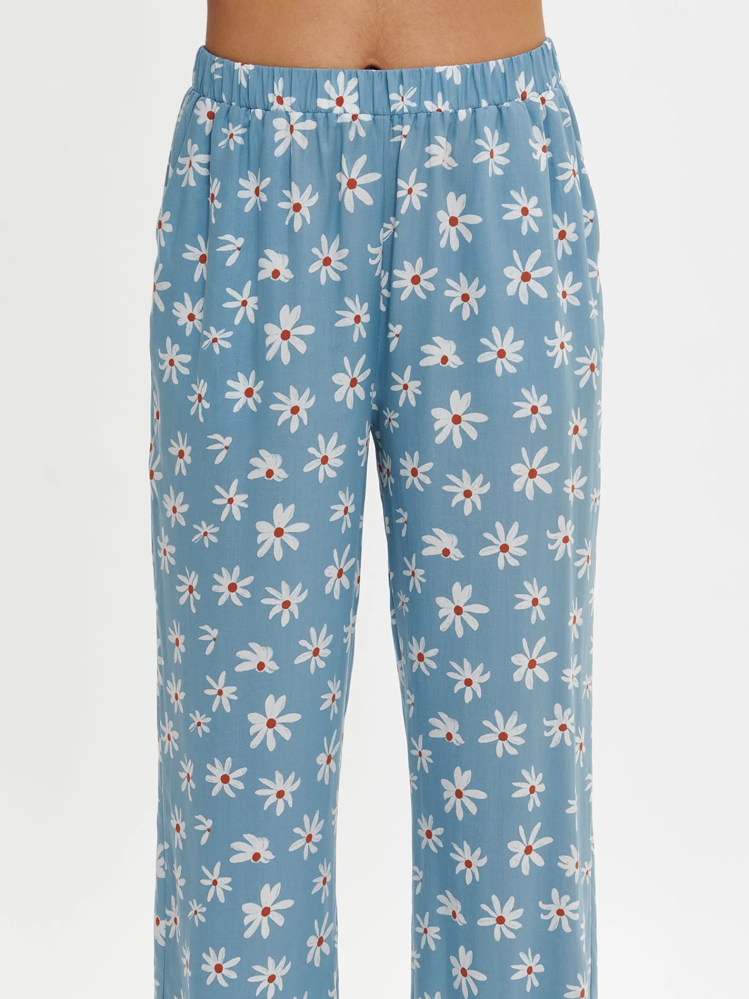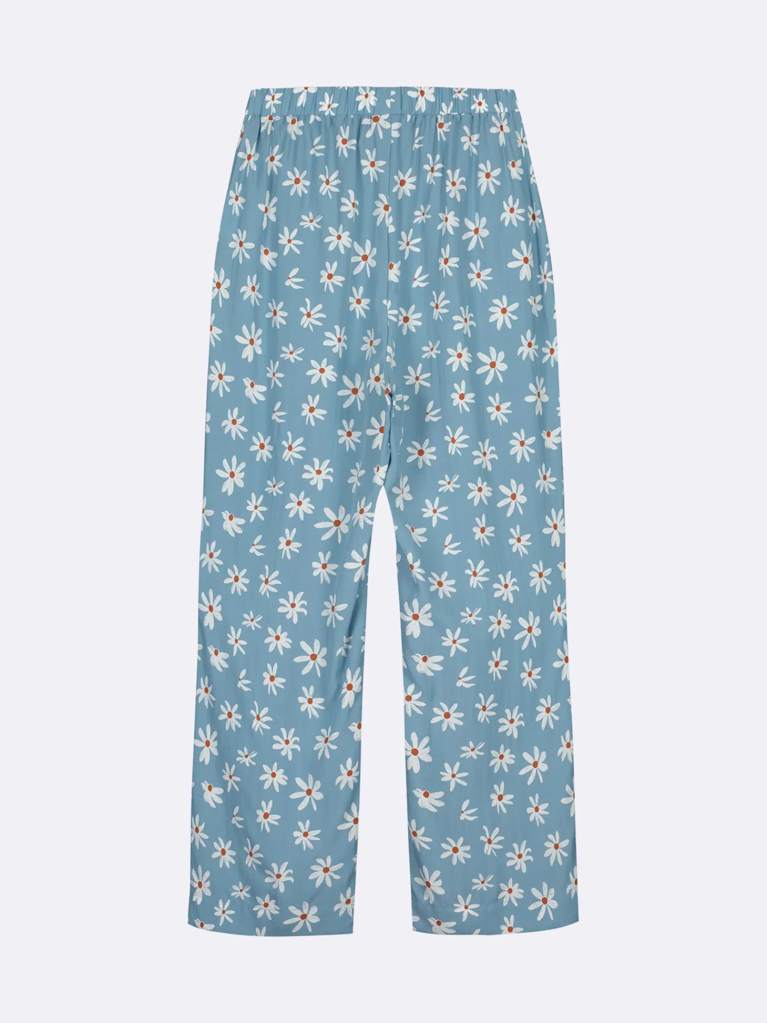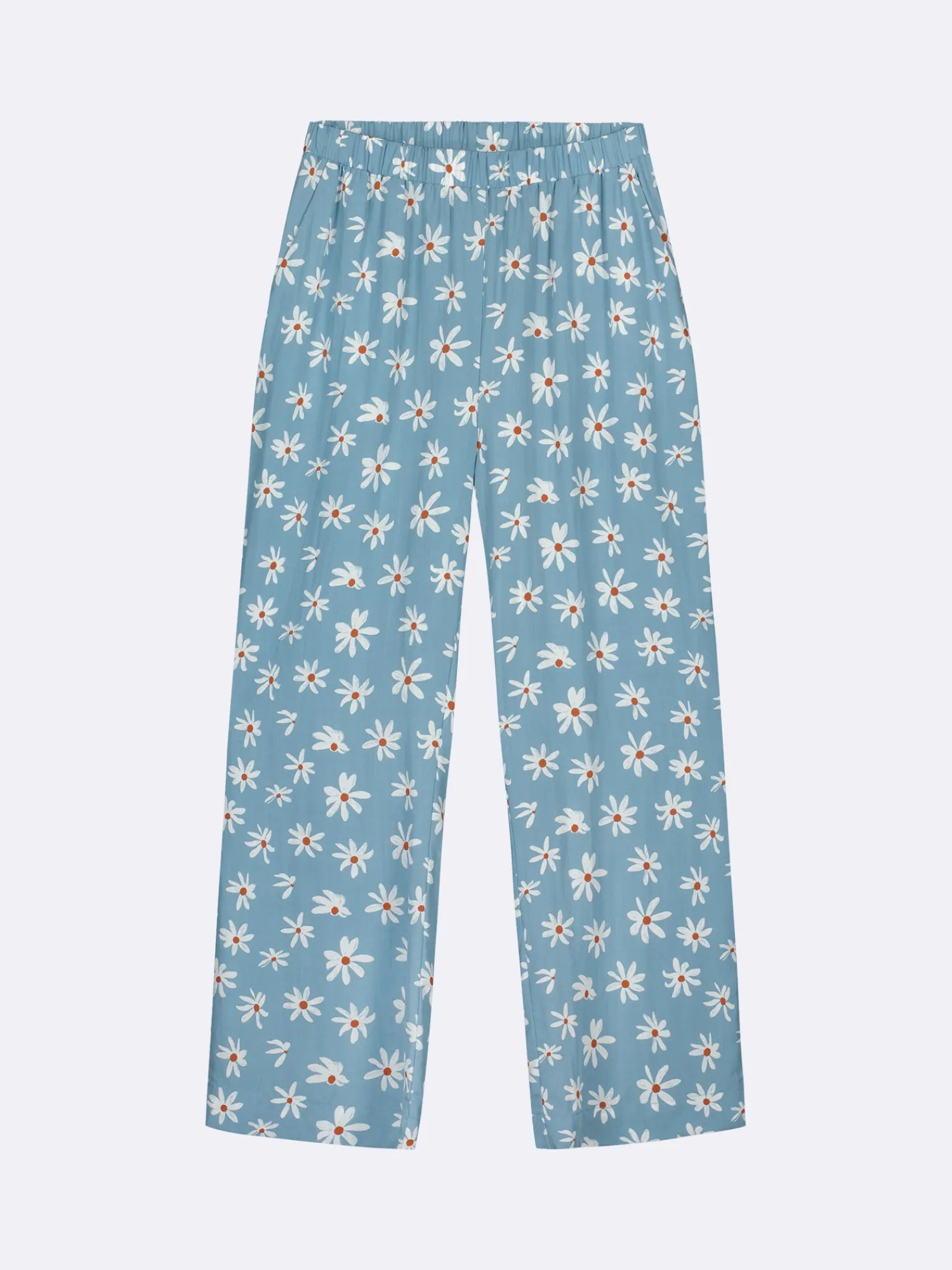 Naisten kuosilliset siniset Marketta-housut sivutaskuilla. Vyötäröllä on mukava ja siisti kuminauharakenne. Housuissa on suorat 7/8 pituiset lahkeet. Materiaali on ylellistä ja ihanan kevyttä kudottua lyocell-popliinikangasta. Materiaalille on ominaista 3-5% kutistuminen ensimmäisessä pesussa.