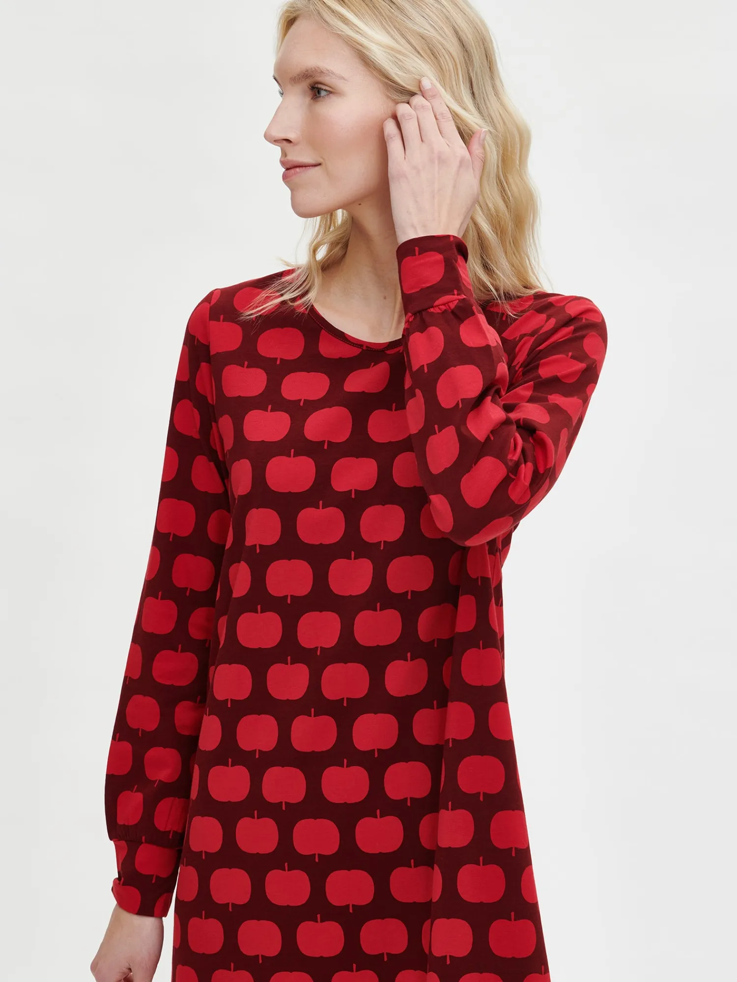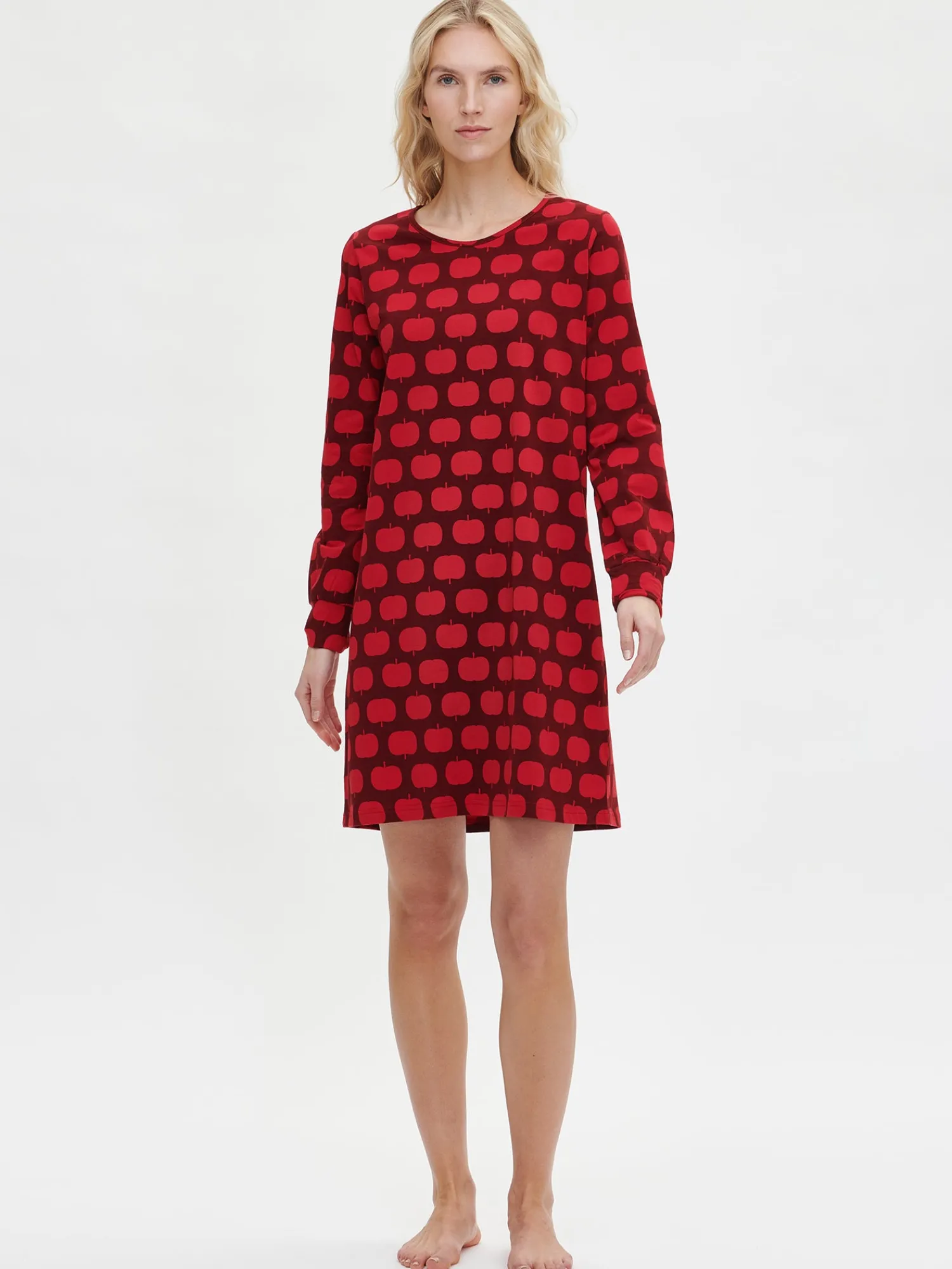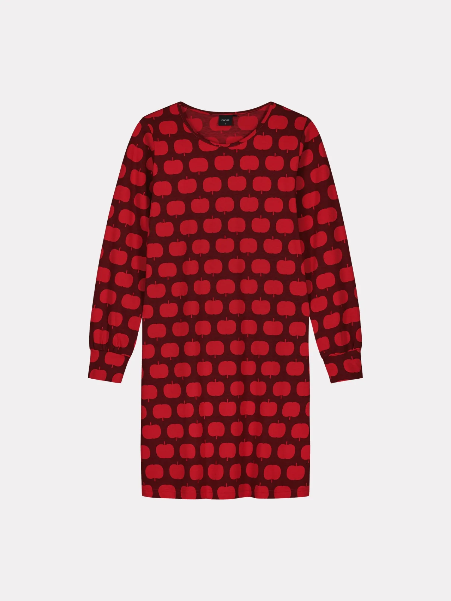 Naisten kauniskuosinen punainen Omppu-yöpaita pitkillä hihoilla ja pyöreällä pääntiellä. Hihat poimuttuvat kauniisti hihansuun leveän kaiteleen yläpuolelle. Yöpaidan pituus koossa M on noin 95 cm. Materiaali on laadukasta, iholla miellyttävän pehmeältä tuntuvaa ja helppohoitoista puuvilla-elastaania, joka pysyy hyvänä pesusta toiseen.