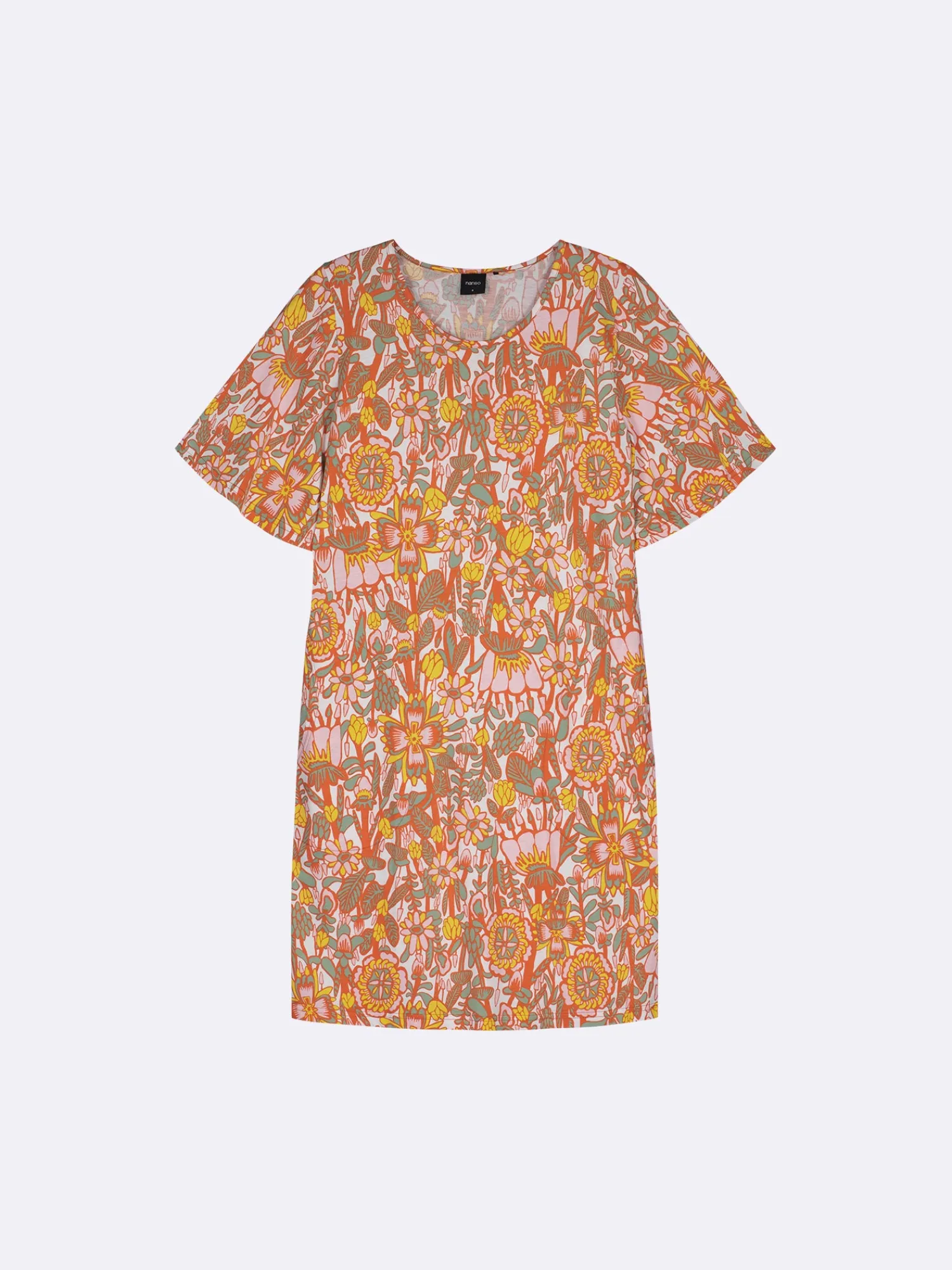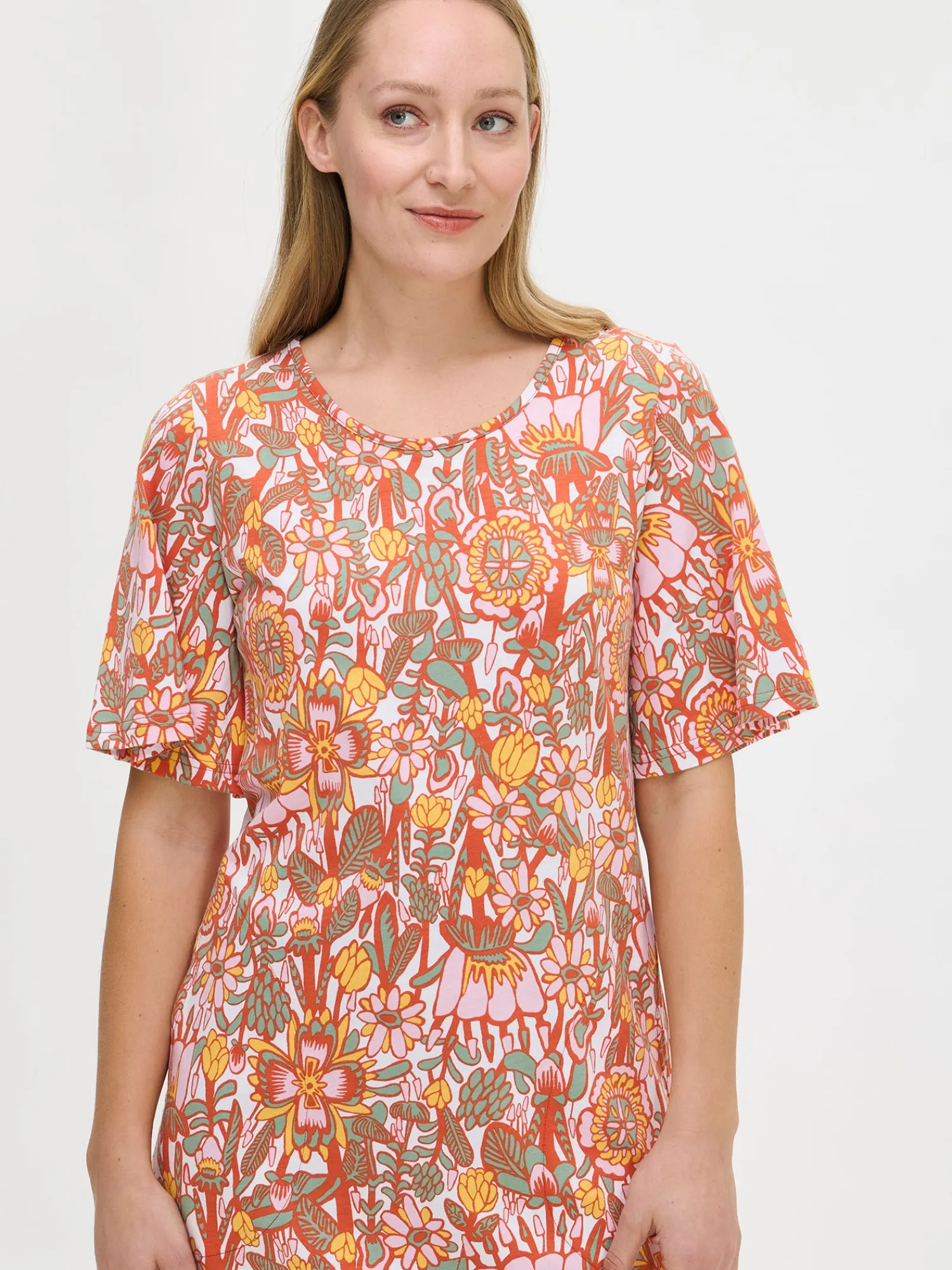 Naisten kuosillinen monivärinen Oodi-yöpaita lyhyillä kellotetuilla hihoilla, pyöreällä pääntiellä ja sivutaskuilla. Yöpaidan pituus koossa M on noin 95 cm. Materiaali on laadukasta, iholla miellyttävän pehmeältä tuntuvaa ja helppohoitoista puuvilla-modaali-neulosta, joka pysyy hyvänä pesusta toiseen. Täydellinen valinta rentoihin öihin, joissa mukavuus ja tyylikkyys yhdistyvät.