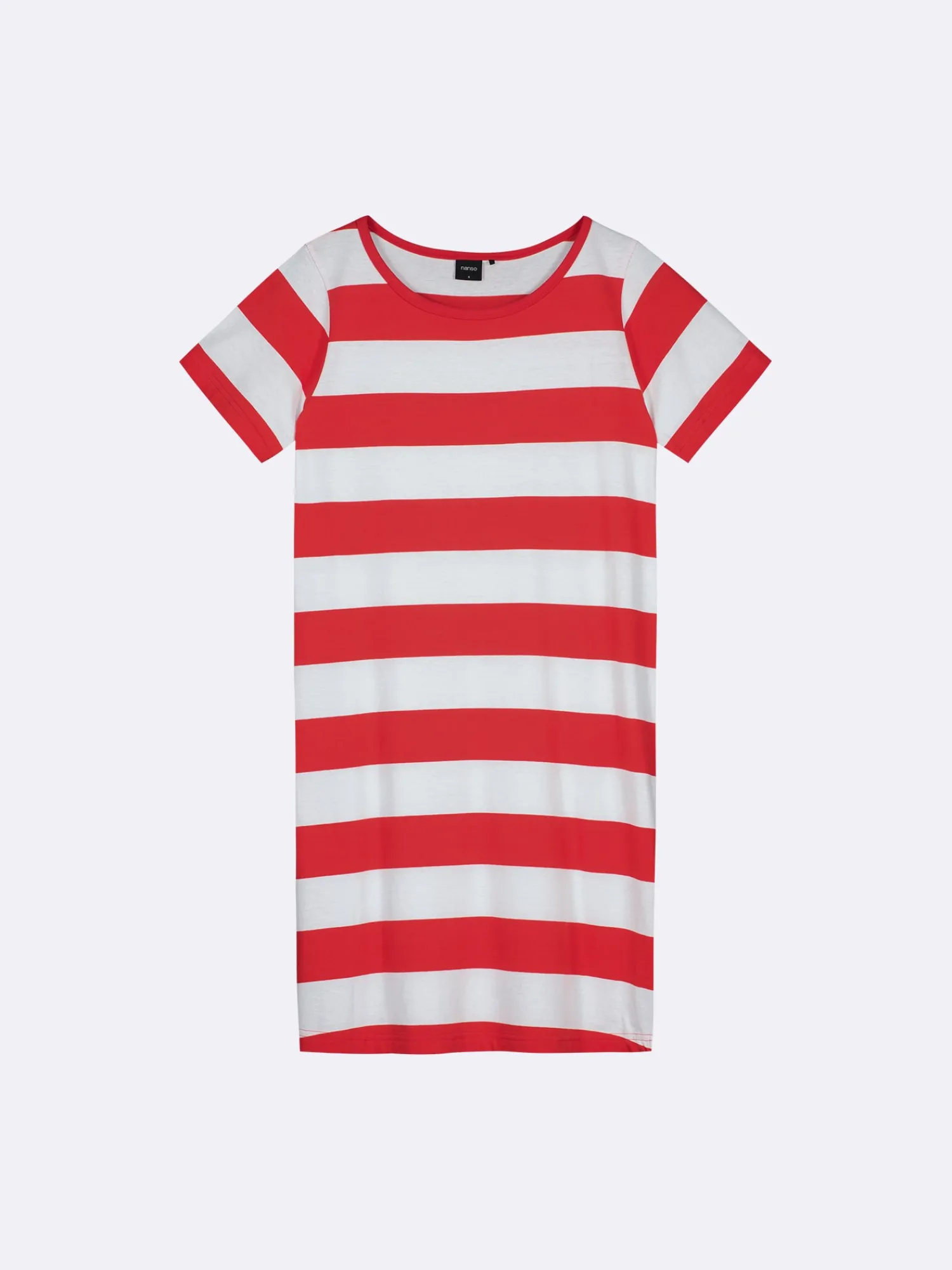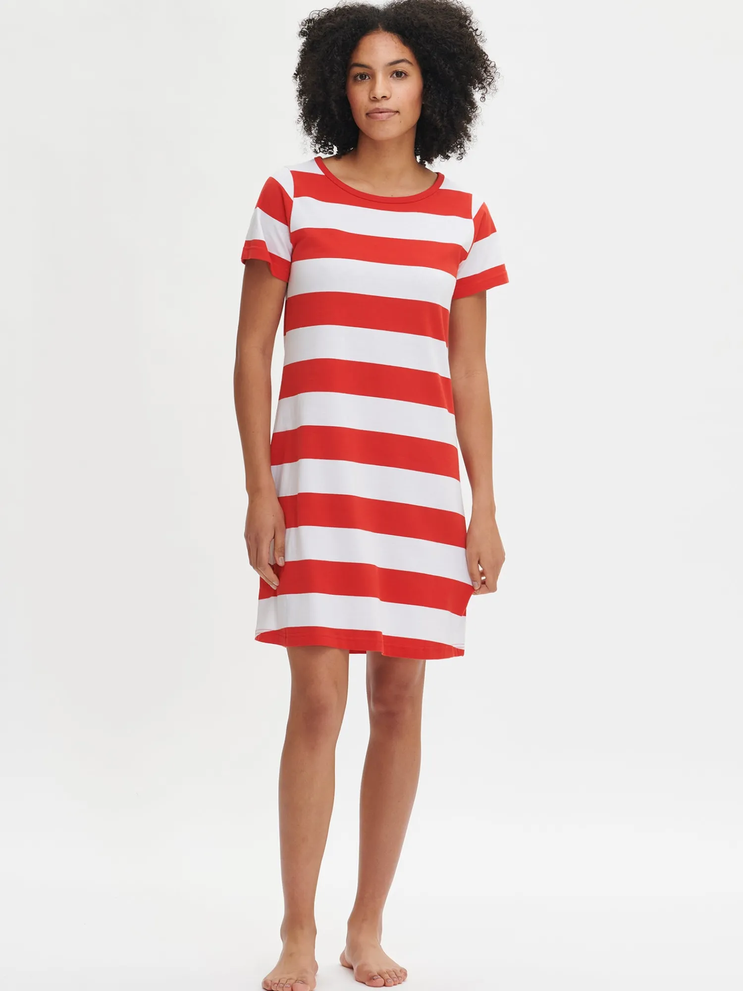 Naisten raidallinen Palkki-yöpaita lyhyillä hihoilla ja ovaalilla pääntiellä. Yöpaidan pituus koossa M on noin 95 cm. Materiaali on laadukasta, iholla miellyttävän pehmeältä tuntuvaa ja helppohoitoista puuvillaneulosta, joka pysyy hyvänä pesusta toiseen. Neulos on valmistettu sertifioidusta puuvillasta.