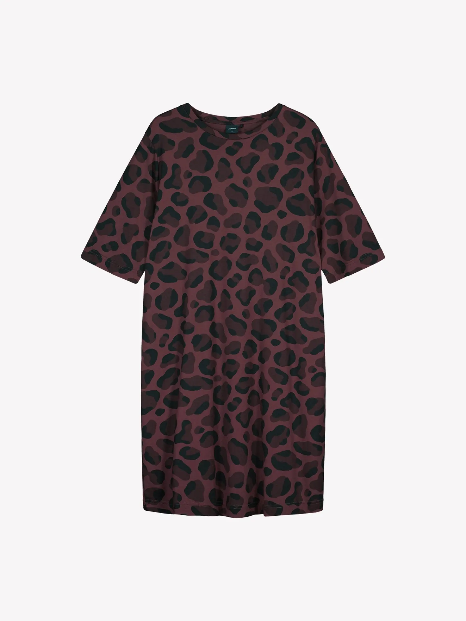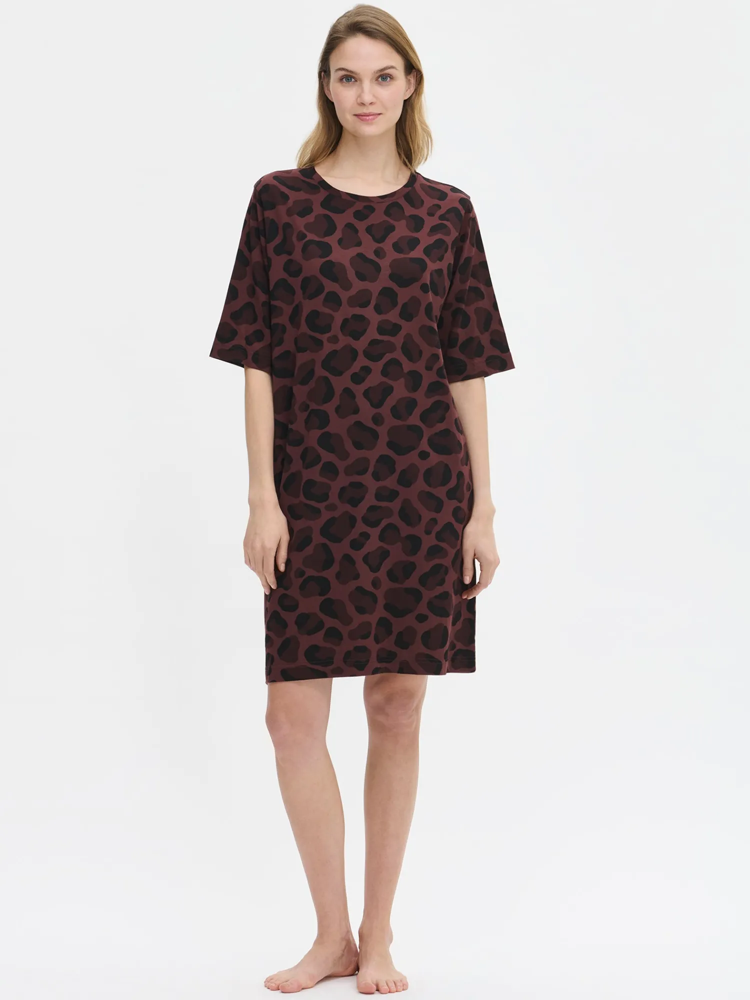 Naisten kuosillinen ruskea suoralinjainen Pantteri-yöpaita puoli pitkillä hihoilla ja pyöreällä pääntiellä. Yöpaidan pituus koossa M on noin 95 cm. Materiaali on laadukasta, iholla miellyttävän pehmeältä tuntuvaa ja helppohoitoista puuvilla-modaalia, joka pysyy hyvänä pesusta toiseen. Mukava ja rento valinta rauhallisiin kotihetkiin tai levollisiin uniin. Näyttävä Pantteri-kuosi tuo pehmeyden keskelle iloa.