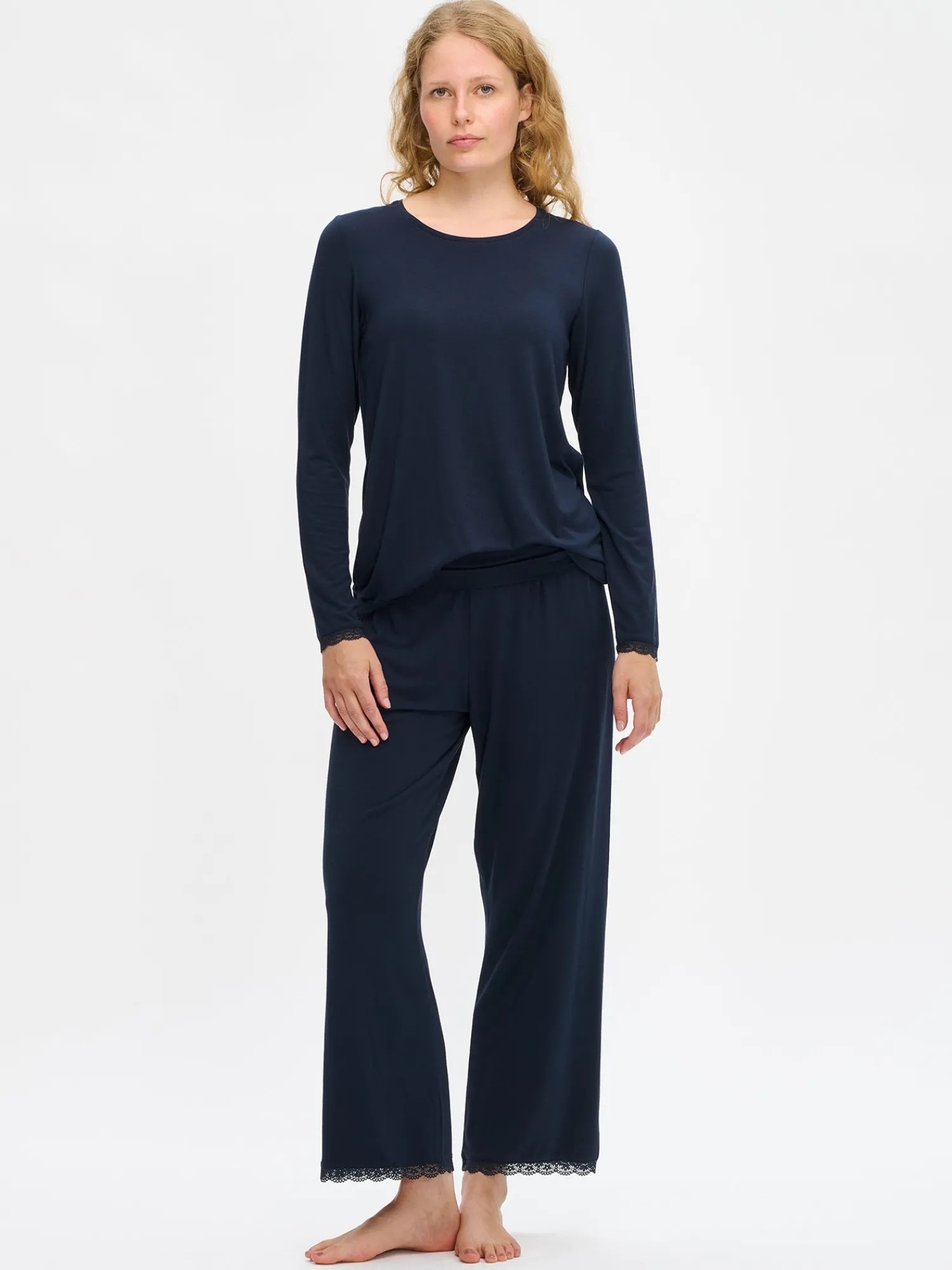 Naisten ylellisen pehmeät Pitsi-housut tummansinisenä. Housuissa on mukava vyötärörakenne leveällä ja tukevalla tuplakaistaleella. 7/8 mittaisten housujen lahkeensuita koristaa ajaton pitsinauha. Materiaali on laadukasta, iholla silkkisen pehmeältä tuntuvaa mikromodaali-elastaania.