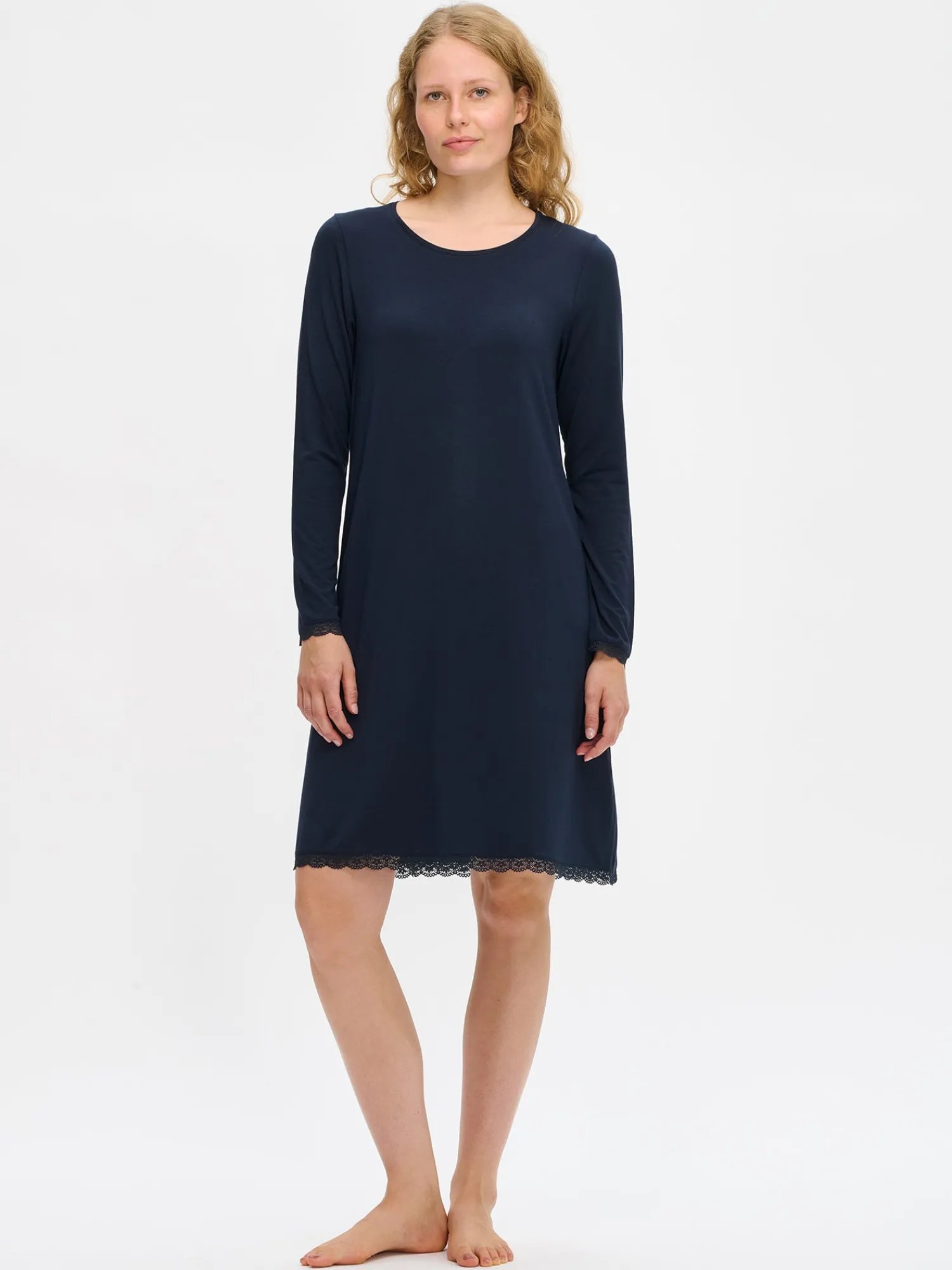 Naisten ylellisen pehmeä Pitsi-yöpaita täyspitkillä hihoilla ja pyöreällä pääntiellä tummansinisessä värissä. Hihansuita ja helmaa koristaa ajaton pitsinauha. Yöpaidan pituus koossa M on noin 95 cm. Materiaali on laadukasta, iholla silkkisen pehmeältä tuntuvaa mikromodaali-elastaania.