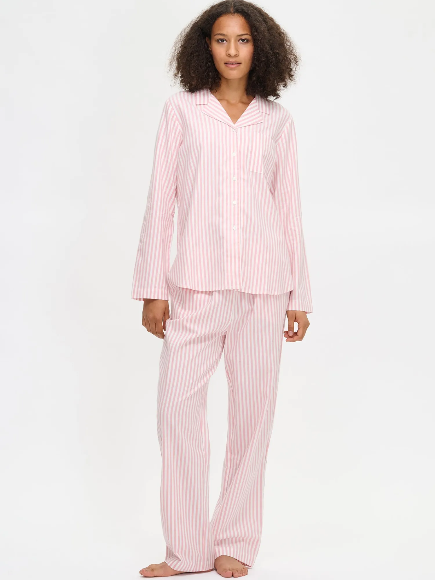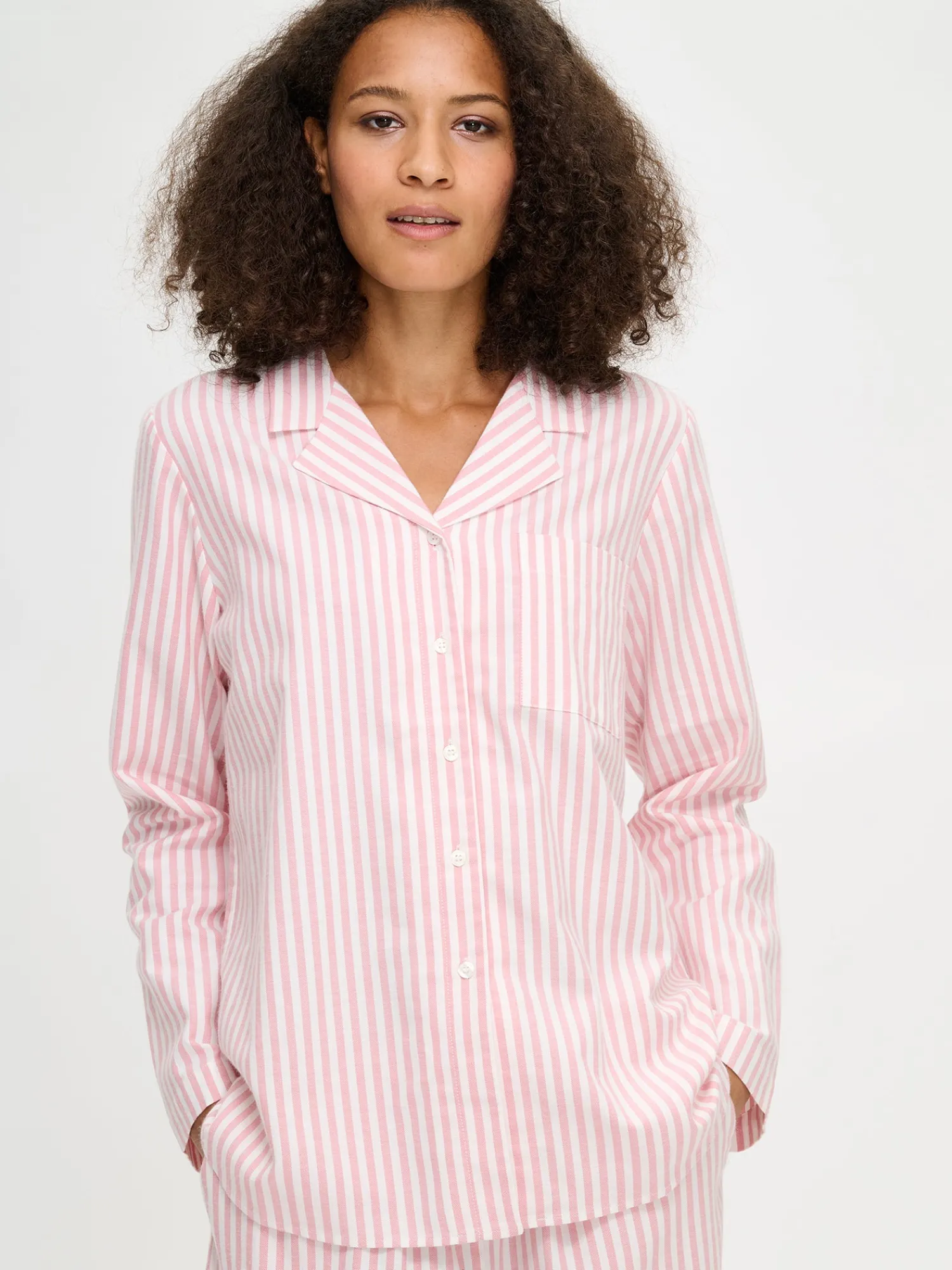 Naisten raidallinen Polka-pyjamapaita vaaleanpunaisessa värissä. Pitkähihaisessa pyjamapaidassa on kauniisti muotoiltu kaulus, nappilista ja pyöristetty helma. Puseron pituus koossa M on noin 70 cm. Materiaali on pehmeää ja miellyttävän tuntuista puuvillaflanellikangasta. Materiaalille on ominaista 3-5% kutistuminen ensimmäisessä pesussa.