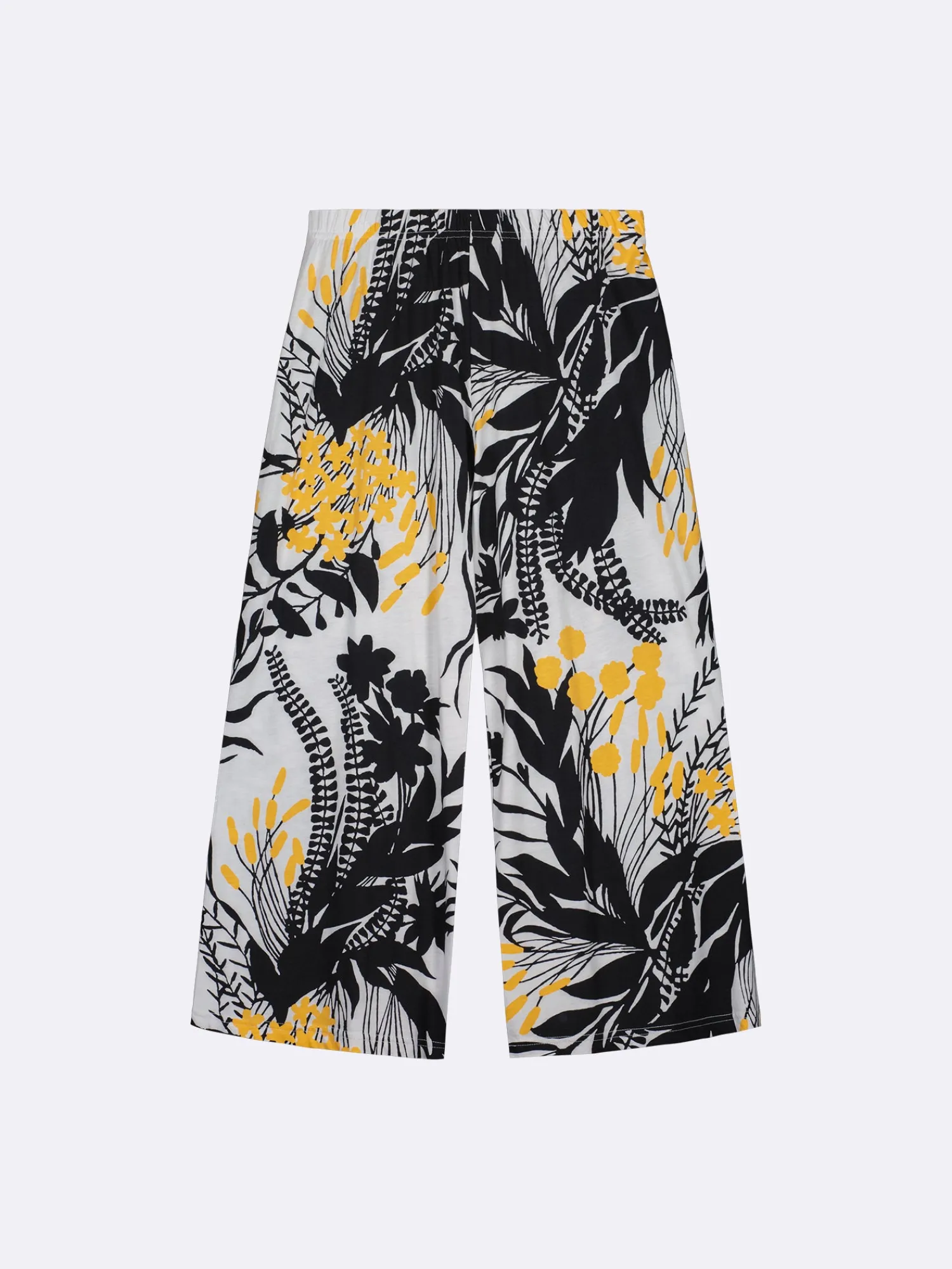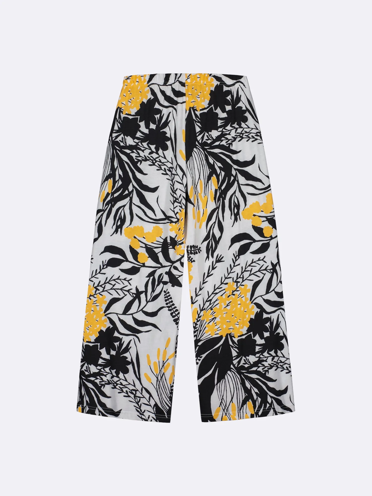 Naisten kuosilliset keltaiset Puutarha-lounge-housut. Rennot, leveälahkeiset housut ovat tyylikkäästi 7/8-pituiset. Materiaali on laadukasta, iholla miellyttävän pehmeältä tuntuvaa ja helppohoitoista puuvilla-modaalia, joka pysyy hyvänä pesusta toiseen. Ihastuttava kuosi ja leveät lahkeet tekevät näistä housuista täydellisen valinnan rentoihin hetkiin kotona.