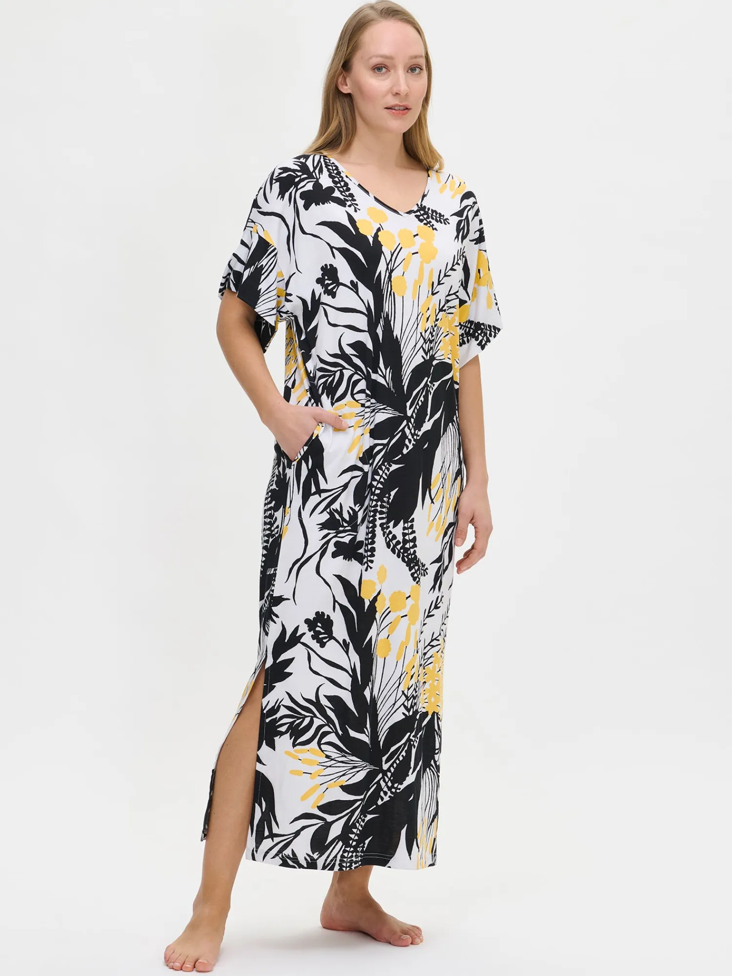 Naisten kuosillinen keltainen Puutarha-kaftaani V-pääntiellä. Kaftaanissa on sivutaskut ja sivuhalkiot. Lyhythihaisen kaftaanin pituus koossa M on noin 130 cm. Materiaali on laadukasta, iholla miellyttävän pehmeältä tuntuvaa ja helppohoitoista puuvilla-modaalia, joka pysyy hyvänä pesusta toiseen. Kaftaanissa on kaunis kuvio, joka tuo kesäistä raikkautta ja tyyliä.