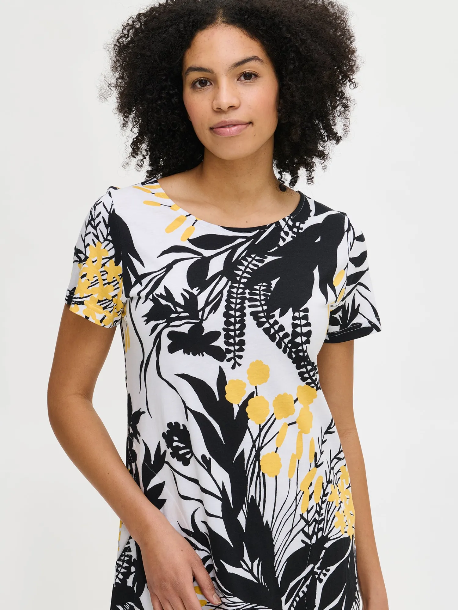 Naisten kuosillinen keltainen Puutarha-yöpaita lyhyillä hihoilla, sivutaskuilla ja ovaalilla pääntiellä. Yöpaidan pituus koossa M on noin 95 cm. Materiaali on laadukasta, iholla miellyttävän pehmeältä tuntuvaa ja helppohoitoista puuvilla-modaalia, joka pysyy hyvänä pesusta toiseen. Tämä kaunis kuosi tuo raikkautta ja tyyliä jokaiseen yöhön, täydellinen valinta rentoihin ja huolettomiin hetkiin kotona.