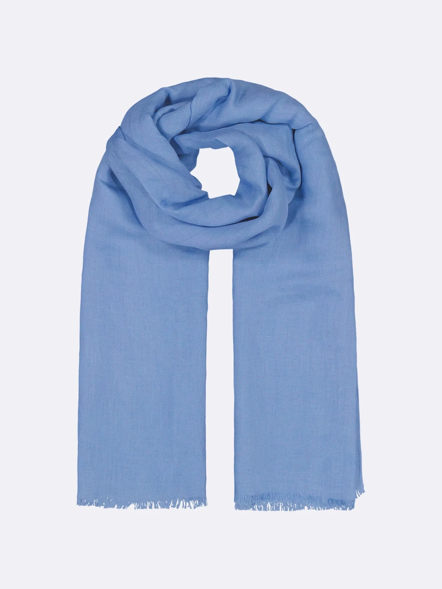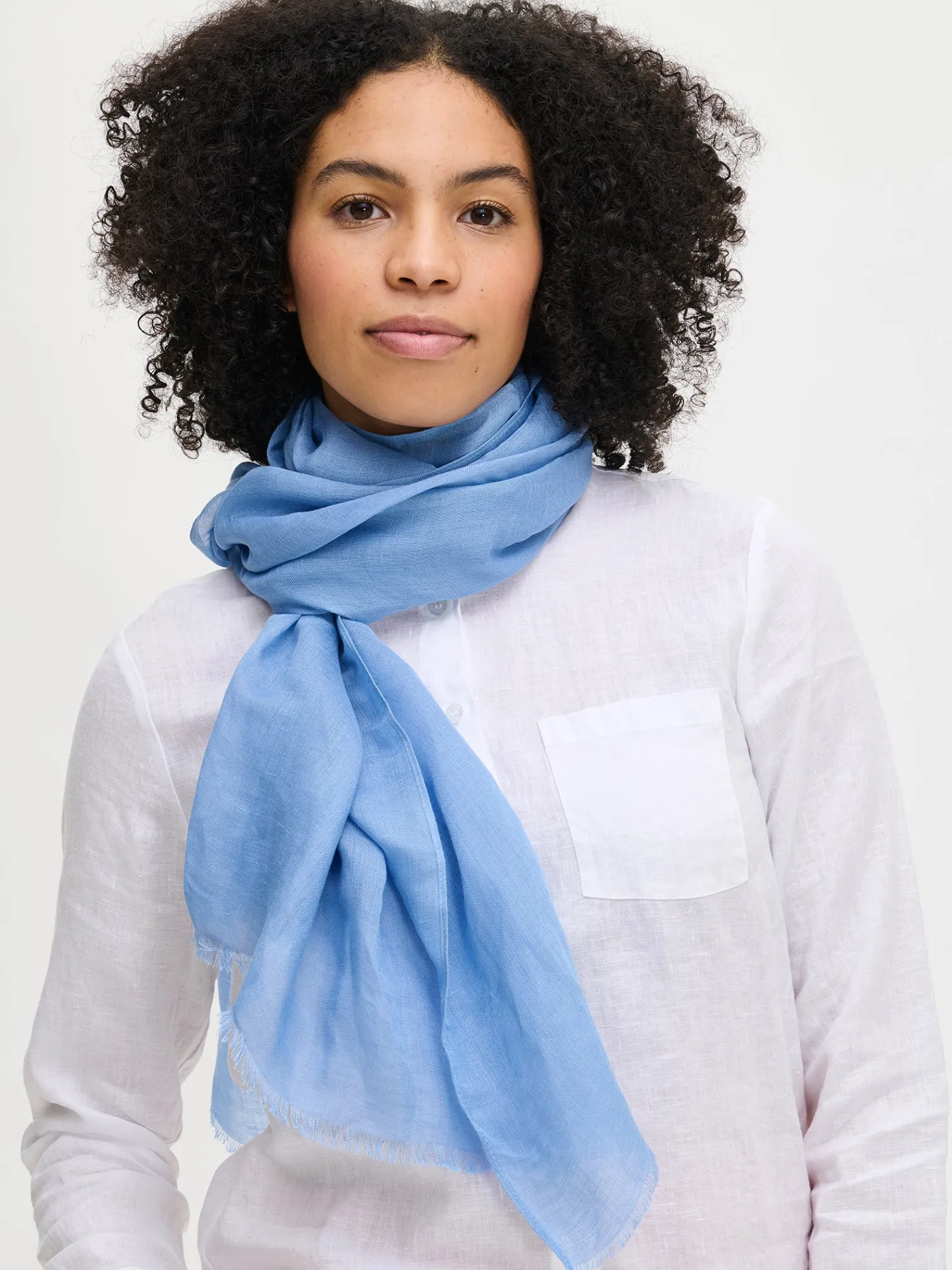 Naisten sininen Hilma-huivi. Tyylikäs yksivärinen huivi sopii jokaiseen asuun. Huivin materiaali on ohutta ja kevyttä pellava-viskoosi -kangasta. Huivin päissä on lyhyet hapsut. Huivin koko on noin 70 cm x 200 cm.