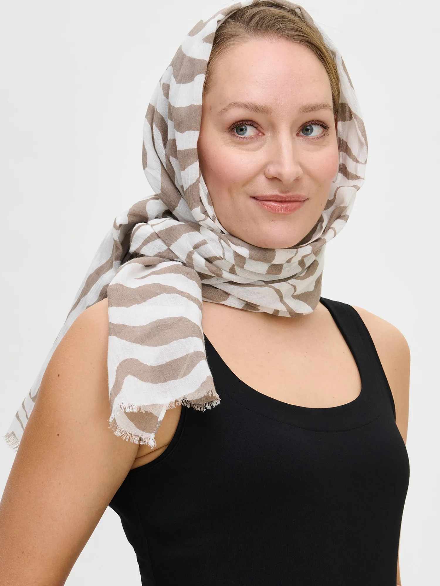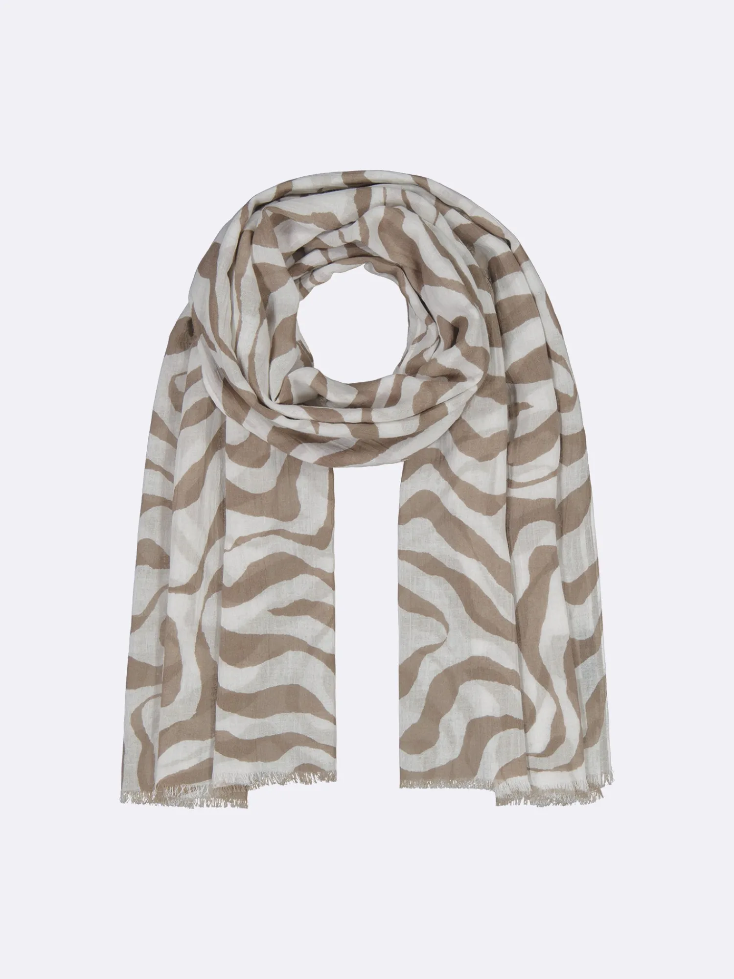 Naisten kuviollinen beige Savanna-huivi. Kevyt huivi on ihana asuste kesään. Voit pukea sen monella tavalla ja se on luottoasuste niin hellepäiviin kuin viileämpiin kesäiltoihin. Huivin materiaali on ohutta ja kevyttä puuvilla-pellava -kangasta. Huivin pitkät sivut on huoliteltu kapealla päärmeellä ja päissä on lyhyet hapsut. Huivin koko on noin 70 cm x 180 cm.