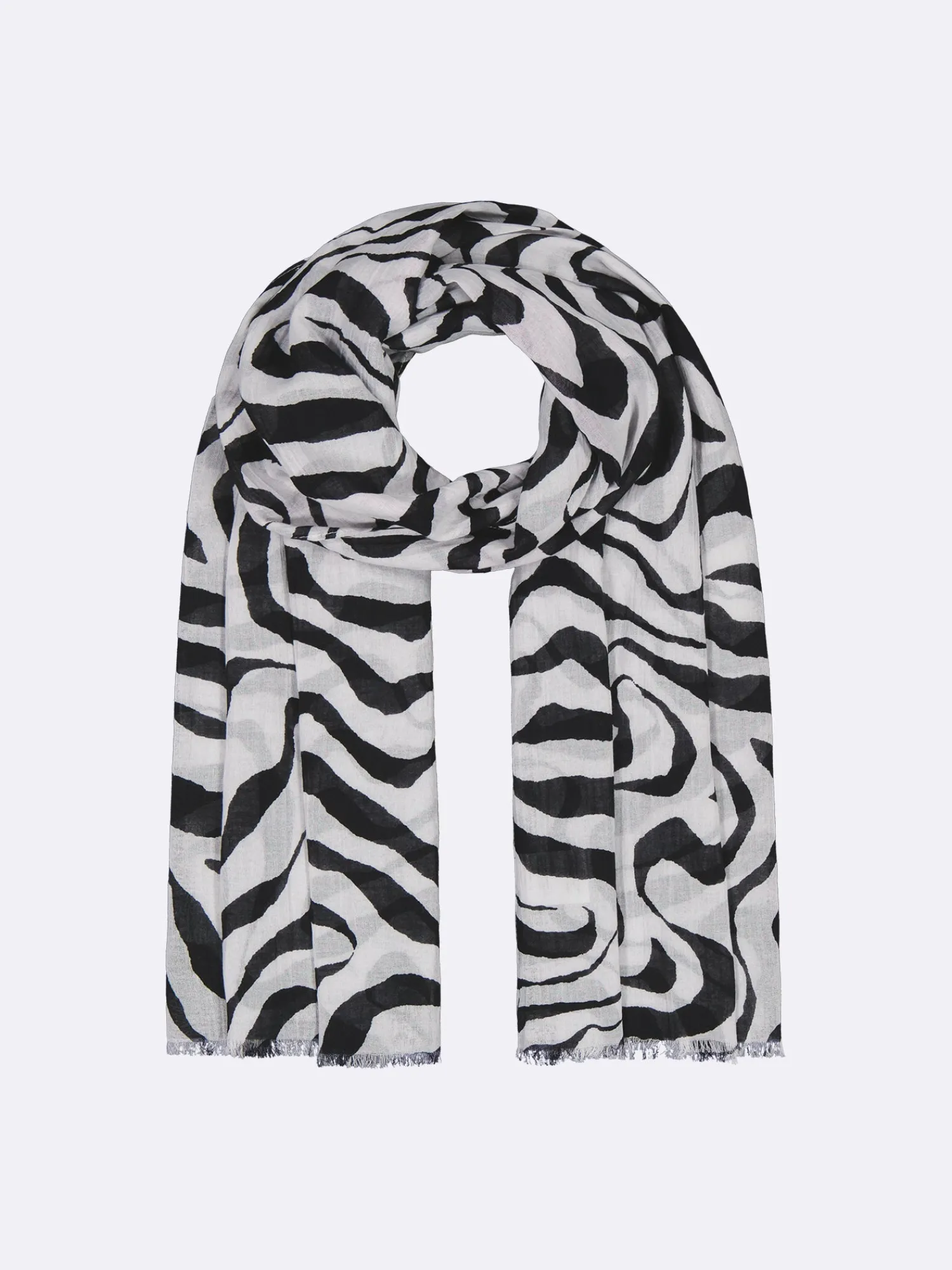 Naisten kuviollinen mustavalkoinen Savanna-huivi. Kevyt huivi on ihana asuste kesään. Voit pukea sen monella tavalla ja se on luottoasuste niin hellepäiviin kuin viileämpiin kesäiltoihin. Huivin materiaali on ohutta ja kevyttä puuvilla-pellava -kangasta. Huivin pitkät sivut on huoliteltu kapealla päärmeellä ja päissä on lyhyet hapsut. Huivin koko on noin 70 cm x 180 cm.