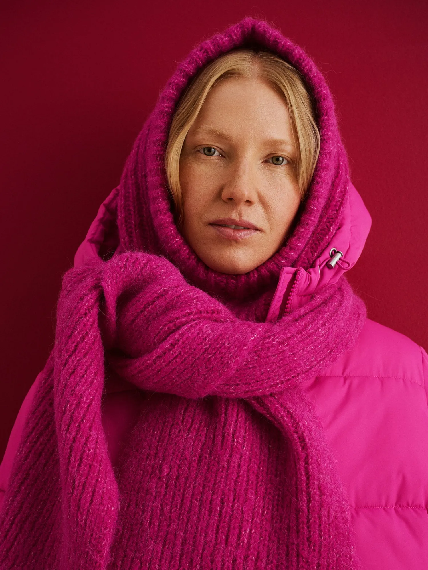 Naisten kaunis pinkki Usva-ribbineulehuivi. Muhkea huivi pitää lämpimänä viileässäkin säässä. Yhdistä Usva-huivi talveksi. Pehmeä kaulahuivi on neulottu laadukkaasta villan ja alpakan sekoitteesta. Huivin mitta on 25 cm x 170 cm. Neuleen hoito-ohjeet löydät