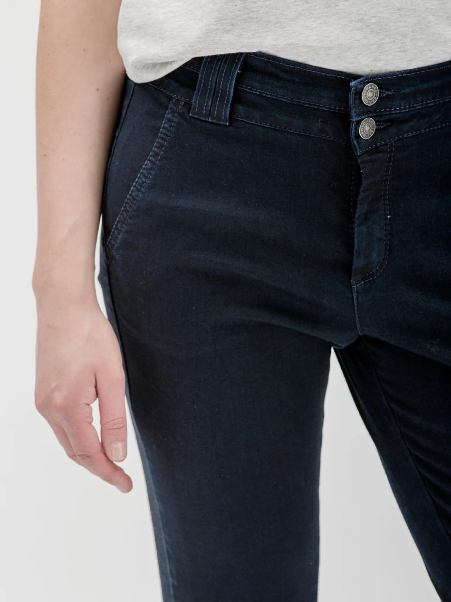 Naisten mukavat tummansiniset Kantti-farkut. Suoralinjaisissa housuissa on leveämpi tupla vyötärökaitale sekä vyölenkit. Edessä on taskut sekä takana valetaskulistat ilmettä antamassa. Tikkaukset sävysävyyn. Materiaali on mattapintaista, joustavaa ja miellyttävän tuntuista puuvilla-sekoitetta. Lahkeen sisäpituus koossa 38 on noin 81 cm.