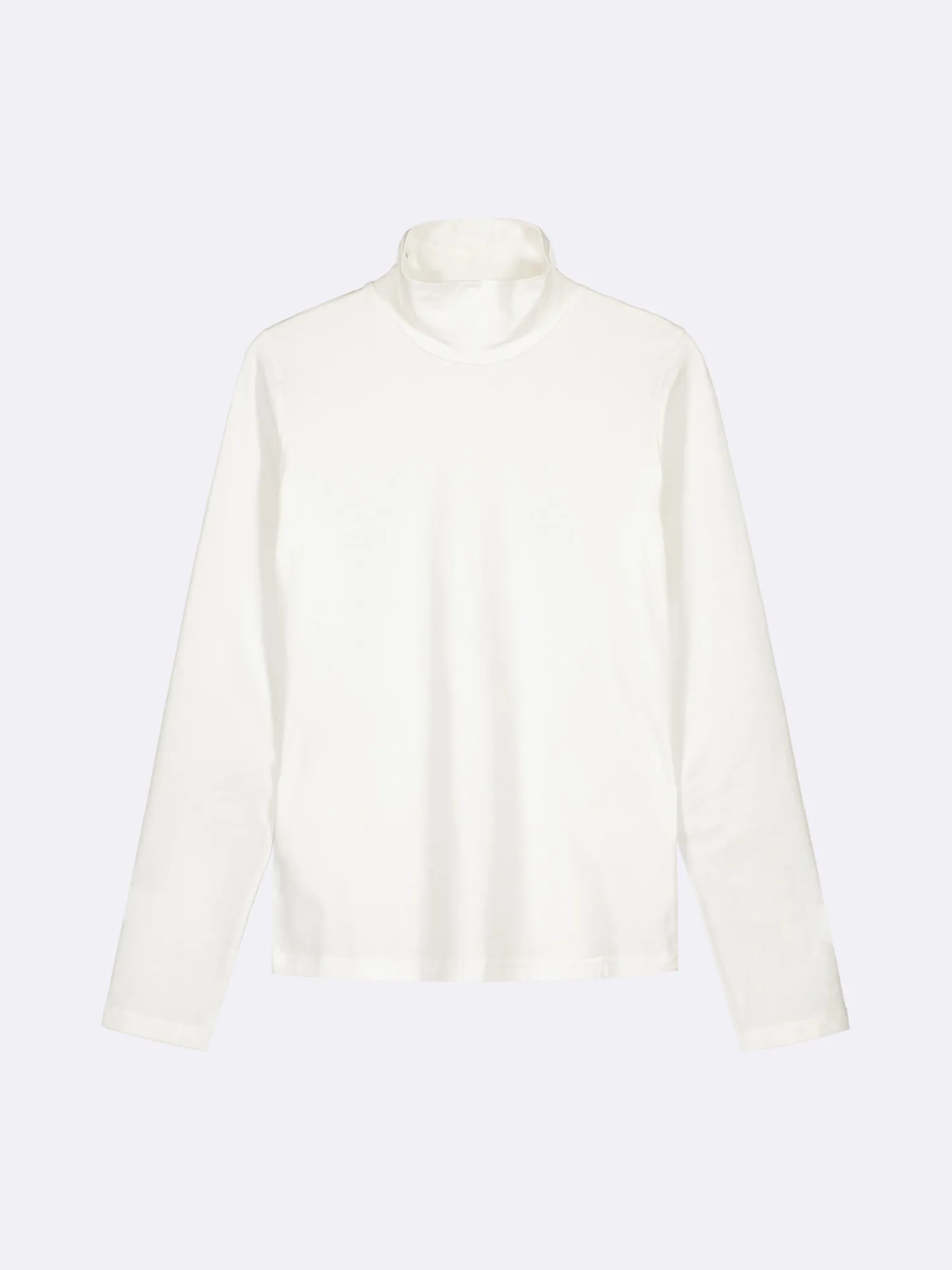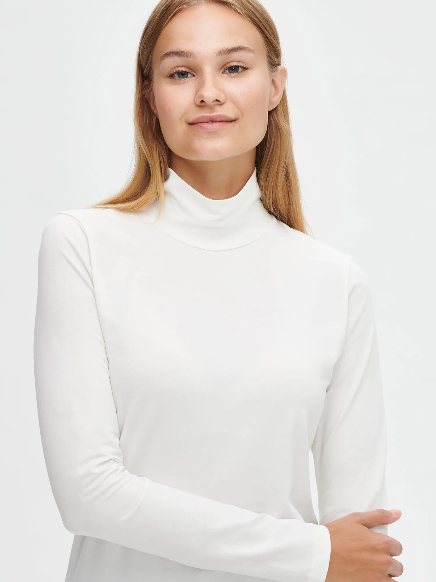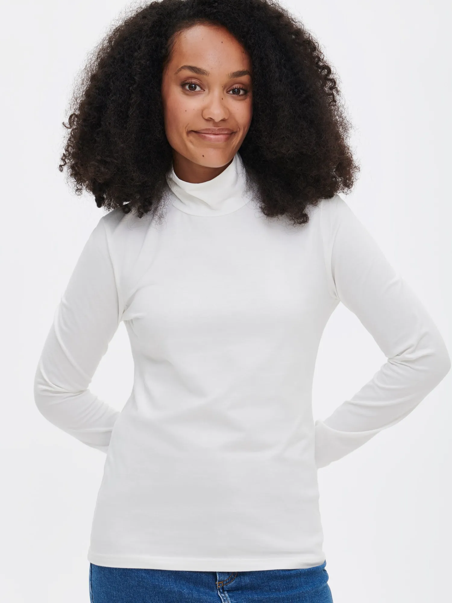 Naisten luonnonvalkoinen Mari-poolopusero. Istuva poolo on ajaton klassikko, johon haluaa pukeutua vuodesta toiseen. Monikäyttöisen poolon voi pukea myös lyhythihaisen mekon tai paidan alle. Istuvassa matalakauluksellisessa poolopuserossa on täyspitkät hihat. Puseron pituus koossa M on noin 65 cm. Poolon materiaali on miellyttävää ja joustavaa luomupuuvilla-elastaani-neulosta.