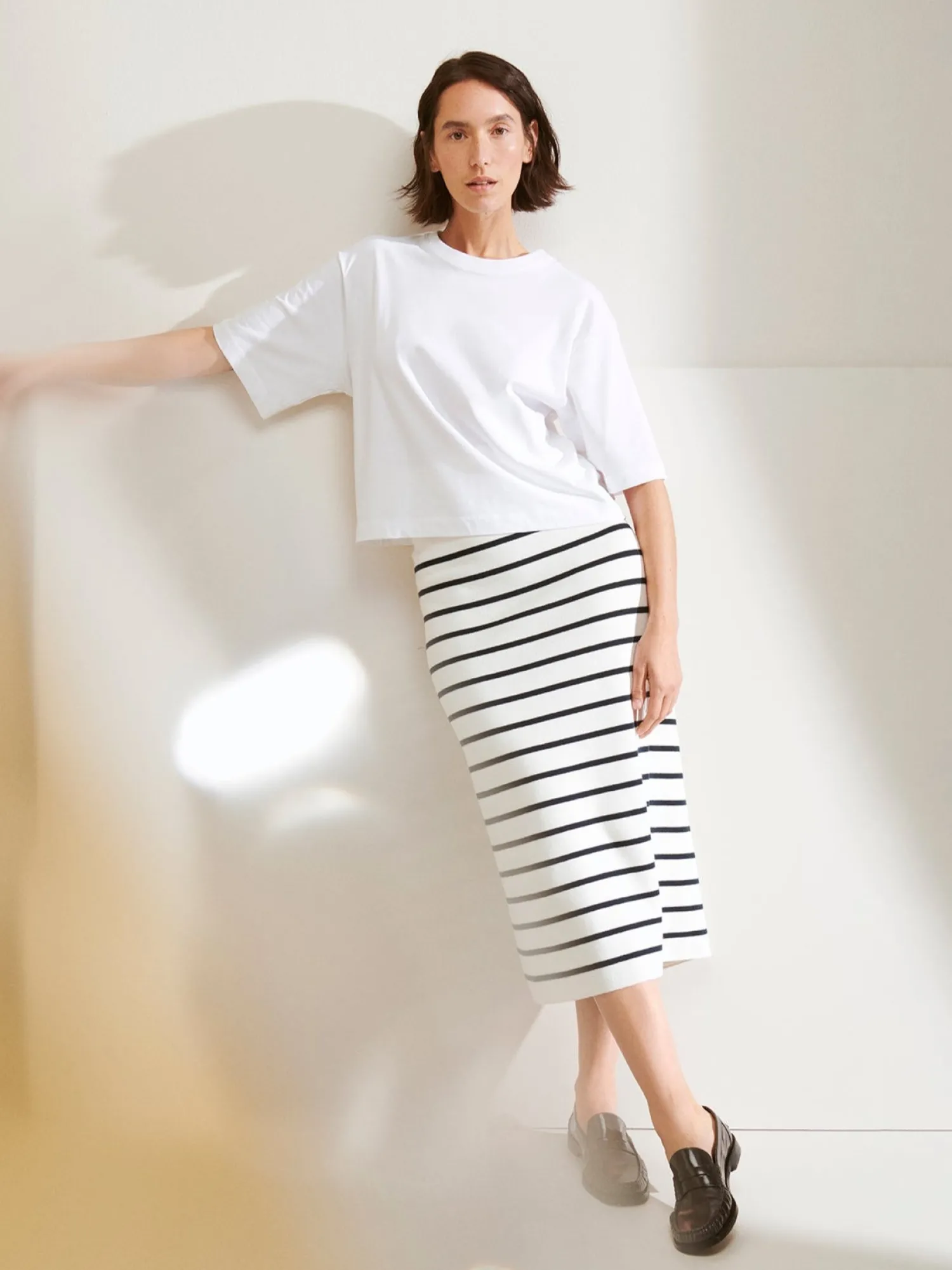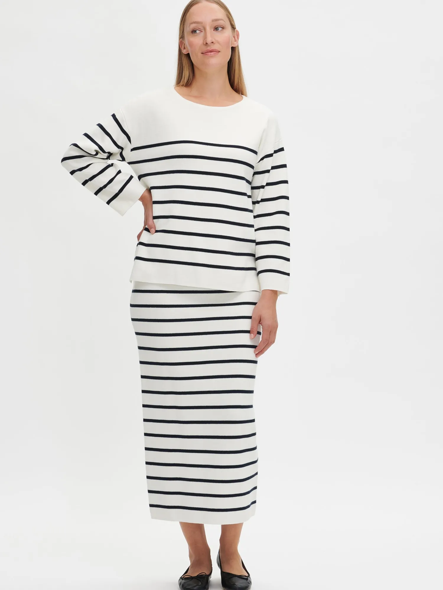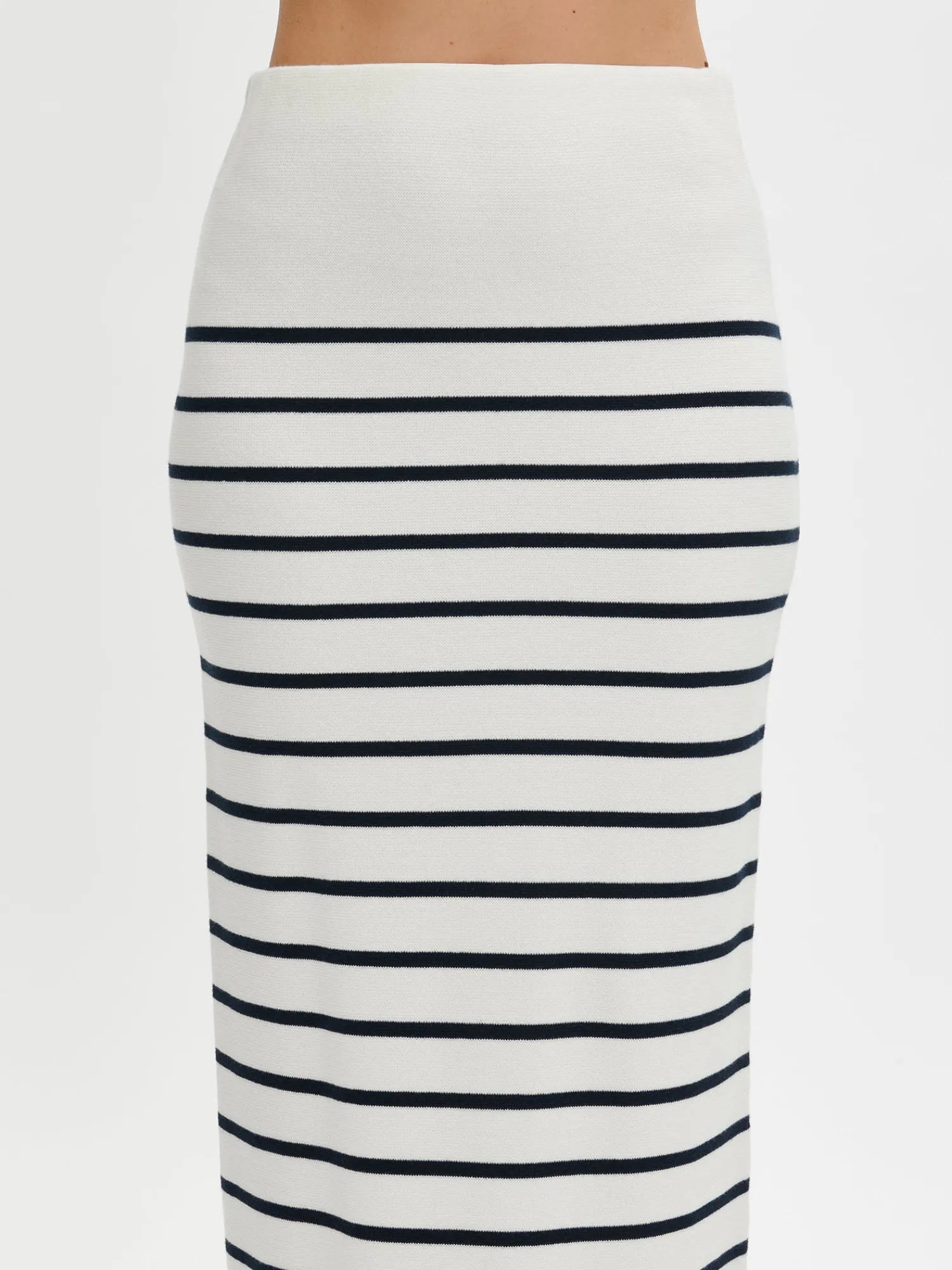 Naisten raidallinen luonnonvalkoinen-musta Milano-hame. Ajaton ja monipuolinen neulehame ihastuttaa ympäri vuoden. Tyylikkäässä ja mukavassa vuorittomassa hameessa on joustava vyötärö. Hameen pituus koossa M on noin 85 cm. Hame on milano-neulosta, joka pysyy ryhdikkäänä käytössä. Tuote on valmistettu vastuullisesti tuotetusta laadukkaasta puuvillasta.